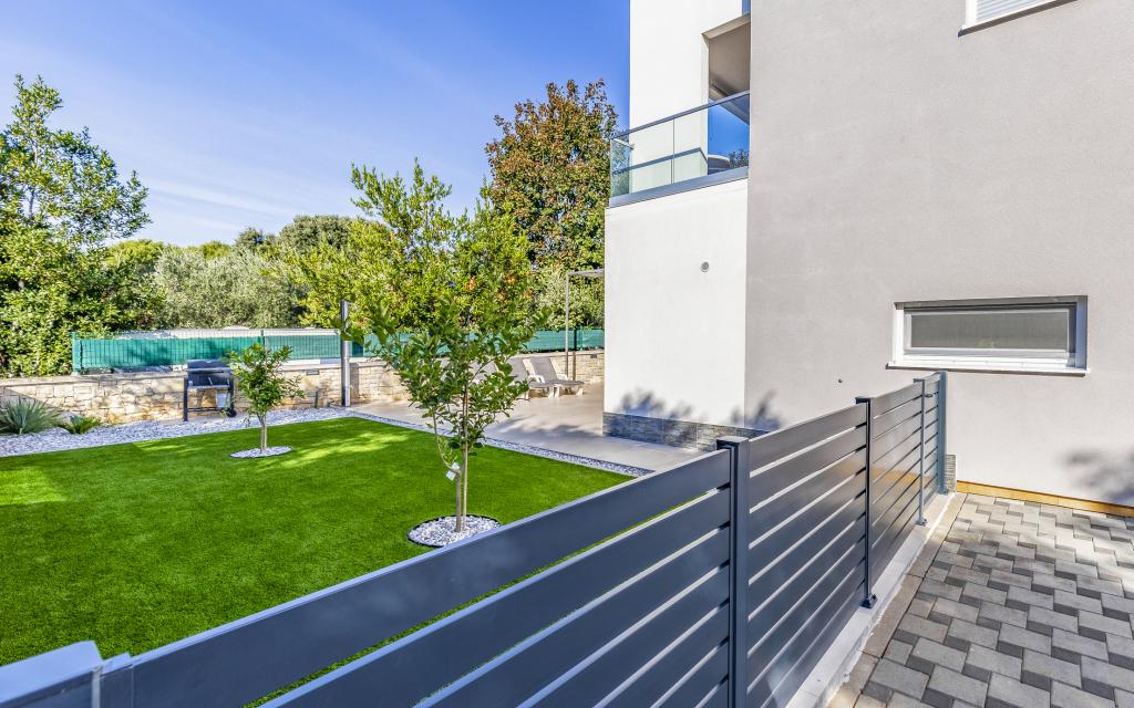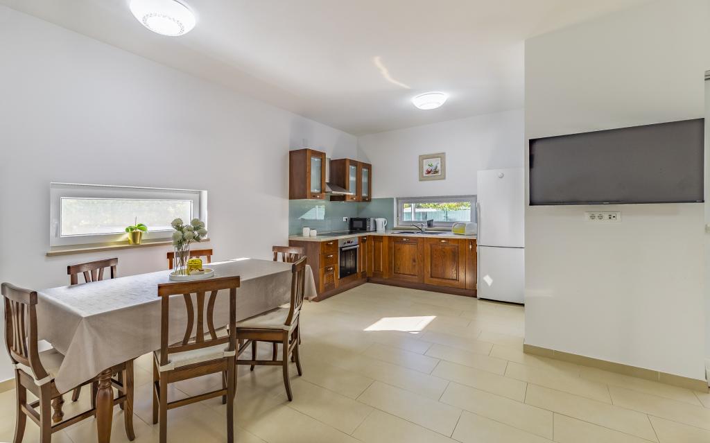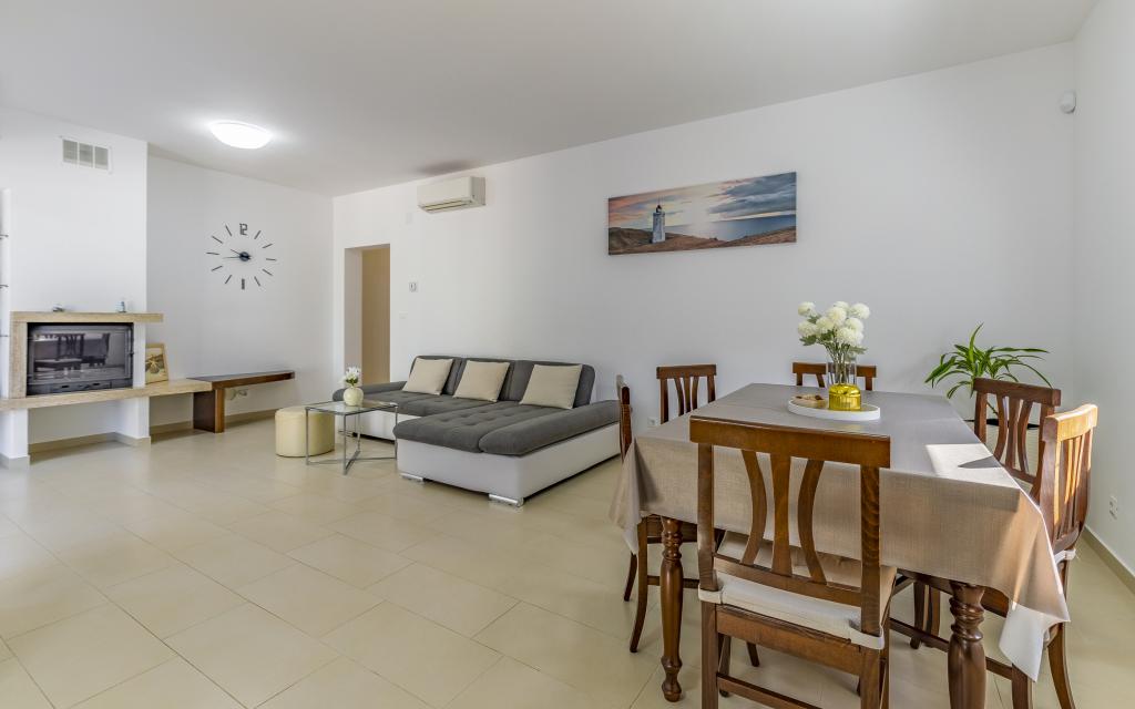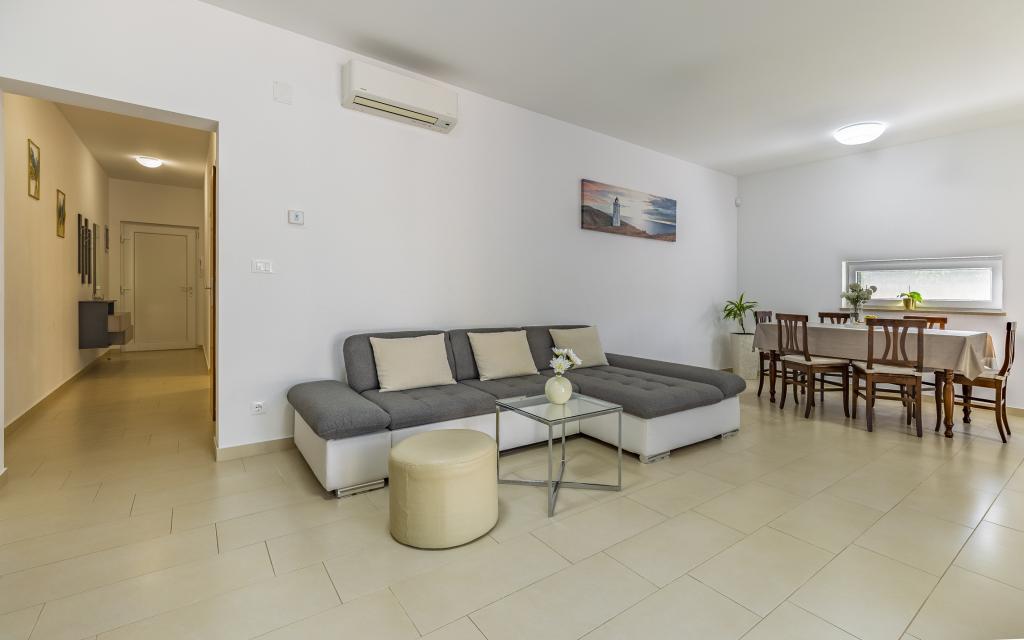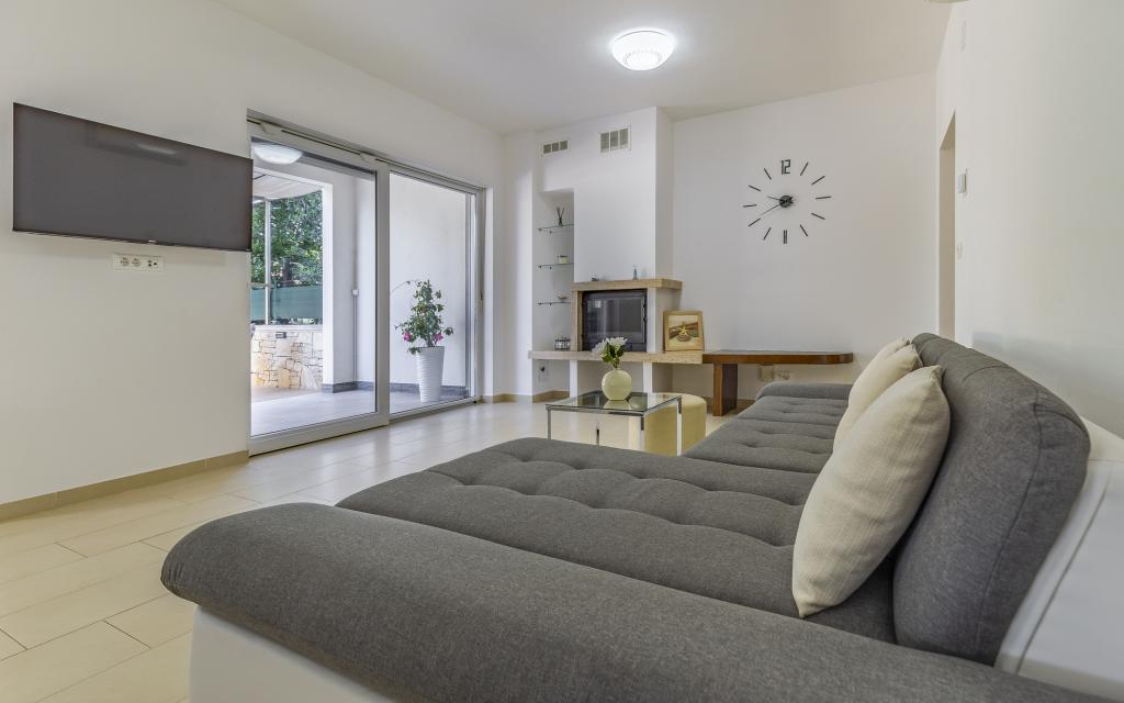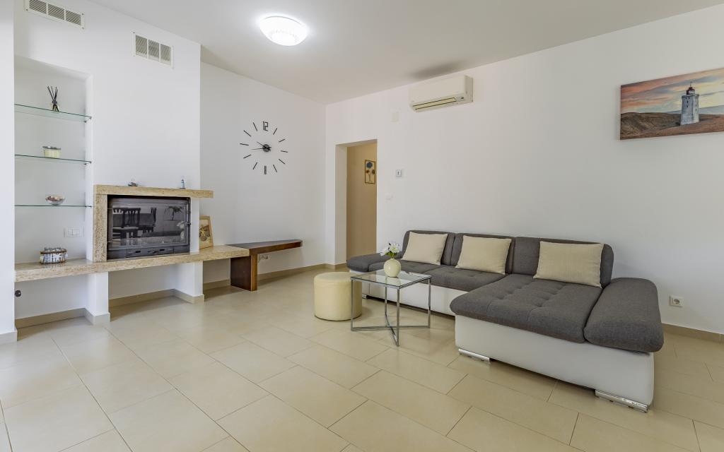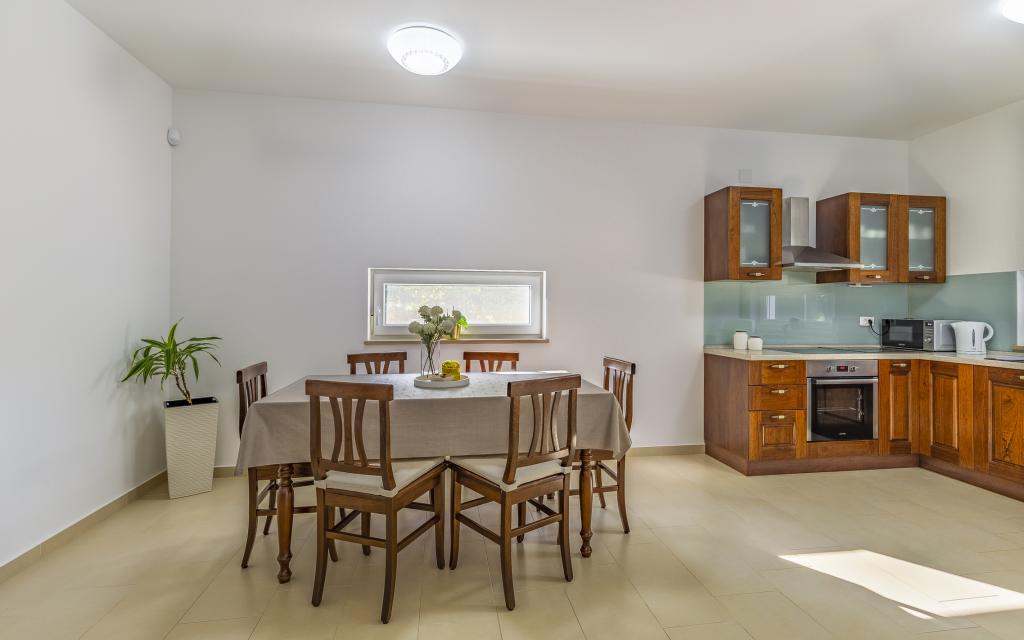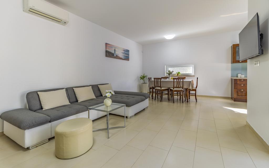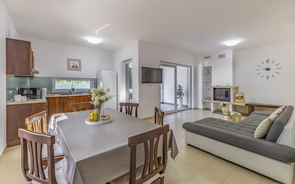 Plně vybavený apartmán (80 m²) ve výborné lokalitě v klidné části Banjolu. Nemovitost se nachází 200 m od moře a 300 m od nejkrásnějších pláží v oblasti. Apartmán se nachází v přízemí bytového domu s celkem třemi apartmány a má velkou soukromou oplocenou zahradu (100 m²) se samostatným vchodem a vlastním parkovacím místem přímo vedle apartmánu a zahrady. Zahrada má velkou krytou terasu se stolem a šesti židlemi, čtyřmi lehátky, venkovní sprchou a grilem, což je hlavní prostor pro příjemné posezení a relaxaci s dostatkem soukromí, slunce, ale i stínu. Celá budova je obehnána kamennou zdí a u vchodu jsou posuvné dveře. Apartmán se skládá ze 2 ložnic s manželskými postelemi, 2 koupelen s toaletou a sprchou, prostorného obývacího pokoje s rozkládací pohovkou, jídelny a kuchyně. Apartmán je klimatizovaný a v zimě je vytápěn podlahovým topením a má vnitřní krb, takže je vhodný i pro pobyt v chladnějších podzimních a zimních měsících.