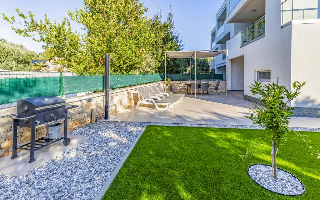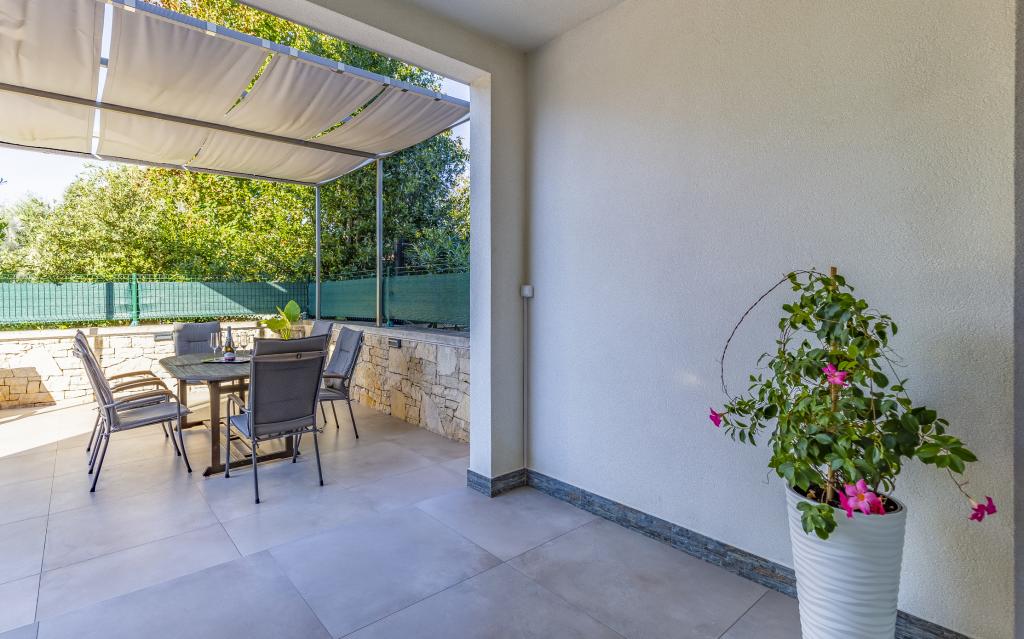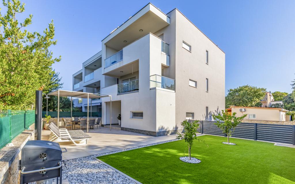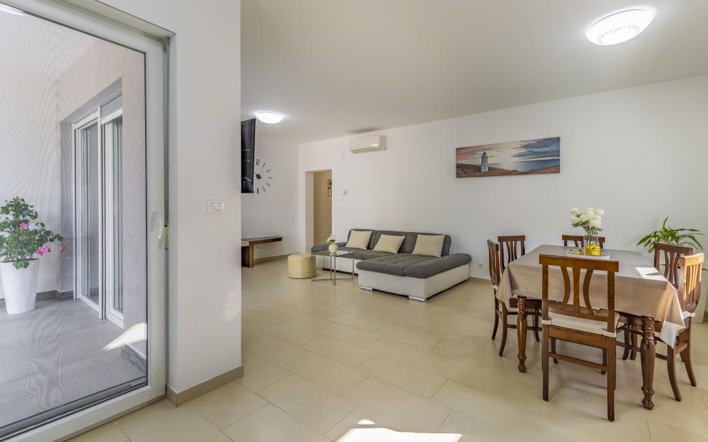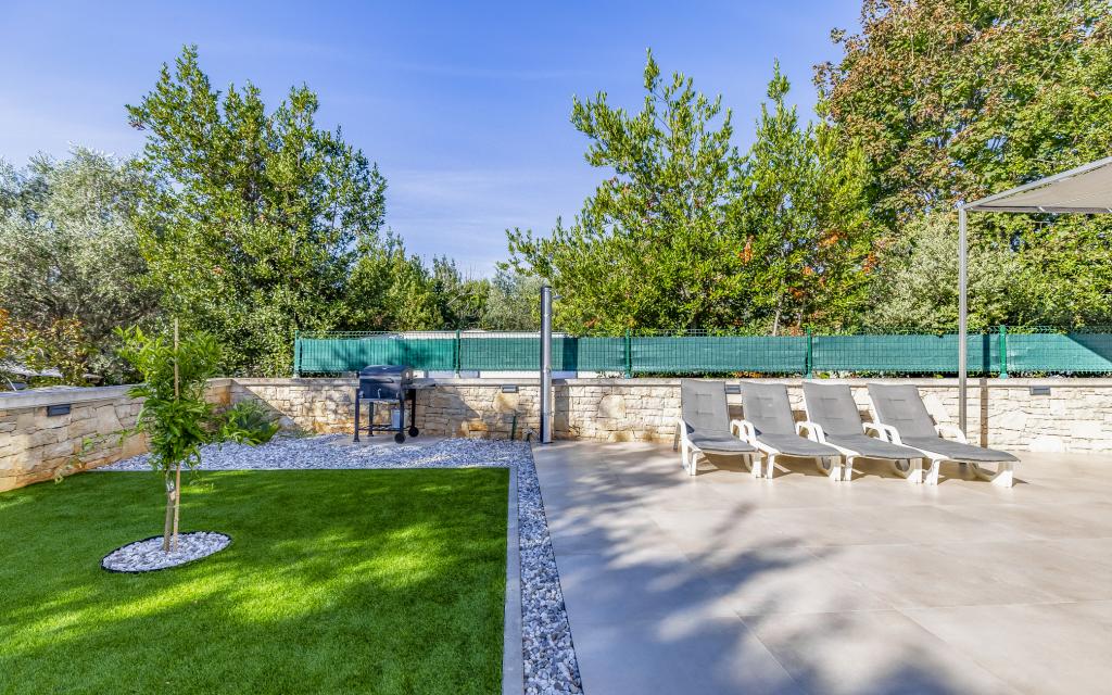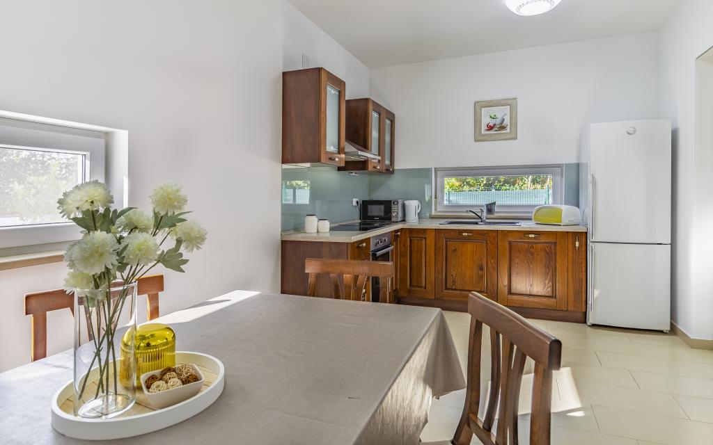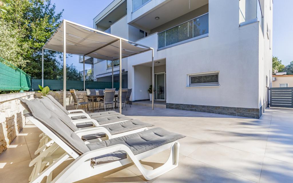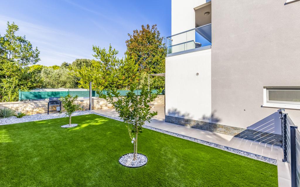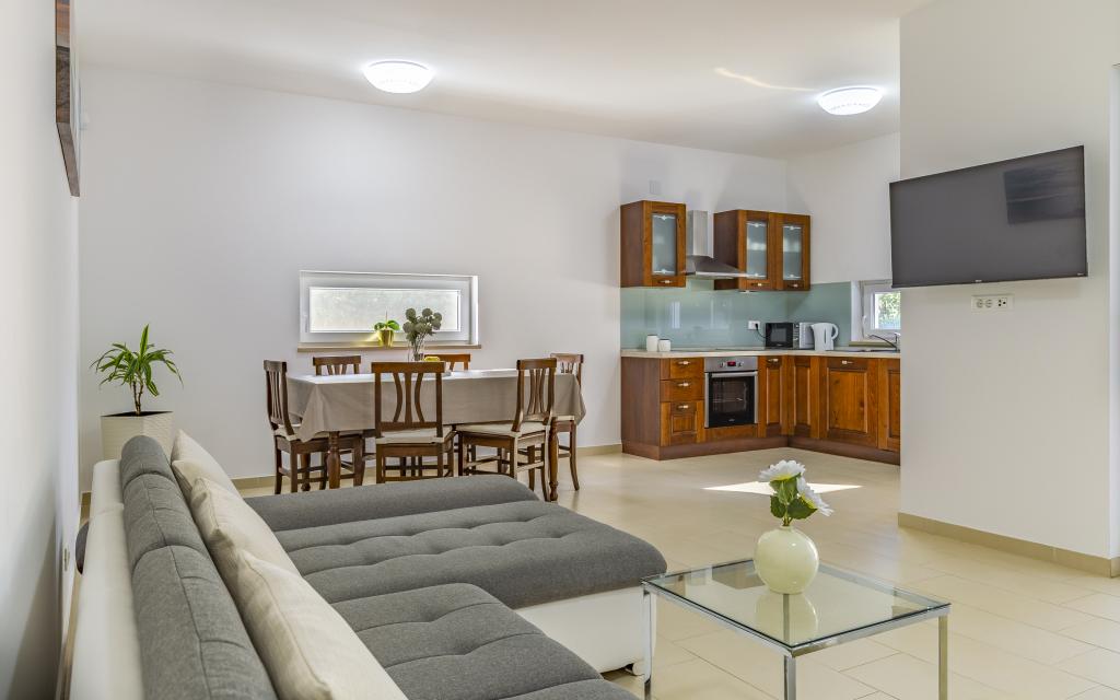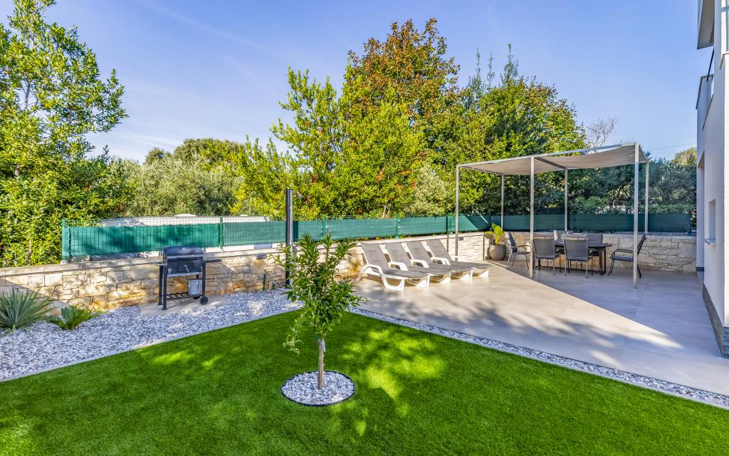 Plně vybavený apartmán (80 m²) ve výborné lokalitě v klidné části Banjolu. Nemovitost se nachází 200 m od moře a 300 m od nejkrásnějších pláží v oblasti. Apartmán se nachází v přízemí bytového domu s celkem třemi apartmány a má velkou soukromou oplocenou zahradu (100 m²) se samostatným vchodem a vlastním parkovacím místem přímo vedle apartmánu a zahrady. Zahrada má velkou krytou terasu se stolem a šesti židlemi, čtyřmi lehátky, venkovní sprchou a grilem, což je hlavní prostor pro příjemné posezení a relaxaci s dostatkem soukromí, slunce, ale i stínu. Celá budova je obehnána kamennou zdí a u vchodu jsou posuvné dveře. Apartmán se skládá ze 2 ložnic s manželskými postelemi, 2 koupelen s toaletou a sprchou, prostorného obývacího pokoje s rozkládací pohovkou, jídelny a kuchyně. Apartmán je klimatizovaný a v zimě je vytápěn podlahovým topením a má vnitřní krb, takže je vhodný i pro pobyt v chladnějších podzimních a zimních měsících.