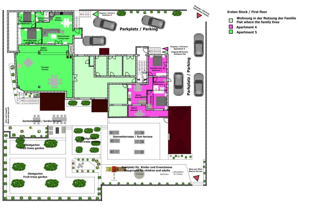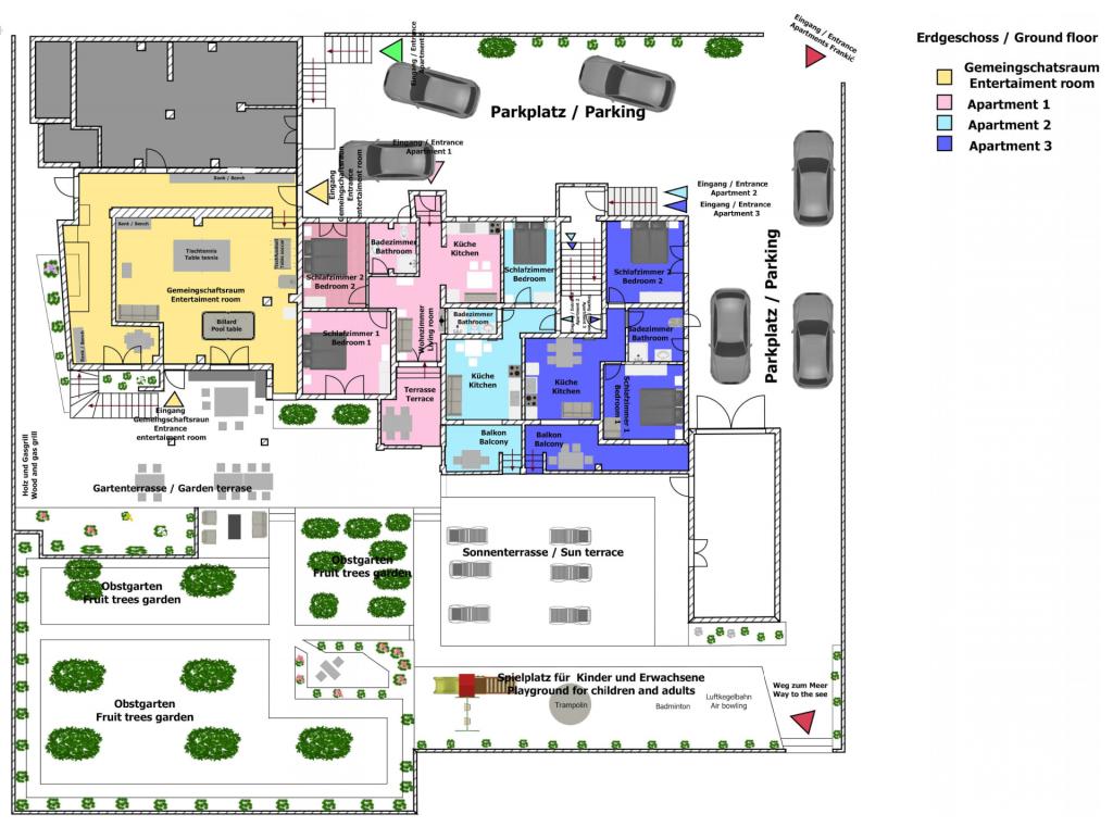 Zahradní terasa s grilem na dřevo a plyn, zahradní nábytek, slunečníky, venkovní posezení čeká jen na Vás! Není nic lepšího, než si užívat venku v dobrém jídle a příjemné společnosti. Relaxujte a užívejte si slunce na lehátkách na sluneční terase. Pokud chcete nějakou aktivitu, v zahradě je hřiště pro děti i dospělé. K dispozici je trampolína, badminton a air bowling, pro vaše nejmenší houpačky, skluzavka a písek pro děti. Ve společenské místnosti je k dispozici stolní tenis, kulečník, elektronické šipky, stolní fotbal a satelitní TV. 30 metrů od domu je malá pláž a bezplatné kotviště lodí na molu. Pro loď používáme 5 kotvišť. Loď musíte oznámit při rezervaci. Pokud přijedete s přívěsem a lodí, zaparkujte prosím nejprve loď a přívěs u jeřábu. Na úzké příjezdové cestě k našemu domu není kam odbočit. Omezení odpovědnosti: Nepřebíráme žádnou odpovědnost za připojení a jejich stav. Je vaší povinností jako vlastníka lodi řádně uvázat loď.