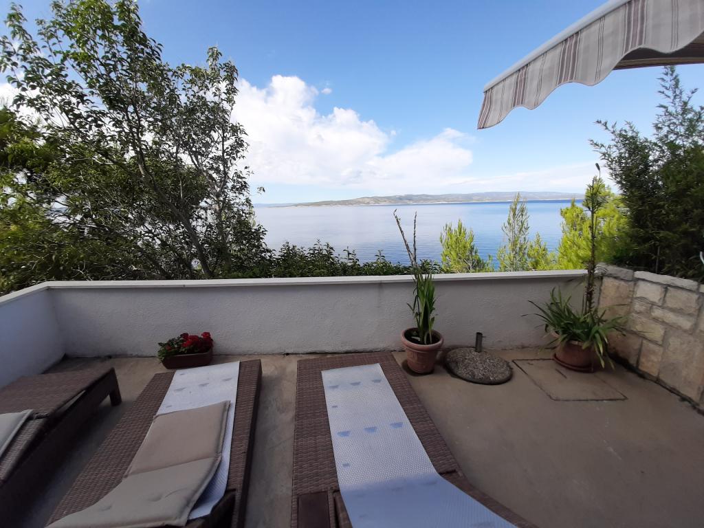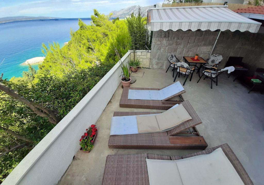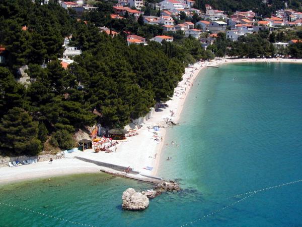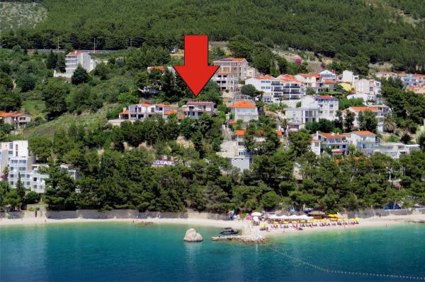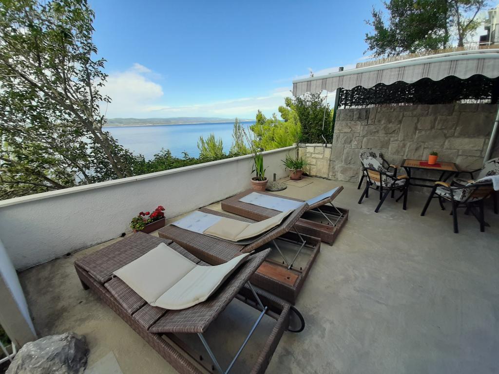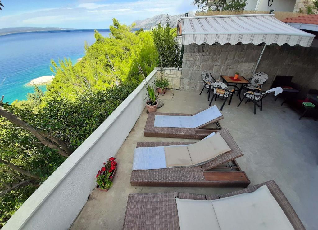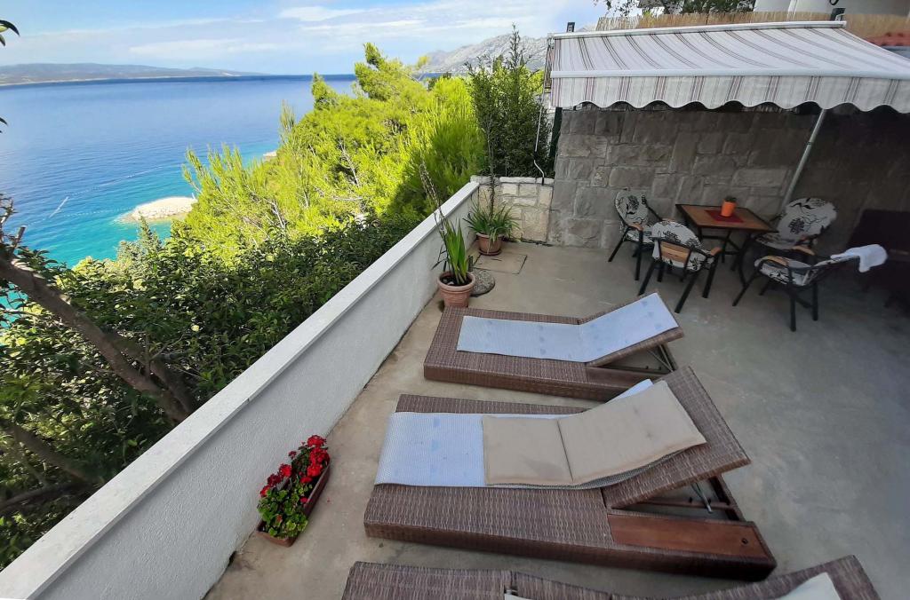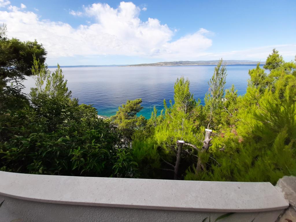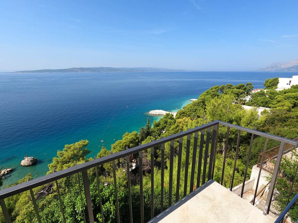 Nově zrekonstruovaný a plně vybavený byt v klidné oblasti mezi Baškou Vodou a Brela, která se nachází v první řadě u moře, nad krásnou pláží. Objekt se nachází 10 minut chůze (cca 500 m) od centra obou míst. Velká terasa s baldachýnem a výhledem na moře, 2 dvoulůžkové ložnice, dvě koupelny a kuchyň s přístupem na terasu. Všechno nové. Byt se nachází v samostatném patře se samostatným vchodem, velká zahrada oddělená od všech sousedů. Soukromé parkování ve stínu těsně nad domem.