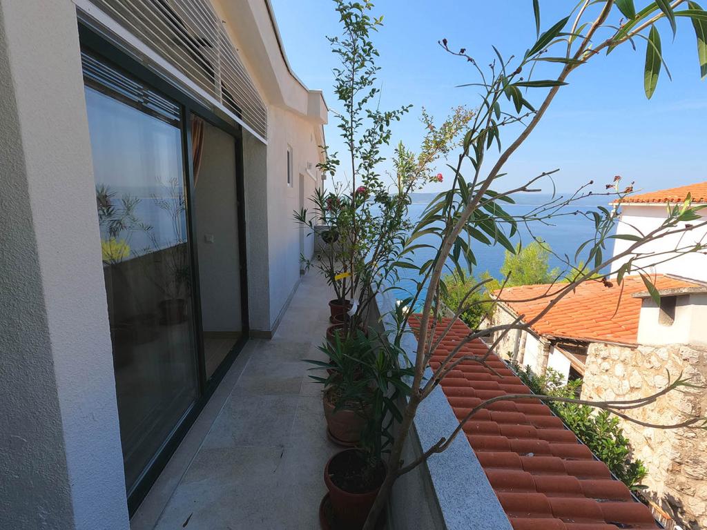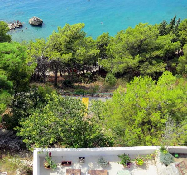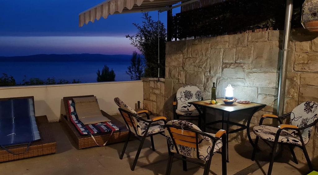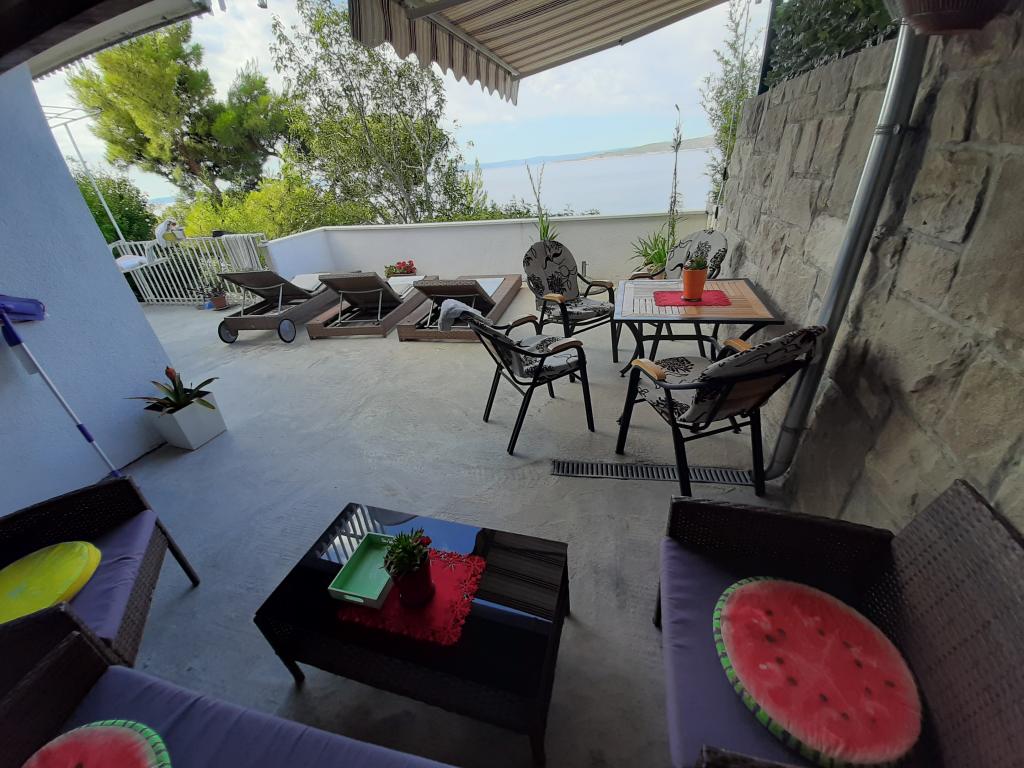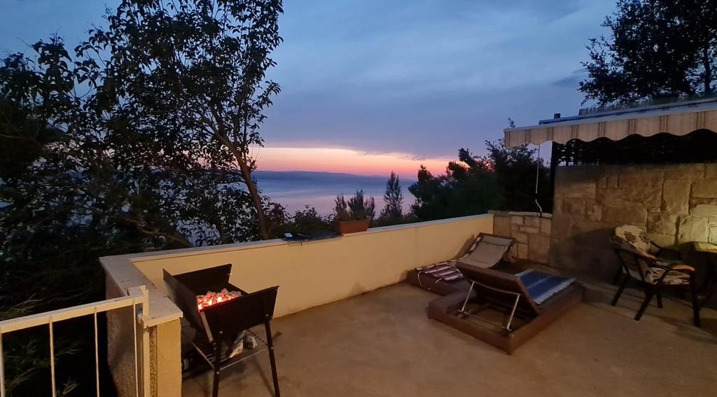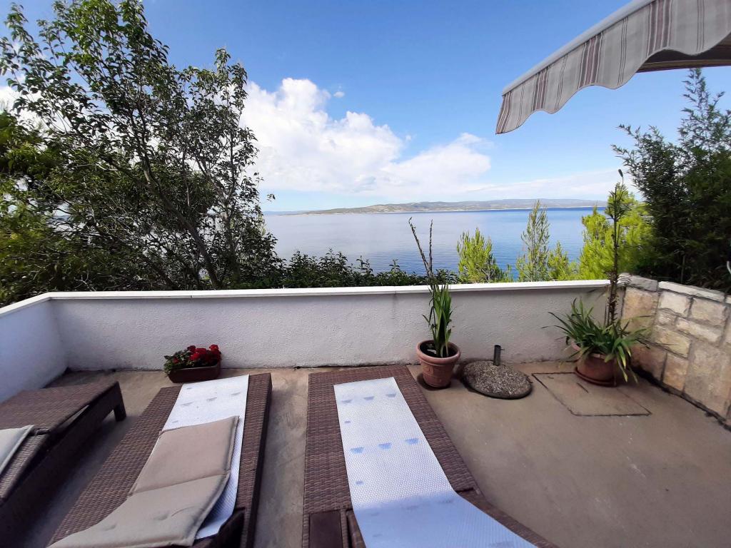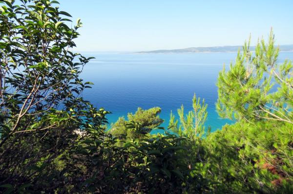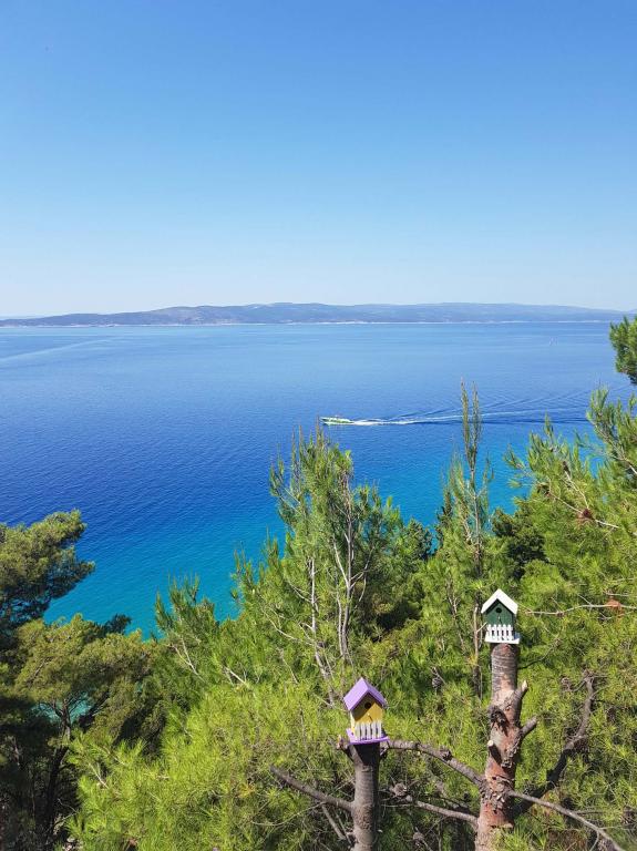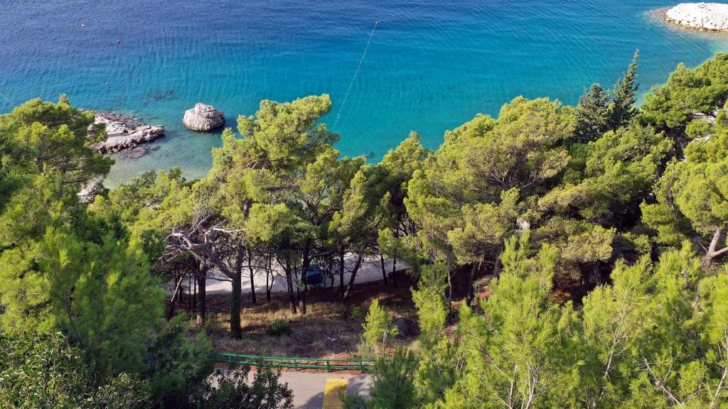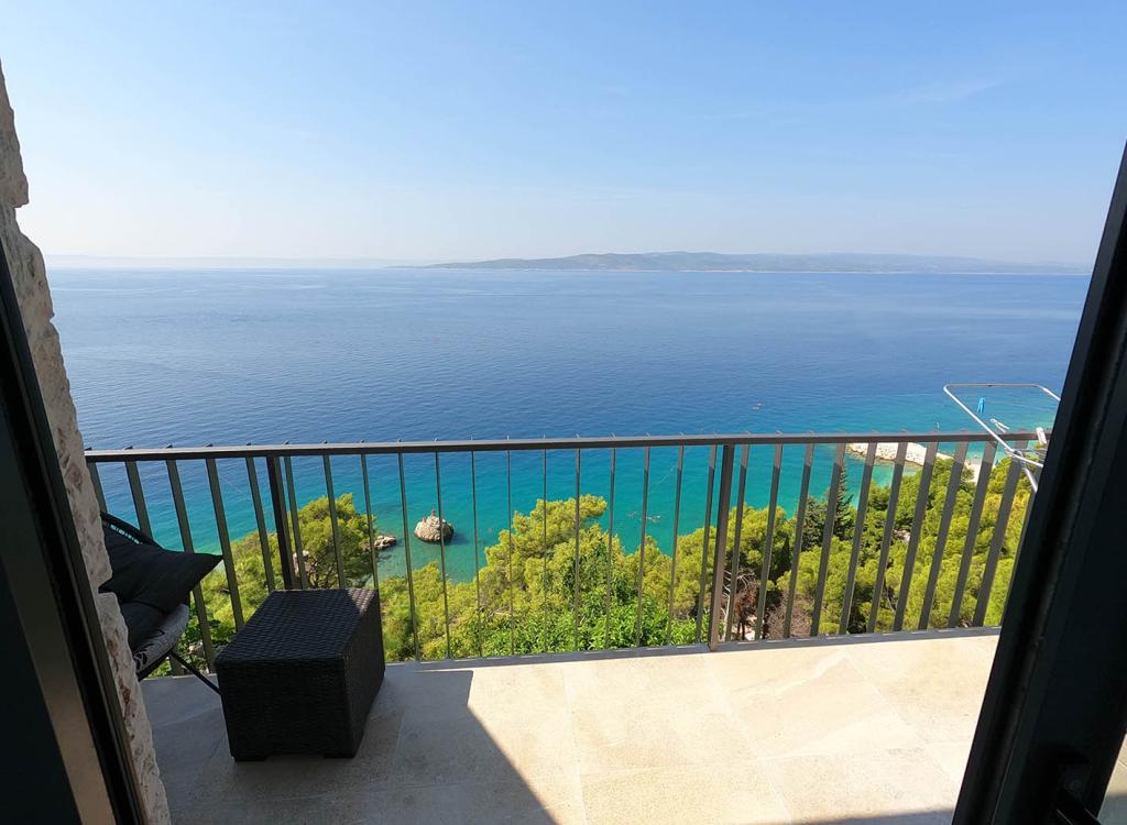 Nově zrekonstruovaný a plně vybavený byt v klidné oblasti mezi Baškou Vodou a Brela, která se nachází v první řadě u moře, nad krásnou pláží. Objekt se nachází 10 minut chůze (cca 500 m) od centra obou míst. Velká terasa s baldachýnem a výhledem na moře, 2 dvoulůžkové ložnice, dvě koupelny a kuchyň s přístupem na terasu. Všechno nové. Byt se nachází v samostatném patře se samostatným vchodem, velká zahrada oddělená od všech sousedů. Soukromé parkování ve stínu těsně nad domem.