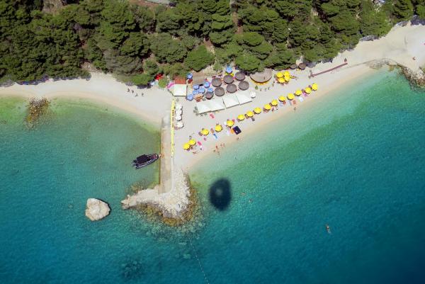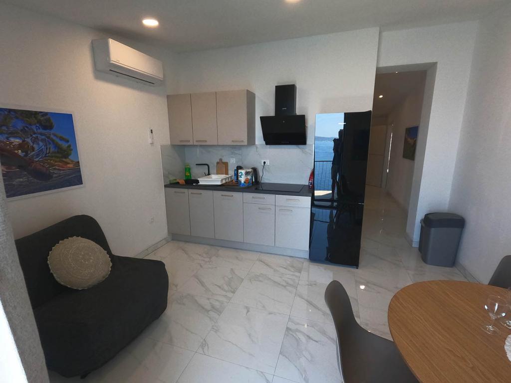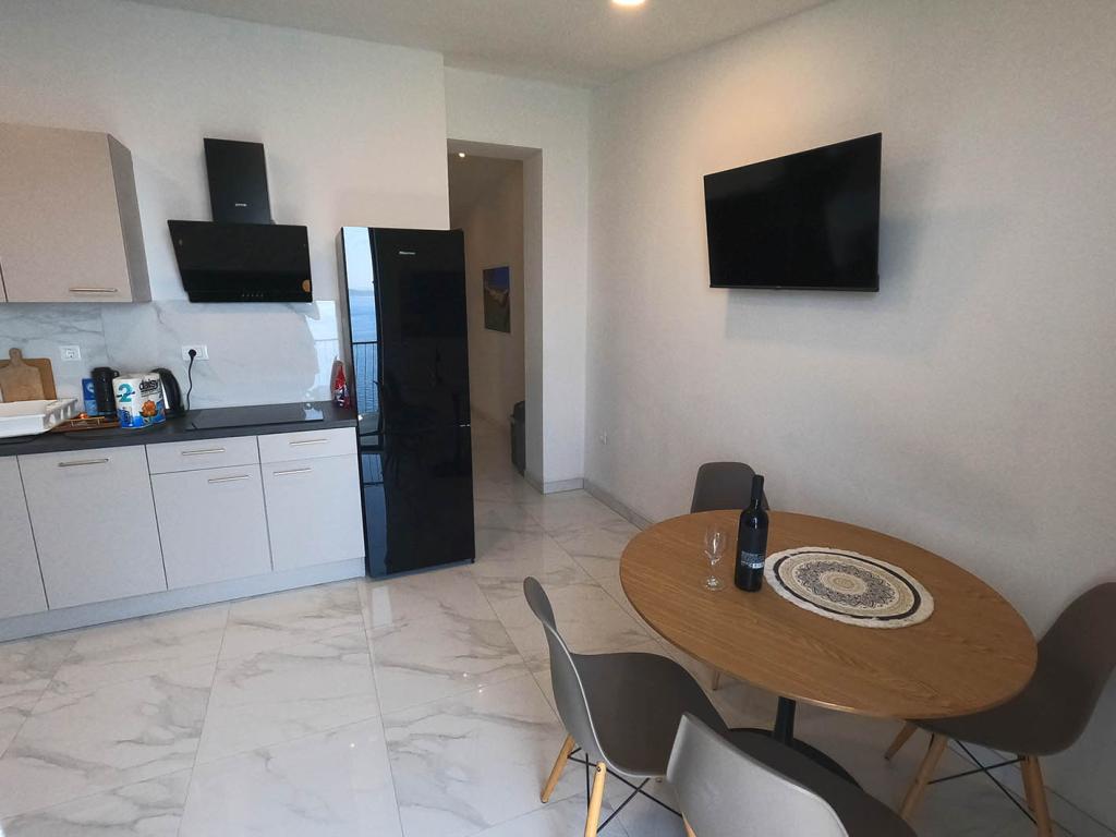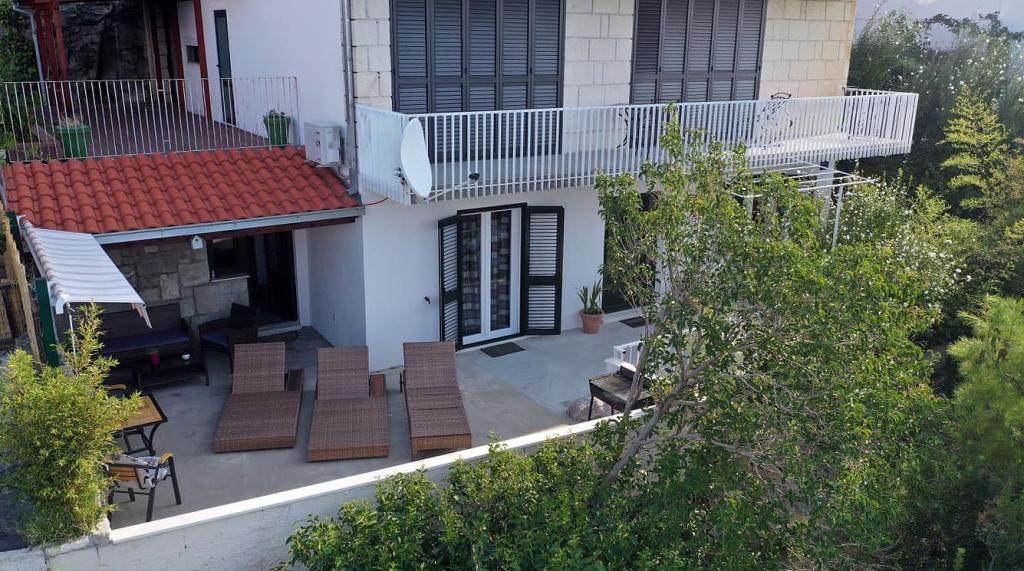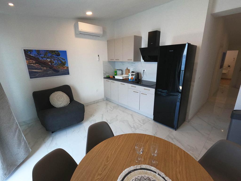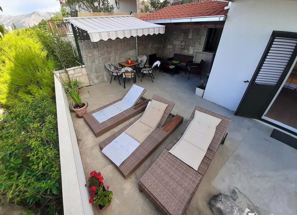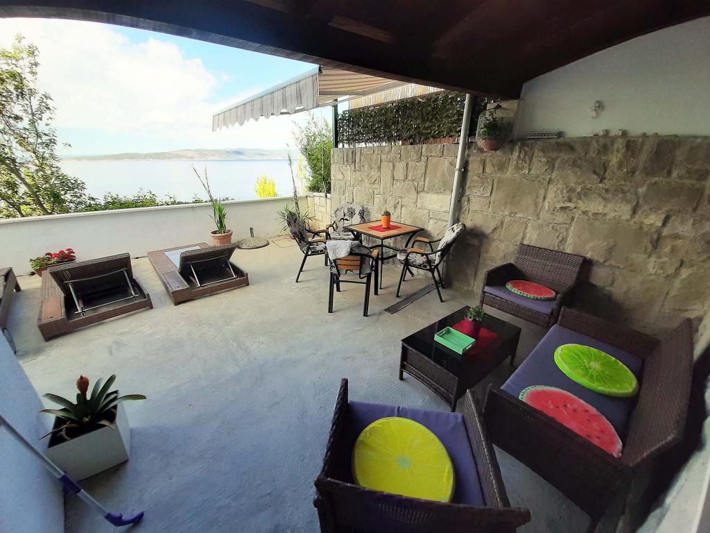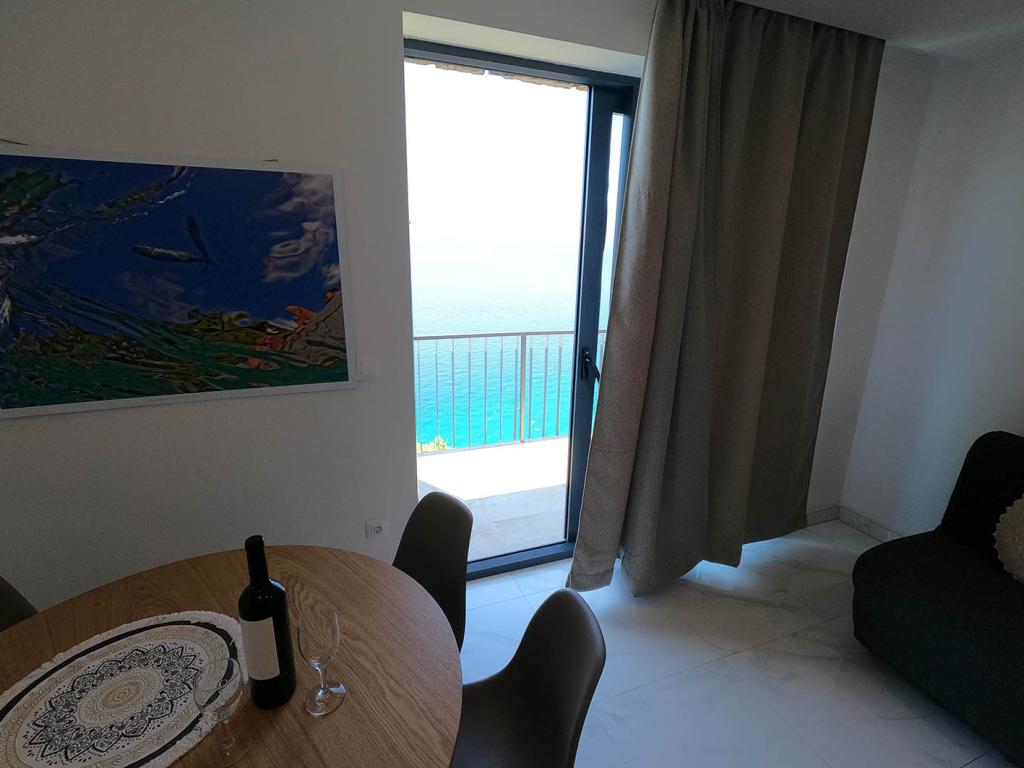 Nově zrekonstruovaný a plně vybavený byt v klidné oblasti mezi Baškou Vodou a Brela, která se nachází v první řadě u moře, nad krásnou pláží. Objekt se nachází 10 minut chůze (cca 500 m) od centra obou míst. Velká terasa s baldachýnem a výhledem na moře, 2 dvoulůžkové ložnice, dvě koupelny a kuchyň s přístupem na terasu. Všechno nové. Byt se nachází v samostatném patře se samostatným vchodem, velká zahrada oddělená od všech sousedů. Soukromé parkování ve stínu těsně nad domem.