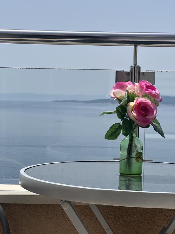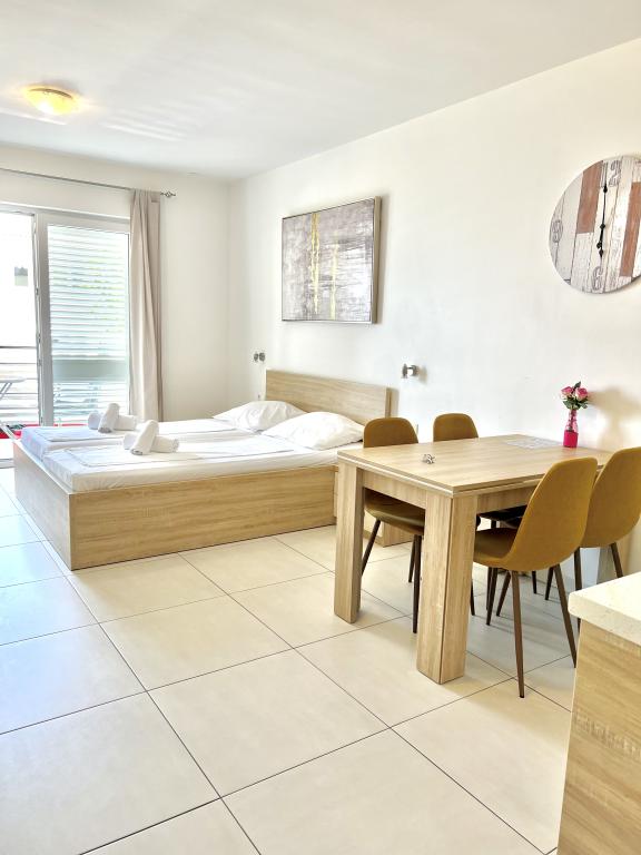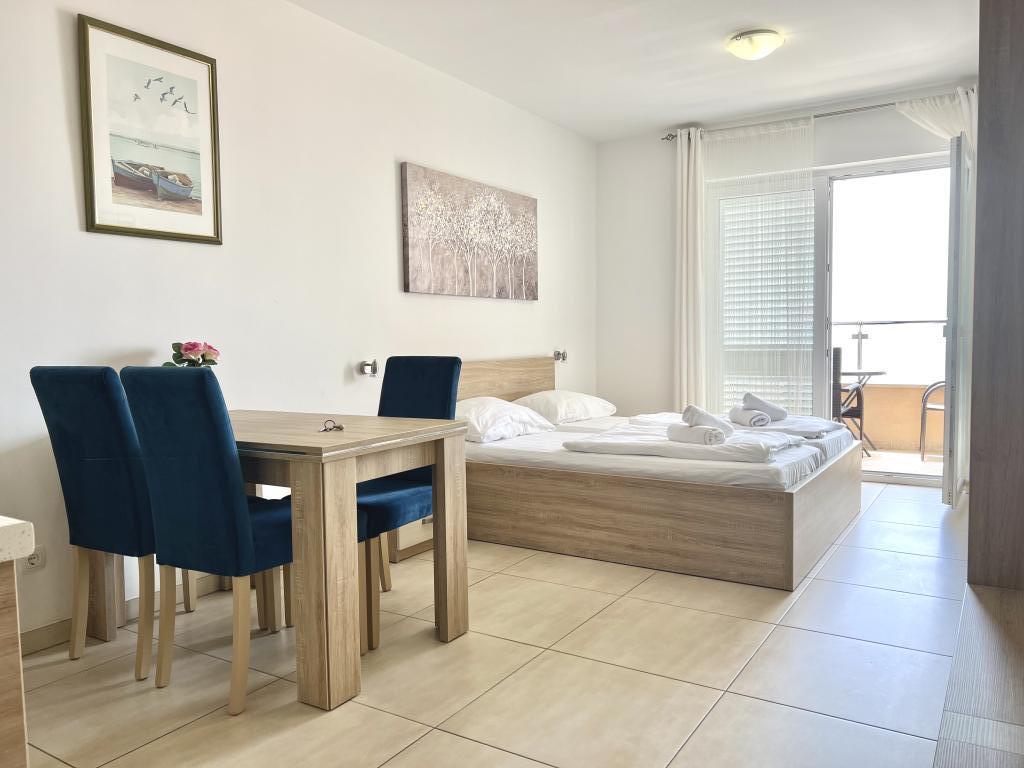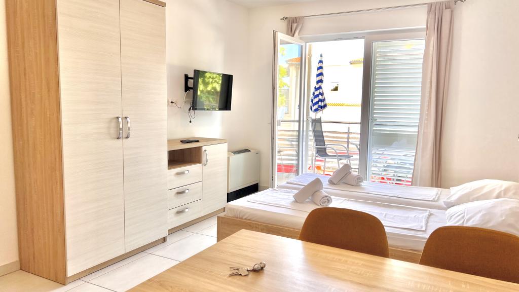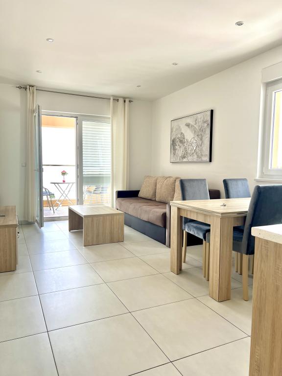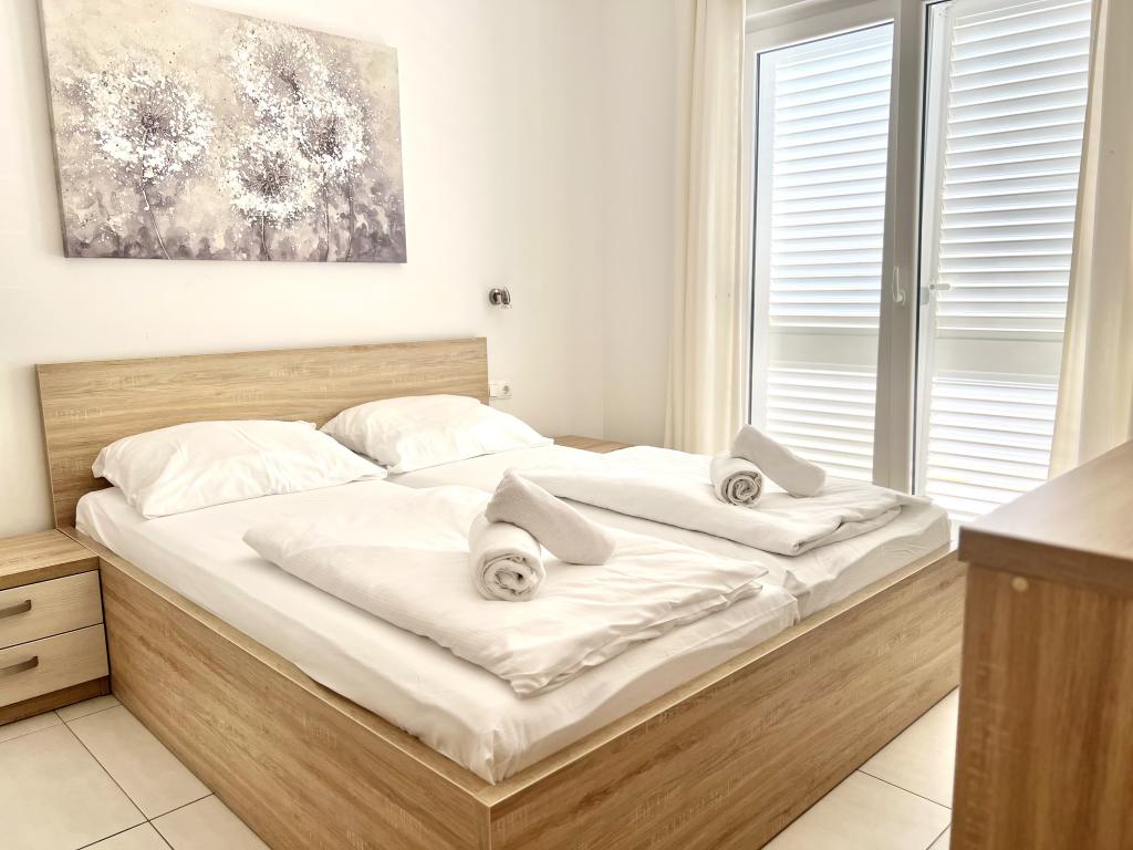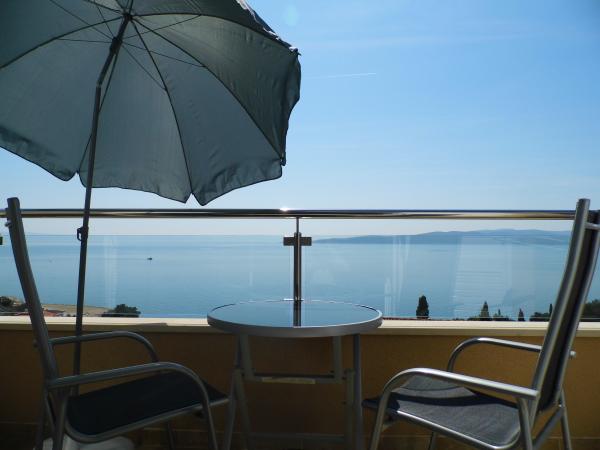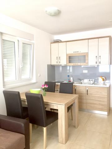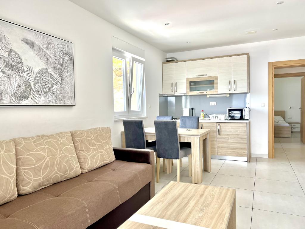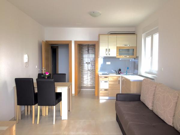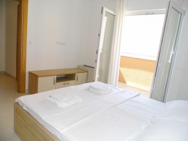 Pobytová taxa je v ceně.Nevšední výhled z balkonu je jistě uskutečněním vašich snů. Přes sklo na zábradlí balkónu si můžete vždy vychutnat výhled na Jadran. Lůžka v apartmánu mají pohodlný rozměr 1,60 m na šířku a 2,00 m na délku. O ložní prádlo a ručníky se nemusíte starat. V ceně je zahrnuta pravidelná výměna ložního prádla a ručníků. Po dovolené u moře se můžete osvěžit v koupelně. Moderní design naší koupelny a vany vám v tom pomůže. Máme již postaráno o ložní prádlo a ručníky, které běžně pravidelně a na vyžádání měníme. V kuchyni můžete ukázat, že jste kulinářská hvězda. K tomu vám nabízíme talíře, hrnce a nádobí. Rychlovarná konvice, vývrtka, sklenice, hrníčky a lednice s pro