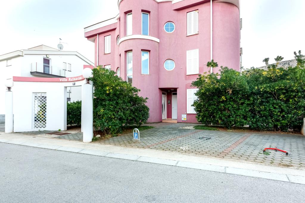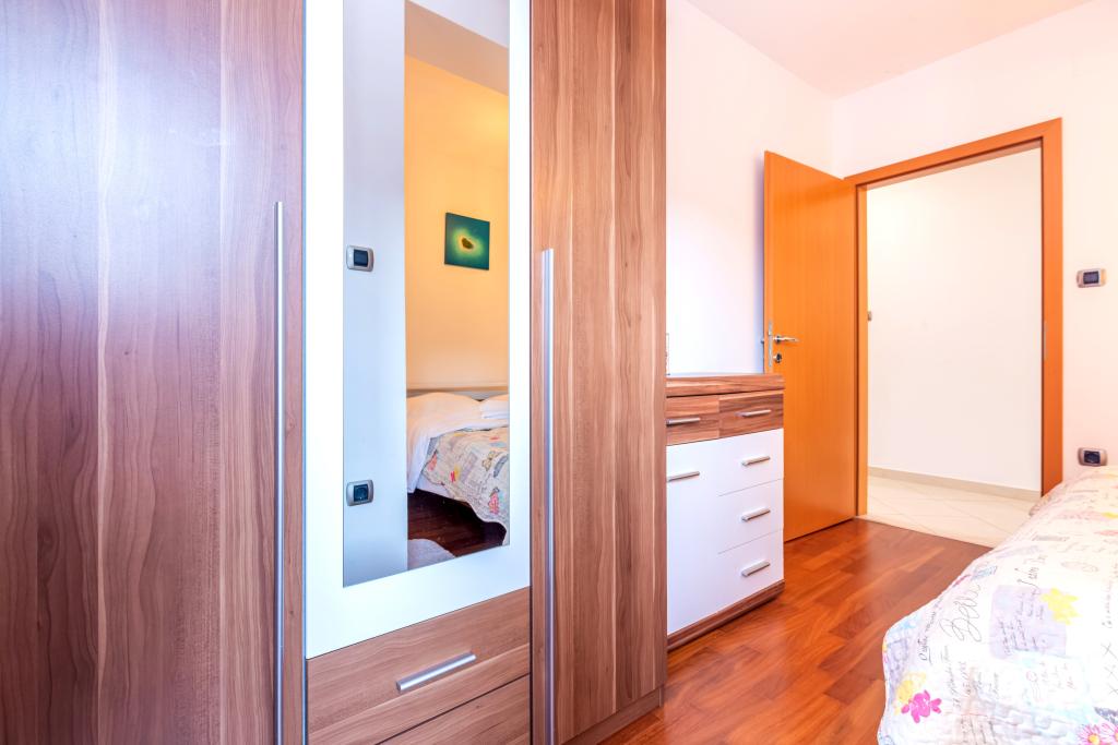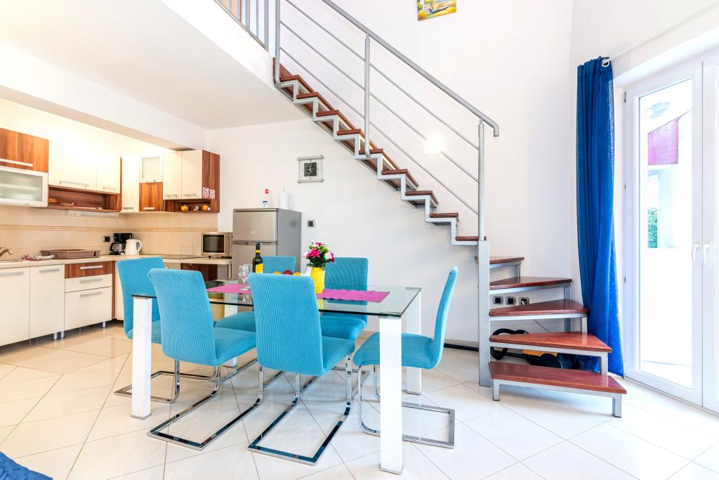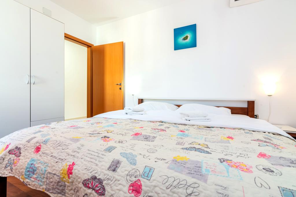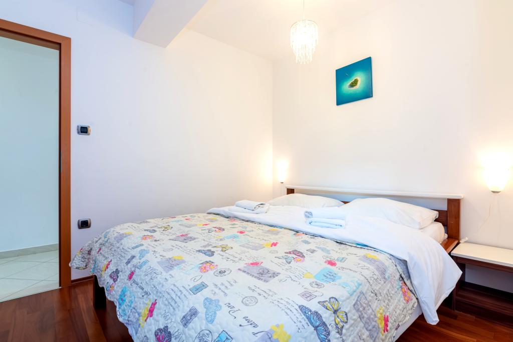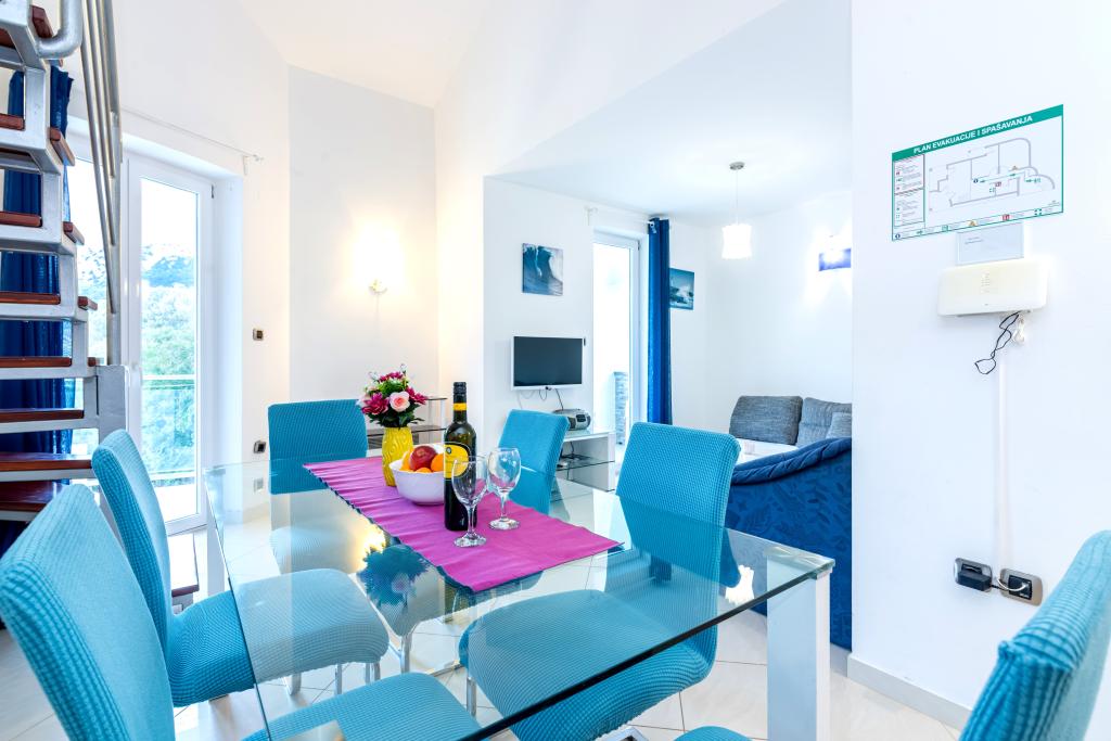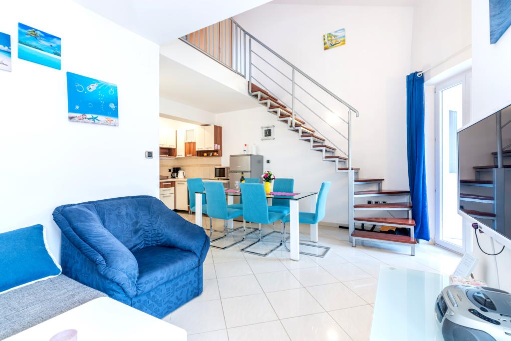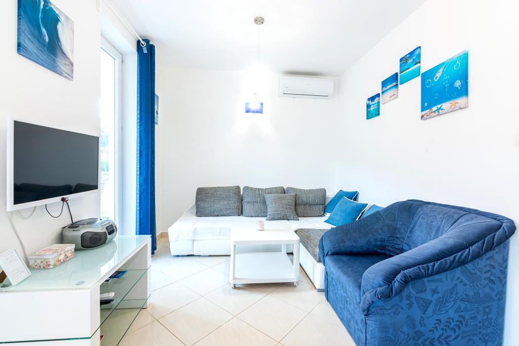 Byt se nachází ve 2. a 3. patře. Má 2 dvoulůžkové pokoje s manželskou postelí, 1 dvoulůžkový pokoj se samostatnými lůžky, obývací pokoj s pohovkou pro 2 osoby, 2 koupelny, plně vybavenou kuchyň a jídelnu. Tento apartmán se nachází přibližně 3 minuty chůze od centrální pláže. Tento moderní apartmán se nachází v klidné oblasti a je vybaven 3 klimatizacemi, bezplatným Wi-Fi internetem, SAT-TV, prostornou terasou a bezplatným parkováním před domem. V blízkosti objektu je také malý obchod a restaurace.