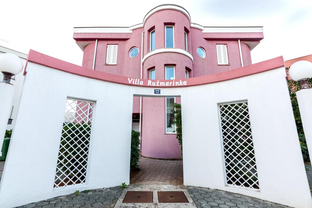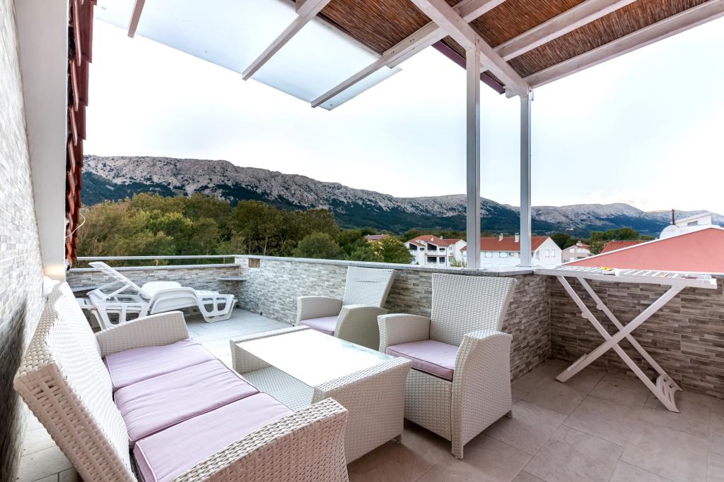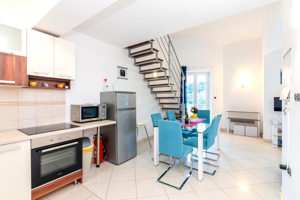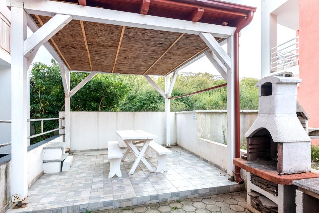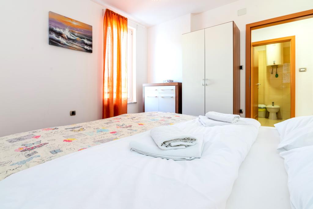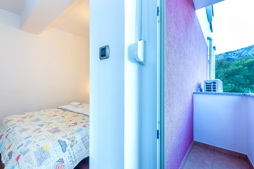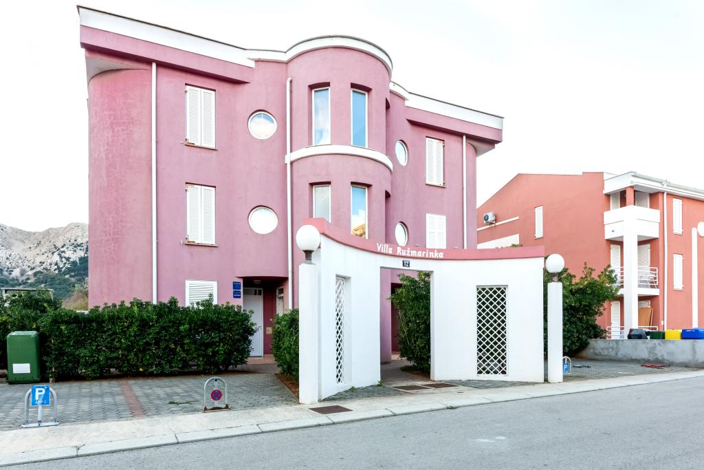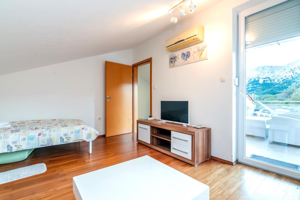 Byt se nachází ve 2. a 3. patře. Má 2 dvoulůžkové pokoje s manželskou postelí, 1 dvoulůžkový pokoj se samostatnými lůžky, obývací pokoj s pohovkou pro 2 osoby, 2 koupelny, plně vybavenou kuchyň a jídelnu. Tento apartmán se nachází přibližně 3 minuty chůze od centrální pláže. Tento moderní apartmán se nachází v klidné oblasti a je vybaven 3 klimatizacemi, bezplatným Wi-Fi internetem, SAT-TV, prostornou terasou a bezplatným parkováním před domem. V blízkosti objektu je také malý obchod a restaurace.