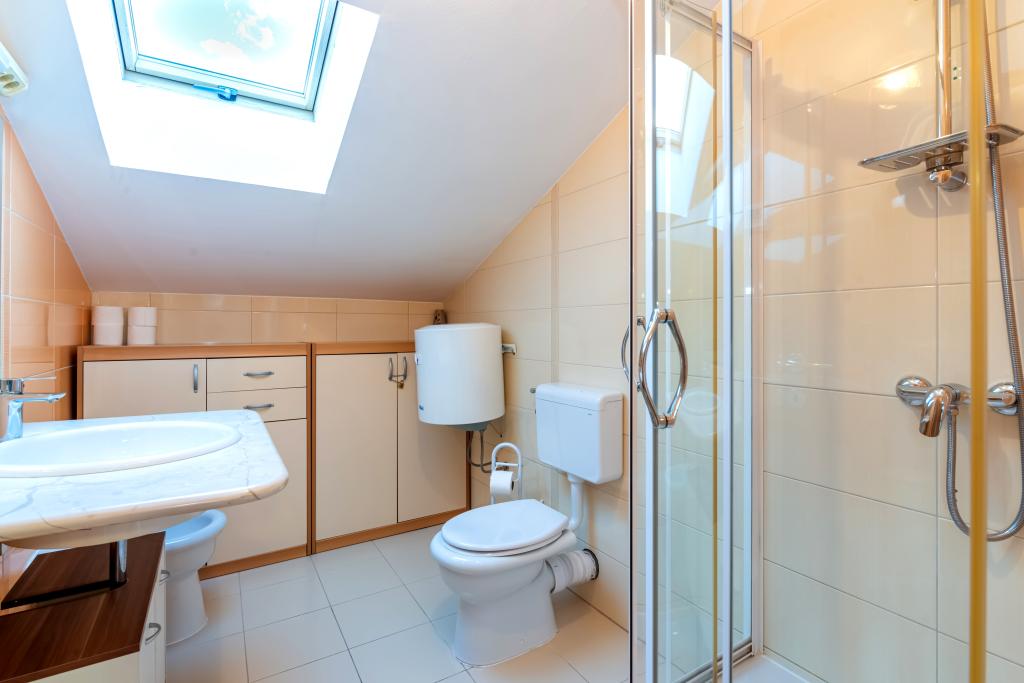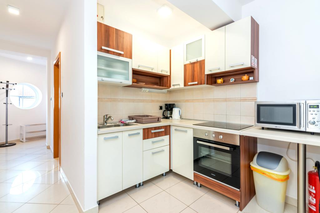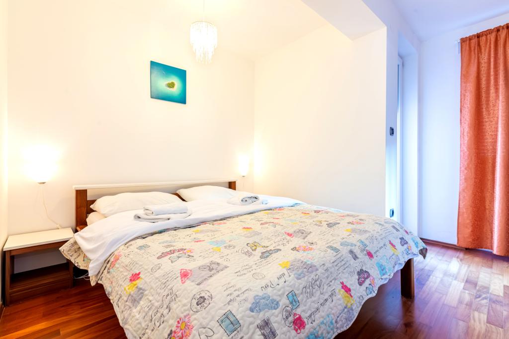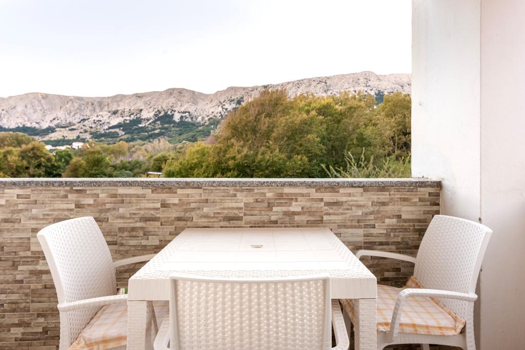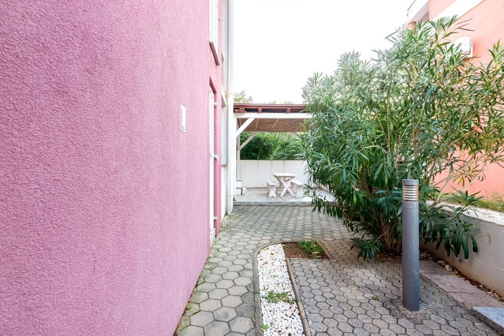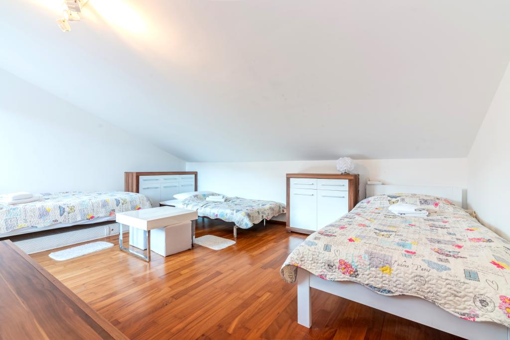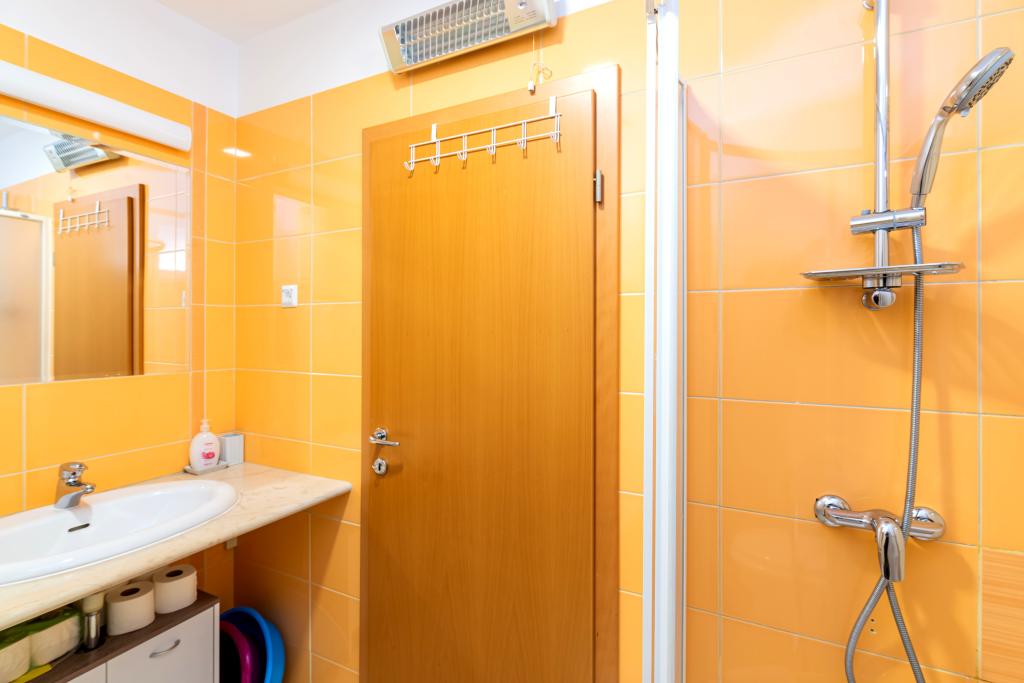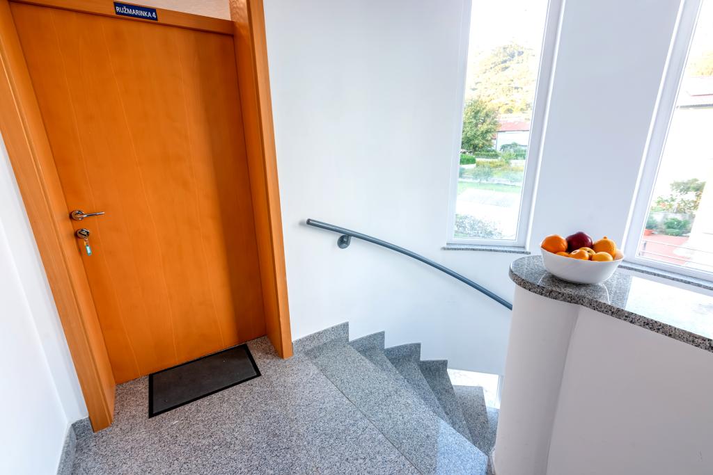 Byt se nachází ve 2. a 3. patře. Má 2 dvoulůžkové pokoje s manželskou postelí, 1 dvoulůžkový pokoj se samostatnými lůžky, obývací pokoj s pohovkou pro 2 osoby, 2 koupelny, plně vybavenou kuchyň a jídelnu. Tento apartmán se nachází přibližně 3 minuty chůze od centrální pláže. Tento moderní apartmán se nachází v klidné oblasti a je vybaven 3 klimatizacemi, bezplatným Wi-Fi internetem, SAT-TV, prostornou terasou a bezplatným parkováním před domem. V blízkosti objektu je také malý obchod a restaurace.