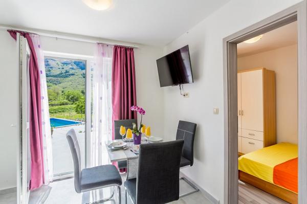 Příjemně umístěné místo, daleko od davů v klidné oblasti s výhledem na krásné hory. Apartmán pro 5 osob pěkný, čistý, prostorný, dobře vybavený s velkou terasou. Bazén je čistý a poměrně velký, ráj pro děti. Můžete si zaplavat a relaxovat u bazénu s kávou nebo sklenkou vína. Můžete se vydat na výlety na kole, například do Baśky, nebo na výlety po horách - pokud máte rádi procházky v horku :) Otevřeni a přátelští majitelé.