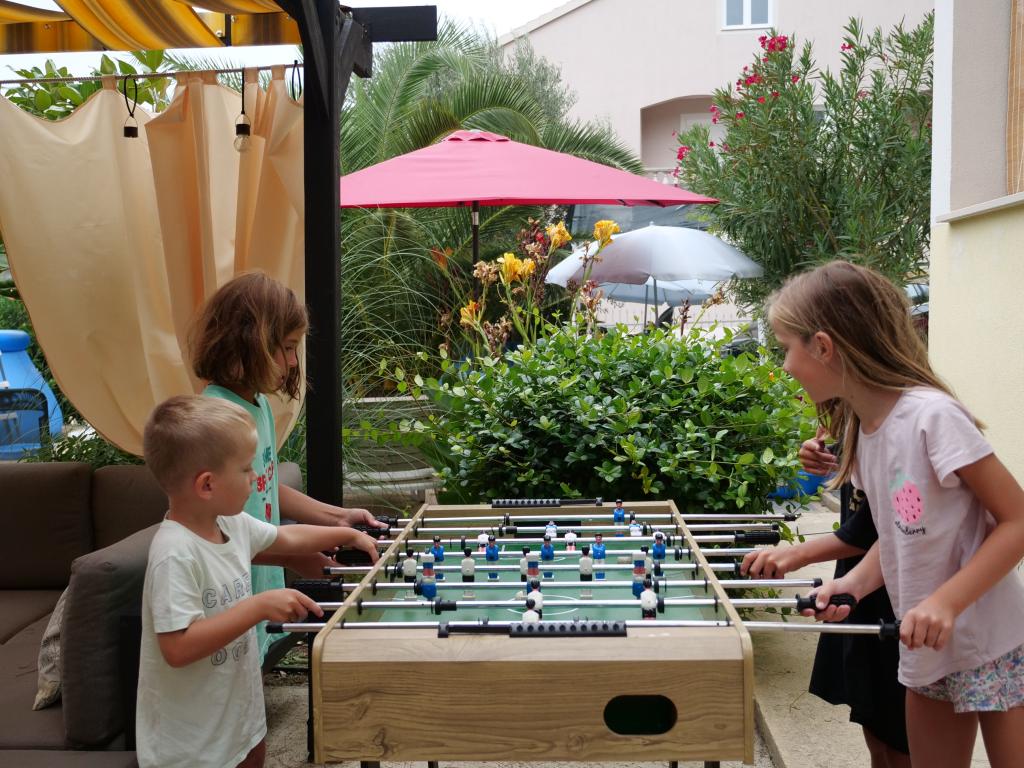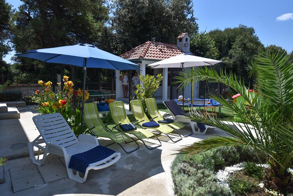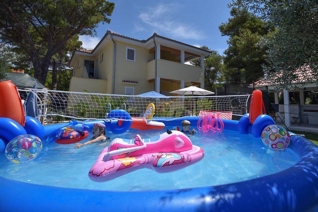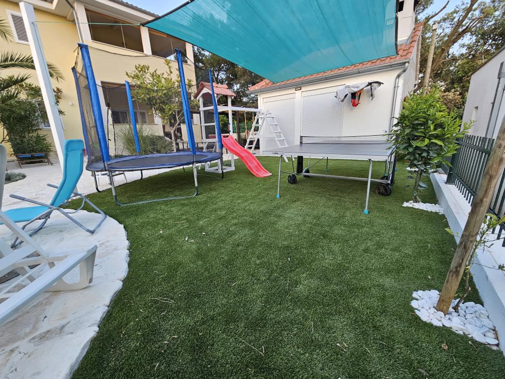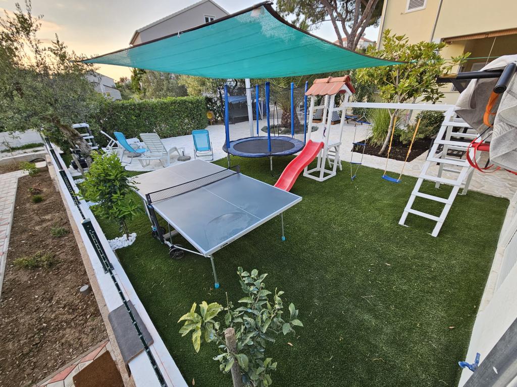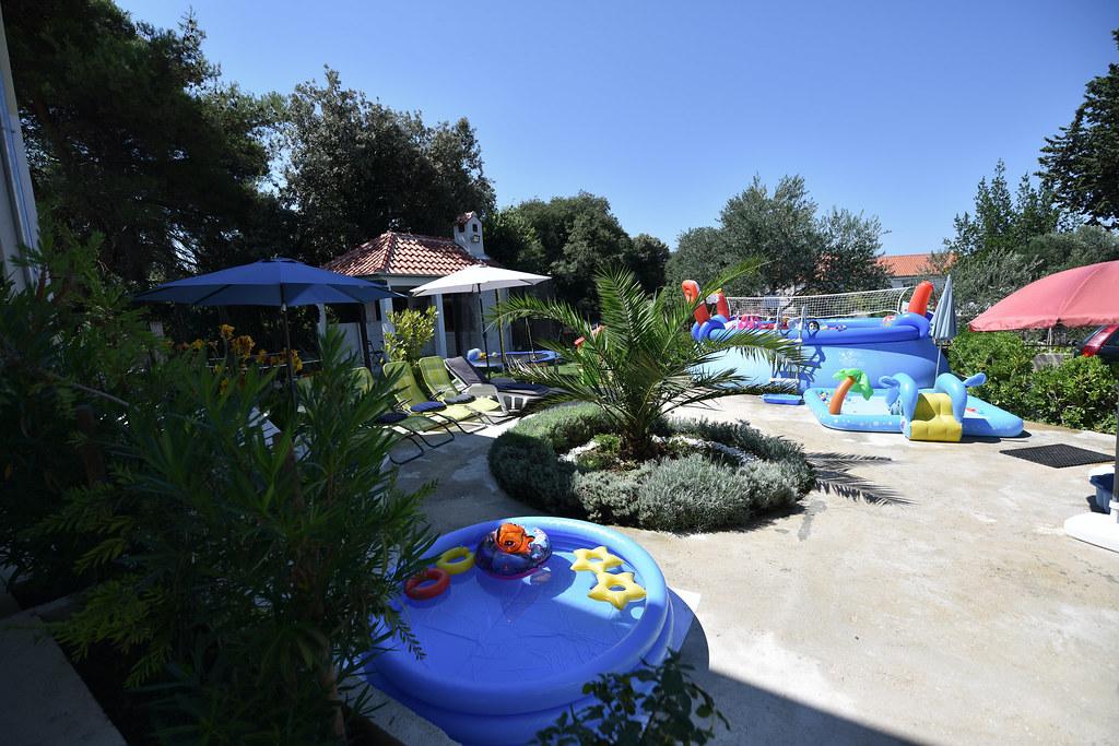 Naši hosté mohou volně využívat dvůr a zahradu. Vše, co najdete na dvoře a zahradě, můžete používat zdarma. Sdílí ho všichni, kdo u nás doma pobývají. Najdete zde bazén, jízdní kola (pro děti i dospělé, s jídelními židličkami), gril s grilem (sac, saće, čripnja), výrobník ledu, fritézu, 2 ledničky, dřez, přenosný elektrický vařič, cvičební stroje, lehátka se slunečníky, solární sprchu, zahradní houpačku pro 4 osoby a několik bazénů (od nejmenších pro miminka až po největší), dětské dřevěné a plastové stoly, herní domeček se skluzavkou, žebříkem a houpačkou, pískoviště, šipky, stolní tenis, trampolínu, badminton, dětskou houpačku a mnoho dalších dětských hraček.