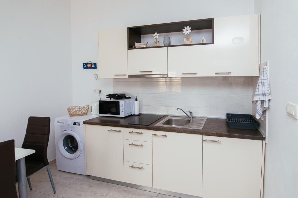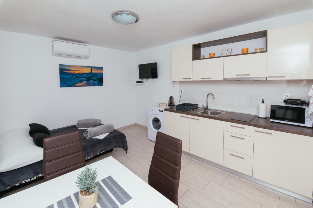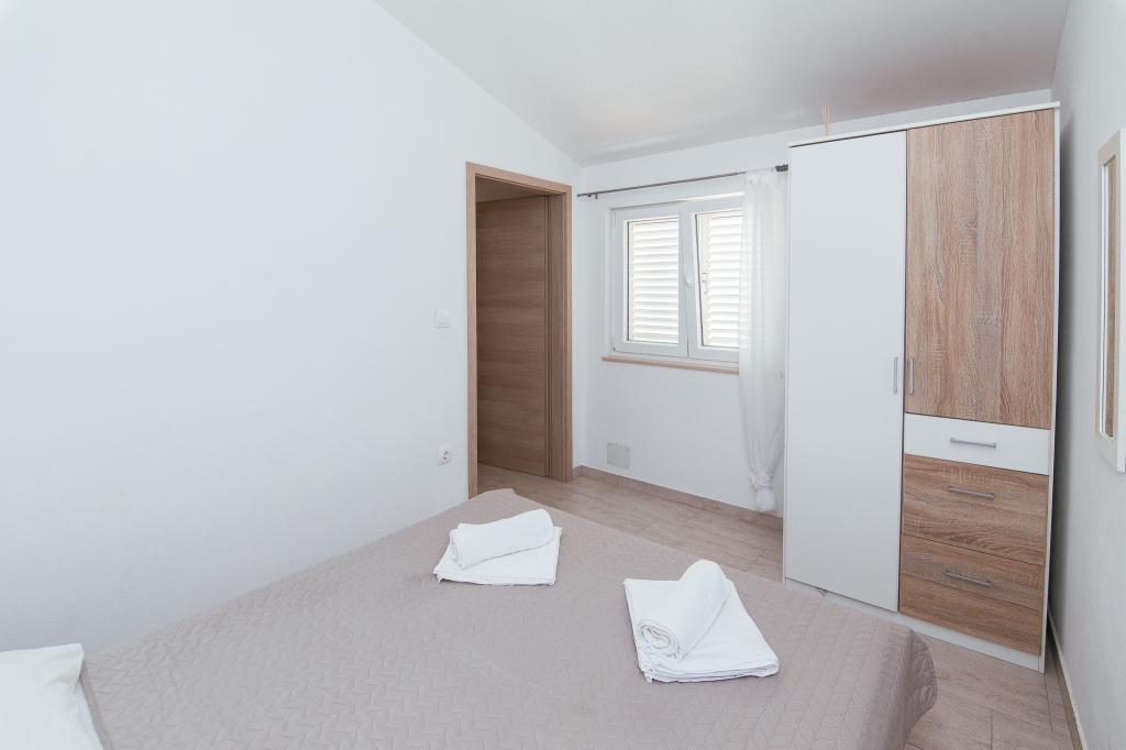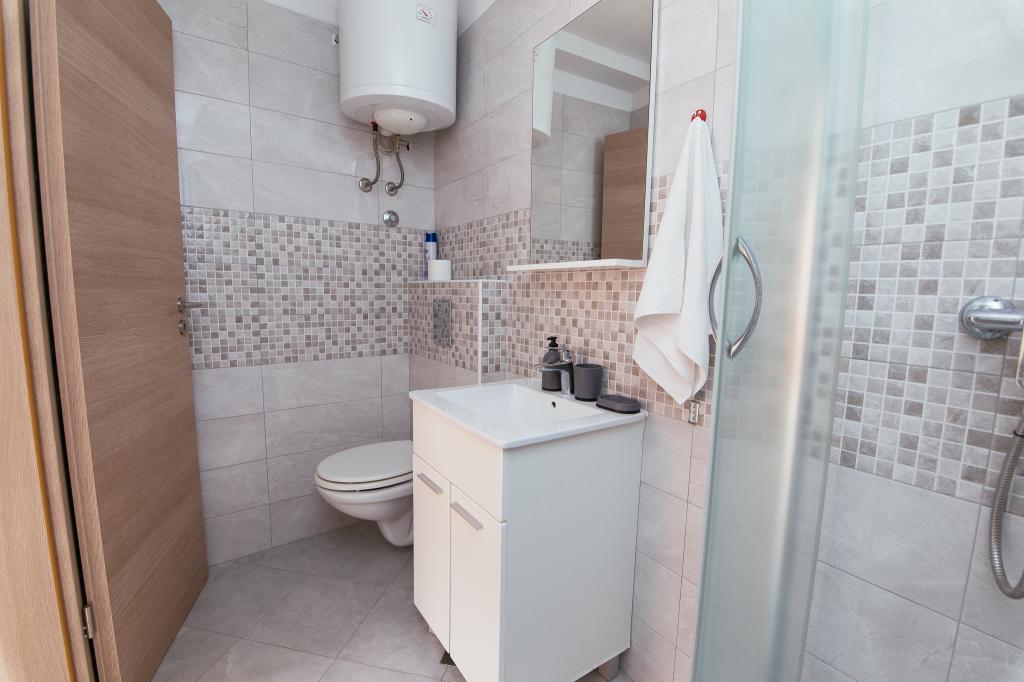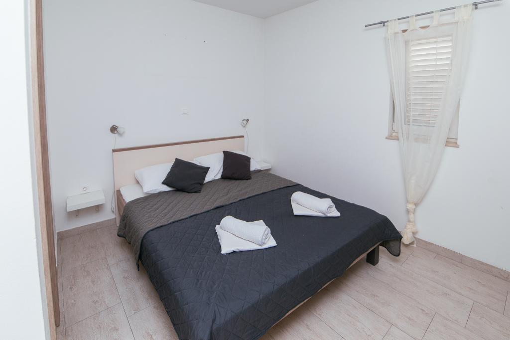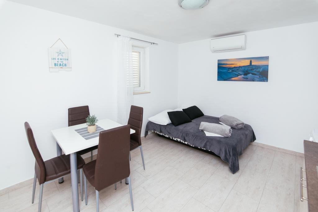 Apartmány AE se nacházejí v Biogradu na Moru na adrese Splitska ulica 37a. Apartmány se nacházejí 700 m od pláže Dražice (max. 7 minut chůze), centrum města je vzdálené 500 m. Obchod je od apartmánu vzdálený 20 m. Apartmán má jednu ložnici, rozkládací pohovku, kuchyň, koupelnu, jídelnu a velkou společnou terasu. Parkování zdarma, klimatizace, wifi, pračka, gril k dispozici.