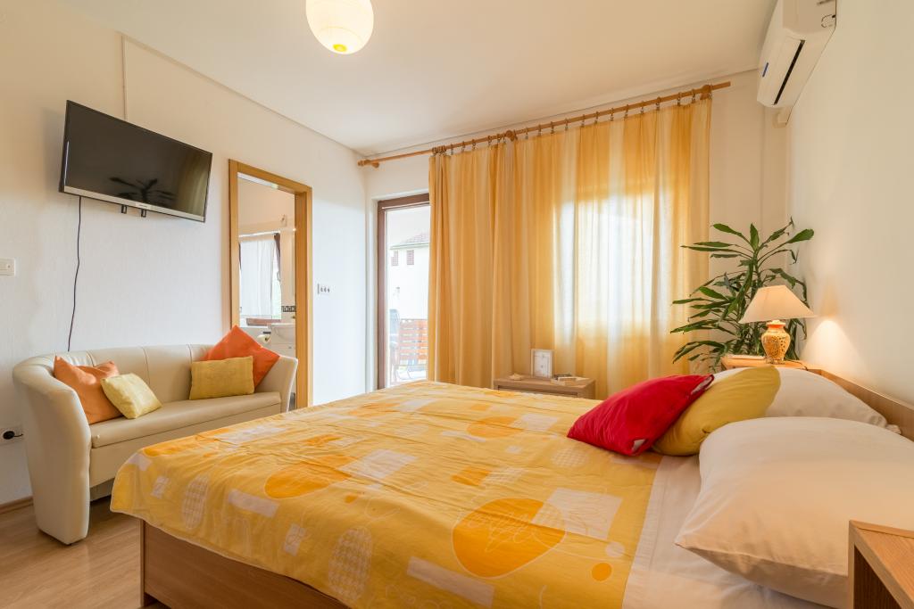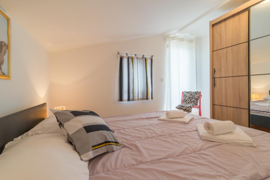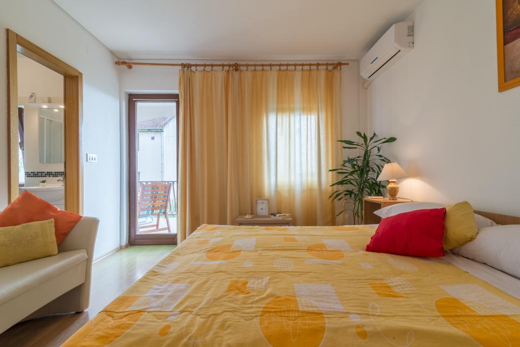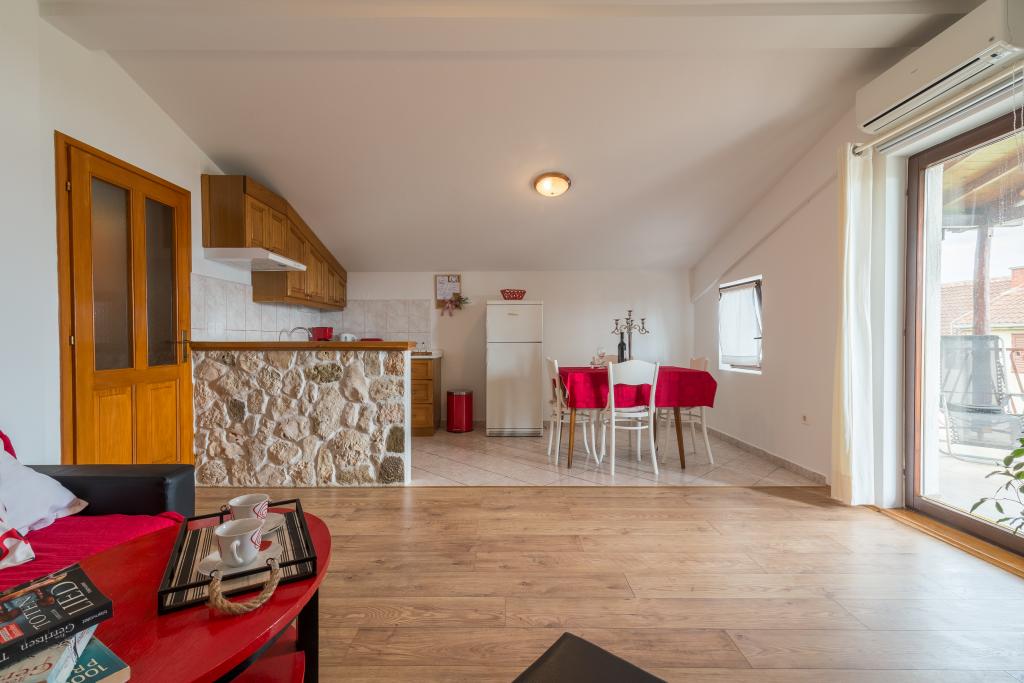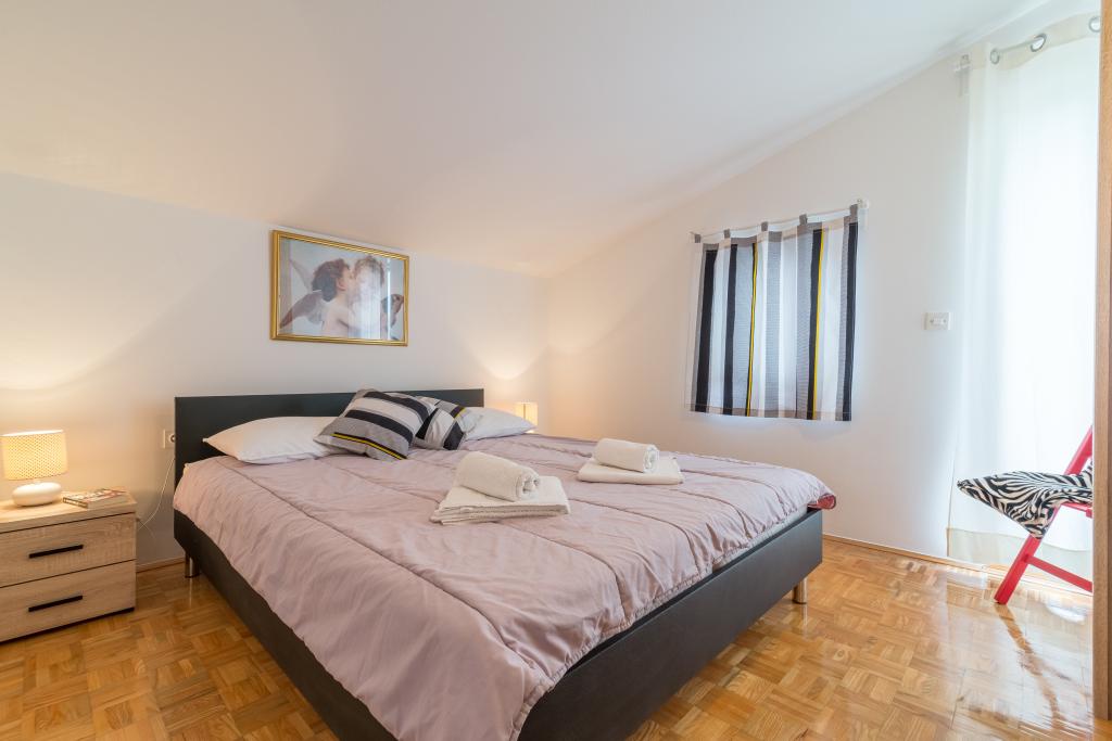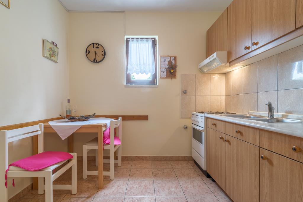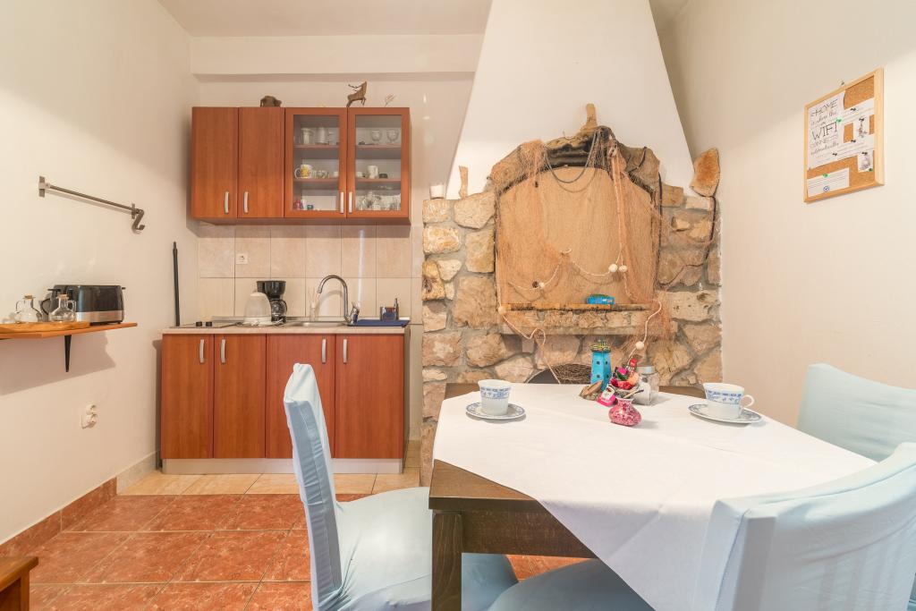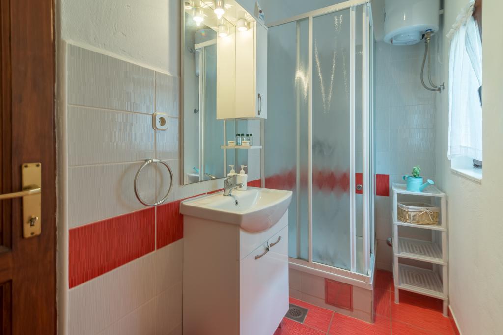 Rodinný dům se dvěma byty a pomocné budovy s jedním bytem. Apartmán A2 smješšten je v prvním patře a skládá se z kuchyně, ložnice, koupelna a terasa s výhledem na moře. Apartmán A4 +1 se nachází v nejvyšším patře, klimatizací, dvě ložnice s manželskou postelí, koupelna, kuchyň a obývací pokoj, terasa s výhledem na moře. A2 +1 se nachází v pomocné budově v přízemí, klimatizace, kuchyň, ložnice (manželská postel s přistýlkou), koupelna, 50 m od moře.