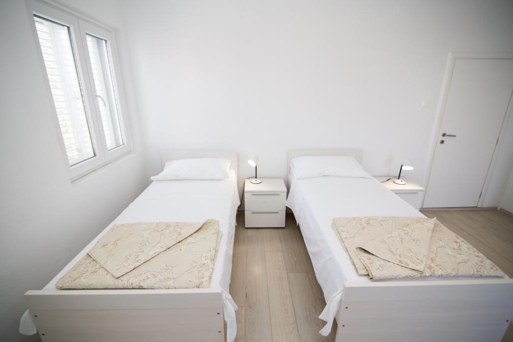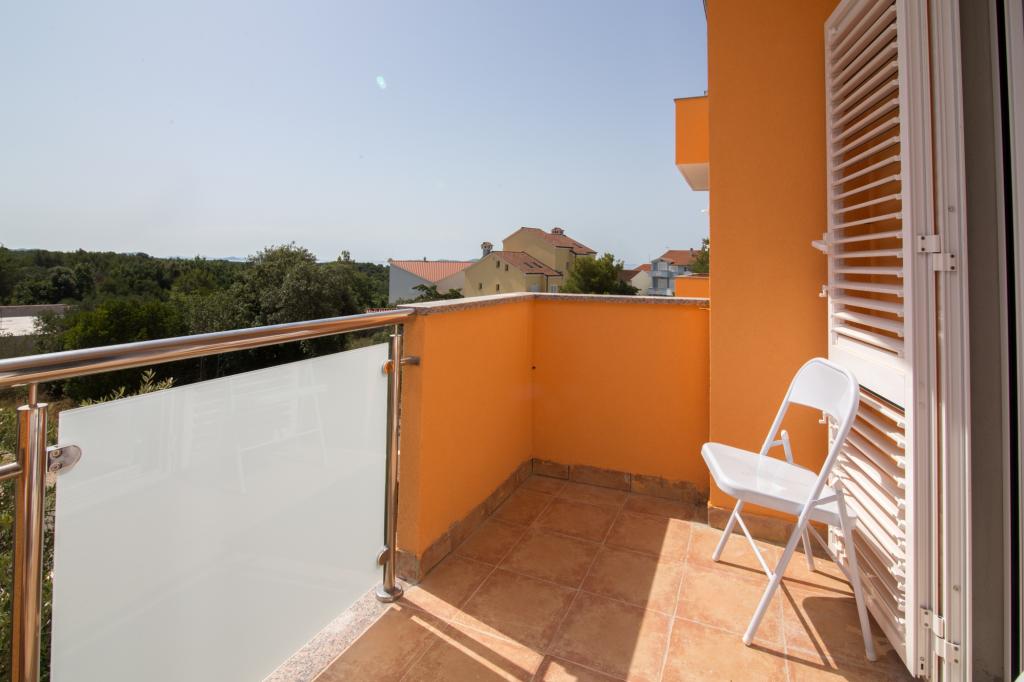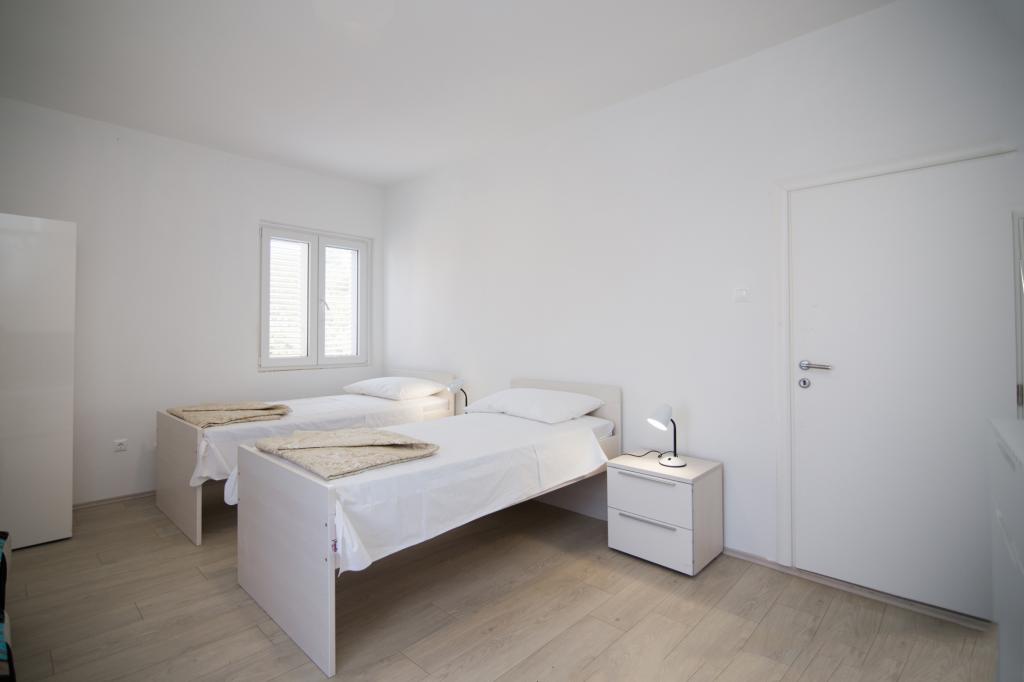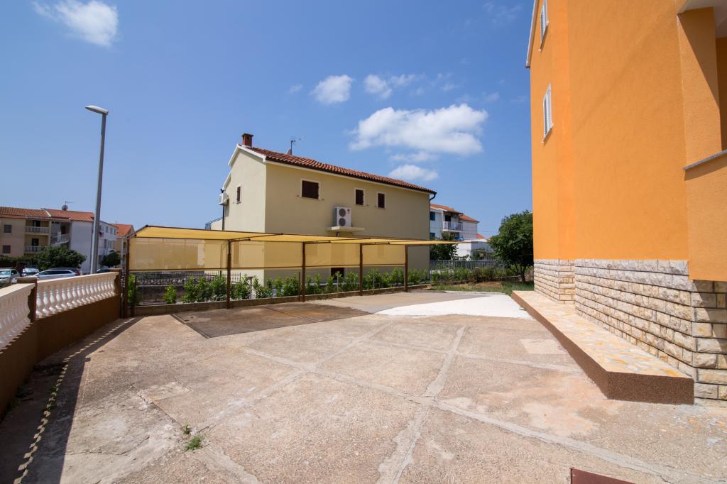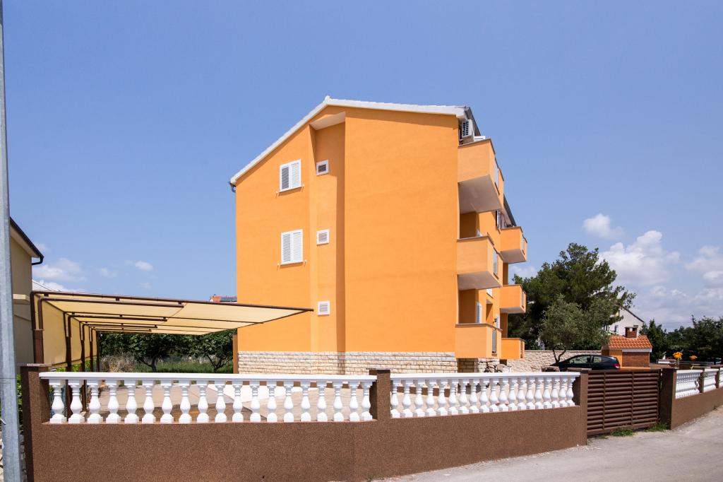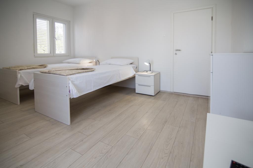 Apartmány Jadran se nacházejí v klidném apartmánovém komplexu v Biogradu na Moru Kumenat, vzdáleném od centra města, vedle turistického kempu obklopeného borovými lesy. Do centra města se dostanete 10minutovou procházkou po promenádě podél moře. Vzdálenost od stejnojmenné pláže Kumenat je asi 100 metrů a od druhé písečné pláže Soline asi 300 metrů. Apartmány se nacházejí ve druhém a třetím patře rodinného domu s výhledem na moře a ostrovy, o celkové rozloze 65 m2 každý apartmán, skládající se ze dvou samostatných pokojů s lůžky a přistýlkami a dalšího pokoje se dvěma lůžky, kuchyně s obývacím pokojem, chodby, koupelny a dvou teras. Každý apartmán má 2 pokoje a jednu přistýlku, takže ubytování je vhodné pro 5 osob, a dvě terasy v přední a zadní části domu, kde si můžete užívat a relaxovat při ranním štěbetání ptáků a kochat se výhledem na moře a ostrovy a romantickými západy slunce. Počet nocí závisí na výběru hostů, ceník je k dispozici kliknutím na tlačítko ceník. Vítejte!
