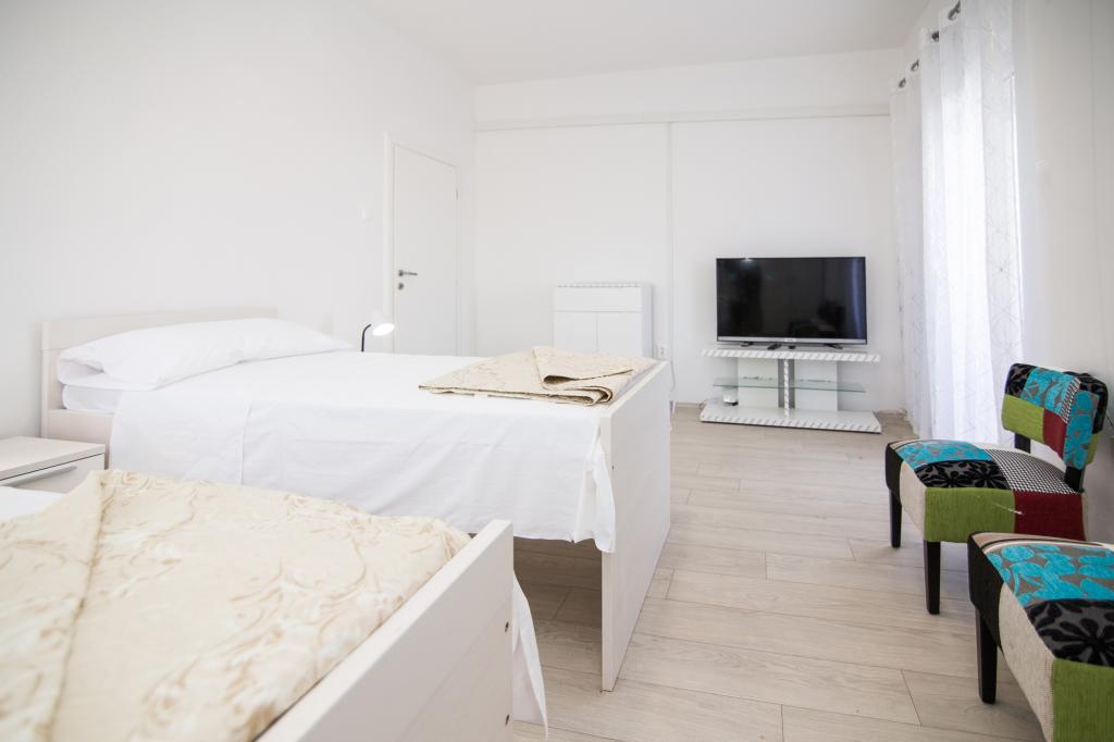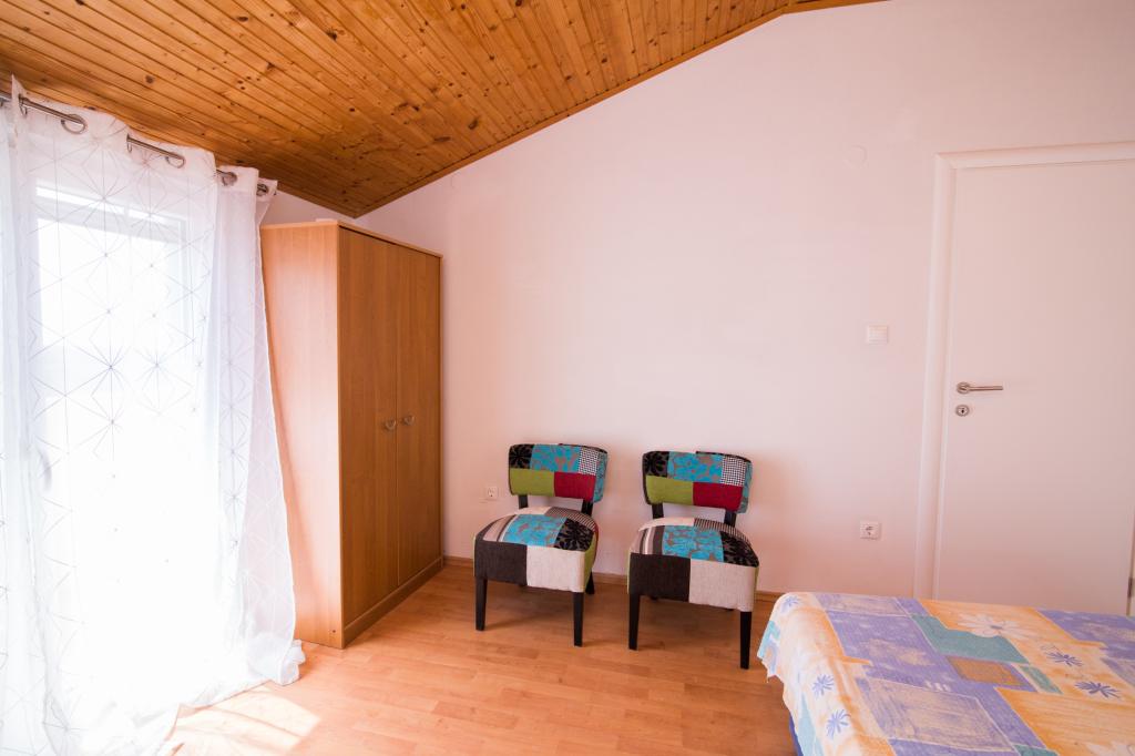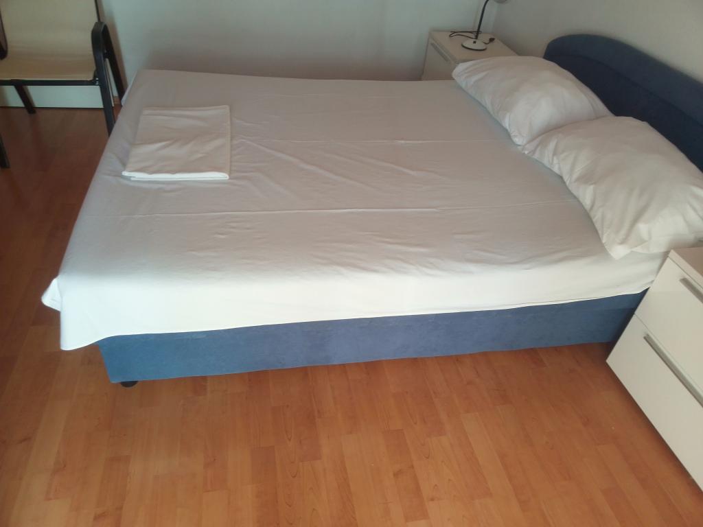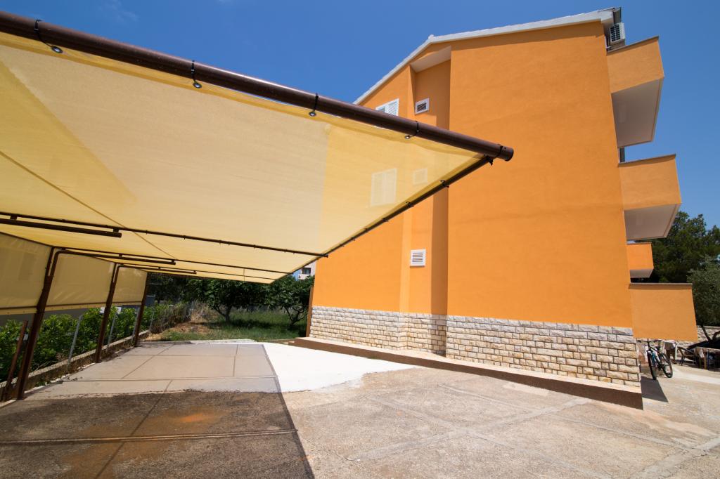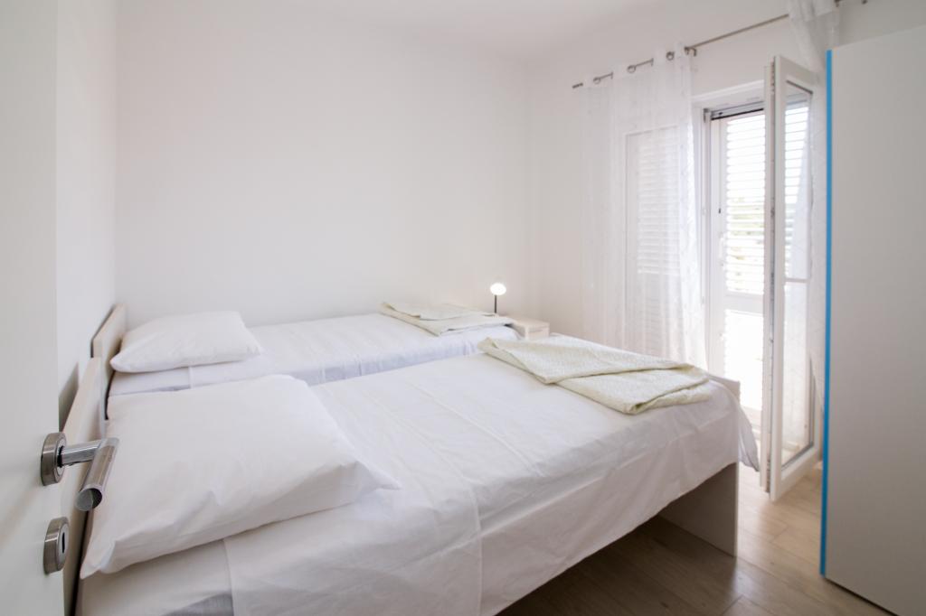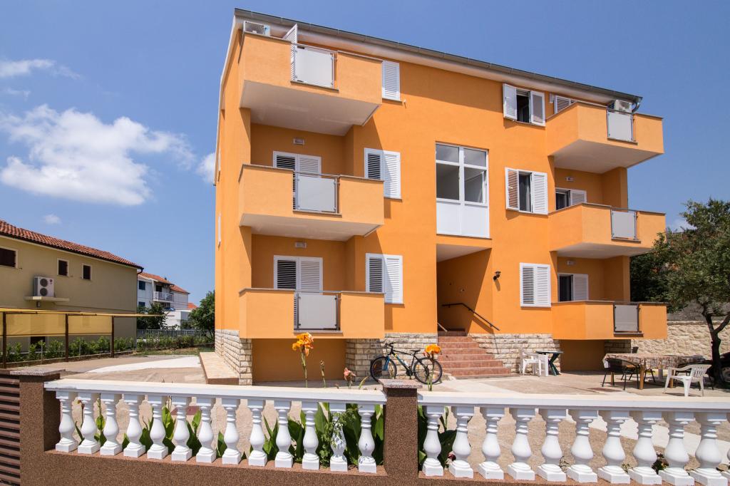 Apartmány Jadran se nacházejí v klidném apartmánovém komplexu v Biogradu na Moru Kumenat, vzdáleném od centra města, vedle turistického kempu obklopeného borovými lesy. Do centra města se dostanete 10minutovou procházkou po promenádě podél moře. Vzdálenost od stejnojmenné pláže Kumenat je asi 100 metrů a od druhé písečné pláže Soline asi 300 metrů. Apartmány se nacházejí ve druhém a třetím patře rodinného domu s výhledem na moře a ostrovy, o celkové rozloze 65 m2 každý apartmán, skládající se ze dvou samostatných pokojů s lůžky a přistýlkami a dalšího pokoje se dvěma lůžky, kuchyně s obývacím pokojem, chodby, koupelny a dvou teras. Každý apartmán má 2 pokoje a jednu přistýlku, takže ubytování je vhodné pro 5 osob, a dvě terasy v přední a zadní části domu, kde si můžete užívat a relaxovat při ranním štěbetání ptáků a kochat se výhledem na moře a ostrovy a romantickými západy slunce. Počet nocí závisí na výběru hostů, ceník je k dispozici kliknutím na tlačítko ceník. Vítejte!