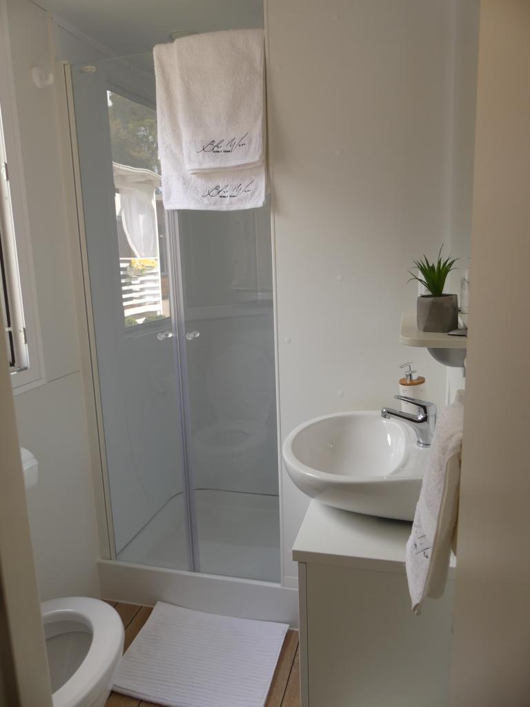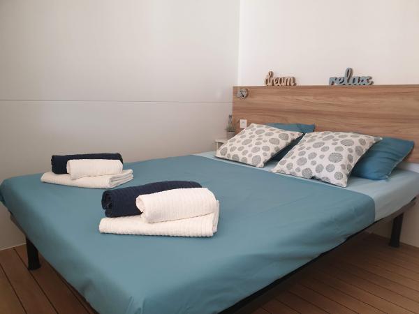 Blue Wave je nový, moderní a plně vybavený mobilní dům se dvěma ložnicemi (jedna s manželskou postelí a druhá se dvěma samostatnými lůžky), skříněmi, dvěma koupelnami se sprchovým koutem, obývacím pokojem s přistýlkou (135x180cm), plně vybavenou kuchyní s klimatizací a velkou terasou. Terasa je vybavena jídelním stolem, elektrickým grilem a dvěma pohodlnými lehátky. Bezdrátové připojení k internetu je k dispozici v celém objektu zdarma. Blue Wave se nachází v klidném borovém lese v kempu Soline v Biogradu na moru. Zařízení je 2-3 minuty chůze od pláže, kavárny a restaurace. V kempu jsou pračky a sušičky, bankomat, obchod, pekárna, dětské hřiště a vše, co potřebujete pro příjemný pobyt! V bezprostřední blízkosti kempu, asi 10 minut chůze po nově zrekonstruované promenádě podél moře, se nachází centrum Biogradu, které má různá zařízení, stejně jako přístav Kornati. Dalmaland Fun & Water Park je také nedaleko pro skvělou zábavu.