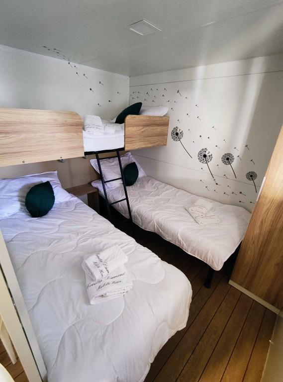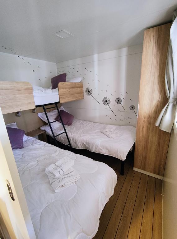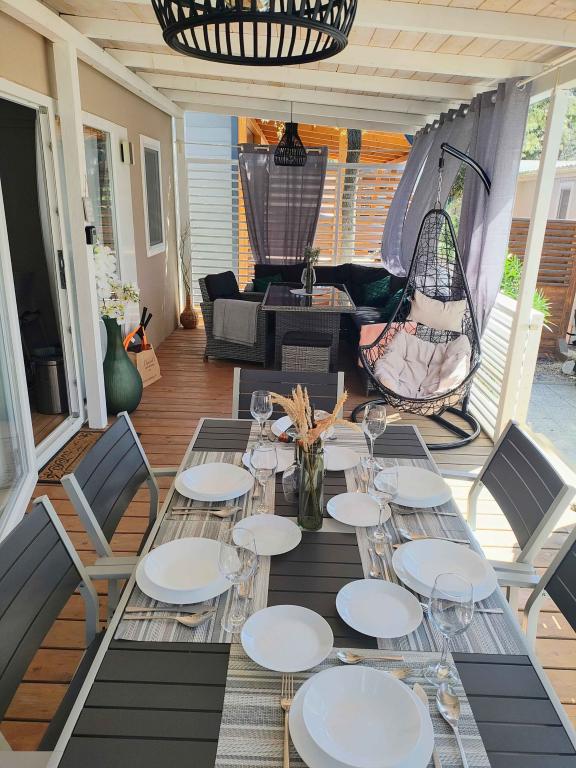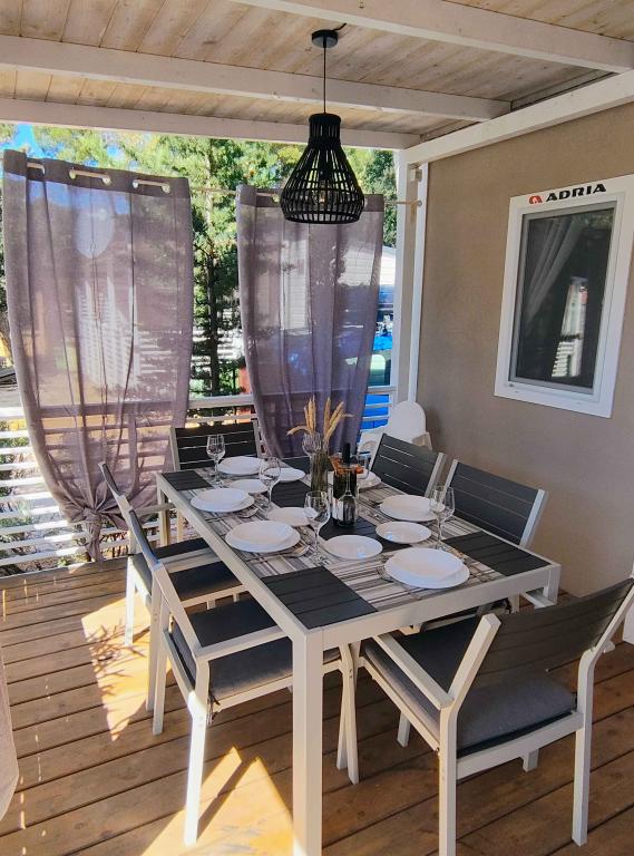 Náš moderně vybavený mobilní dům nabízí pohodlné ubytování až pro 7 osob se 2 prostornými ložnicemi, obývacím pokojem s rozkládací pohovkou a 2 koupelnami. Užijte si velkou krytou terasu s jídelním koutem a venkovním posezením, ideální pro dlouhé večerní posezení, při grilování na našem velkém plynovém grilu a venkovním vařiči. Krytá terasa je obklopena borovicemi a jemným vánkem od moře. Na jedné straně terasy se nachází prostorná jídelna a na druhé straně naše venkovní posezení nabízí pohodlné posezení a pro dokonalé potěšení je zde také "houpačka ve tvaru vejce". Také na otevřeném prostranství si můžete užívat slunce nebo stínu na velkém pohodlném lehátku s malým stolkem, kde si můžete vychutnat koktejly nebo studený nápoj, nebo si přečíst knihu. Dům se nachází 3 minuty od krásné pláže.