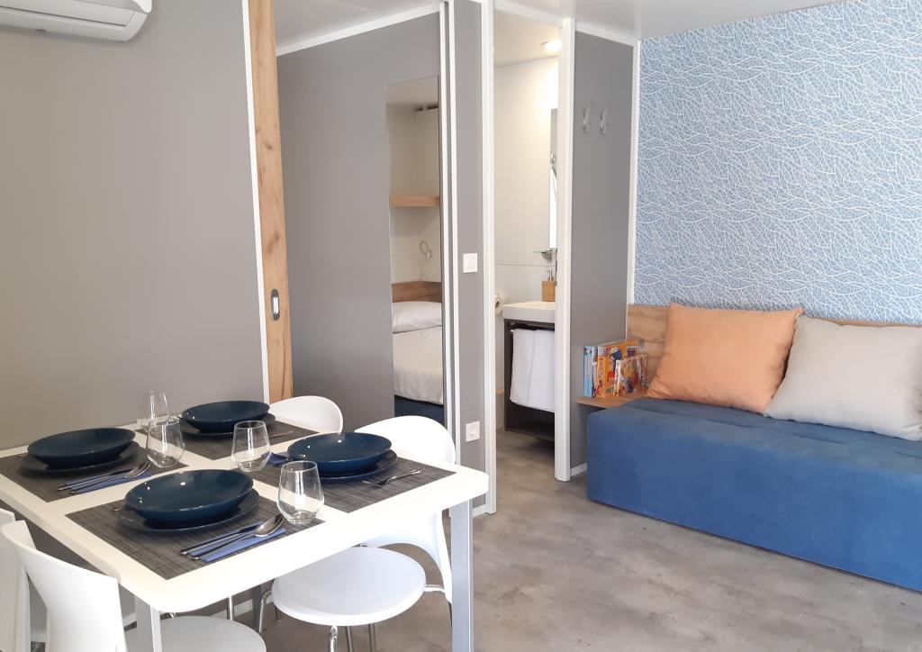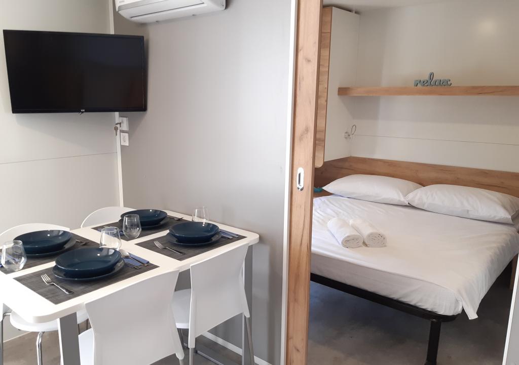 Moderní mobilní dům InnMare 792 v klidné části kempu Soline, nacházející se v borovém lese, je ideálním místem pro rodinnou dovolenou. S rozlohou 32 m2 se skládá z ložnice s manželskou postelí, ložnice se dvěma samostatnými lůžky, obývacího pokoje s rozkládací postelí (pro 1-2 osoby), koupelny s toaletou, terasy o rozloze 32 m2, malého dvorku a parkovacího místa. Nemovitost je plně zařízená, kuchyň kromě standardního vybavení obsahuje také mikrovlnnou troubu, rychlovarnou konvici a kávovar na espresso. Terasa je vybavena dalším jídelním stolem, lehátky pro dokonalé zdřímnutí okořeněné vůní borovic a vedle nemovitosti se nachází elektrický gril, který je také nedílnou součástí vybavení, které mohou hosté využívat. Vedle nemovitosti se nachází také parkovací místo pro jedno vozidlo, které mohou hosté využívat. Vítejte v InnMare 792, moderním objektu určeném pro klidnou a idylickou rodinnou dovolenou v tichém borovém lese, v blízkosti moře, pláží a Biogradu na Moru!