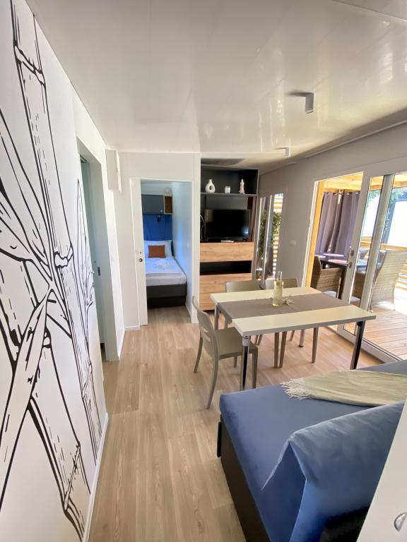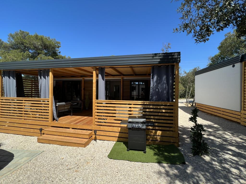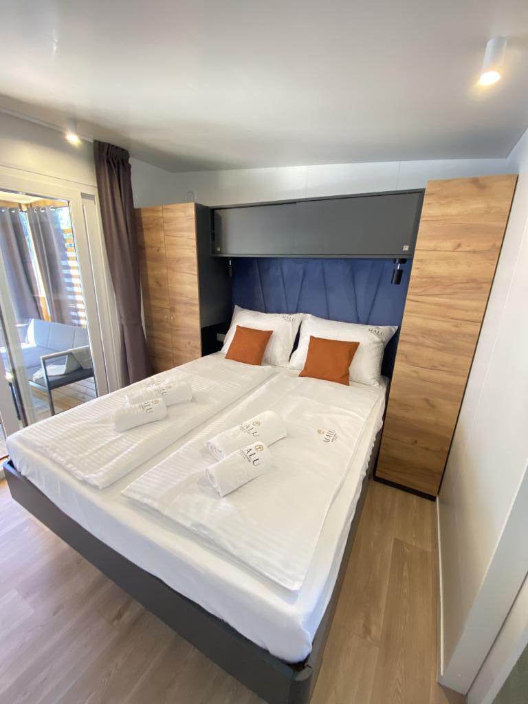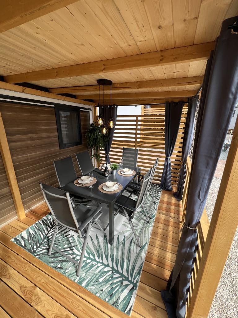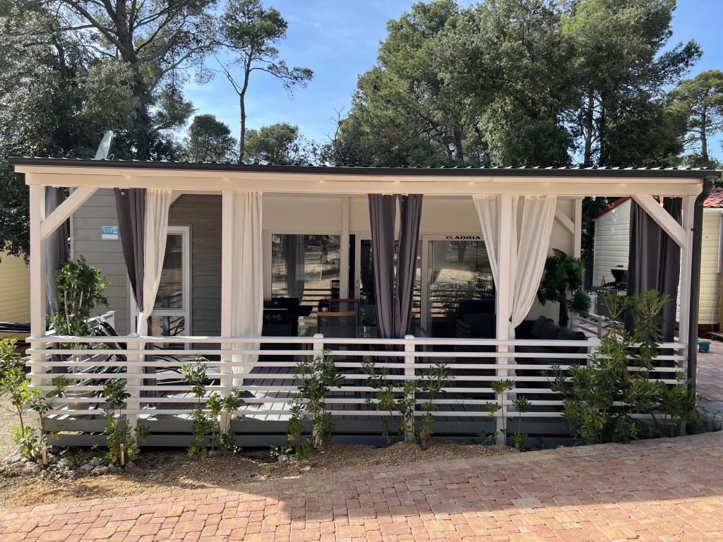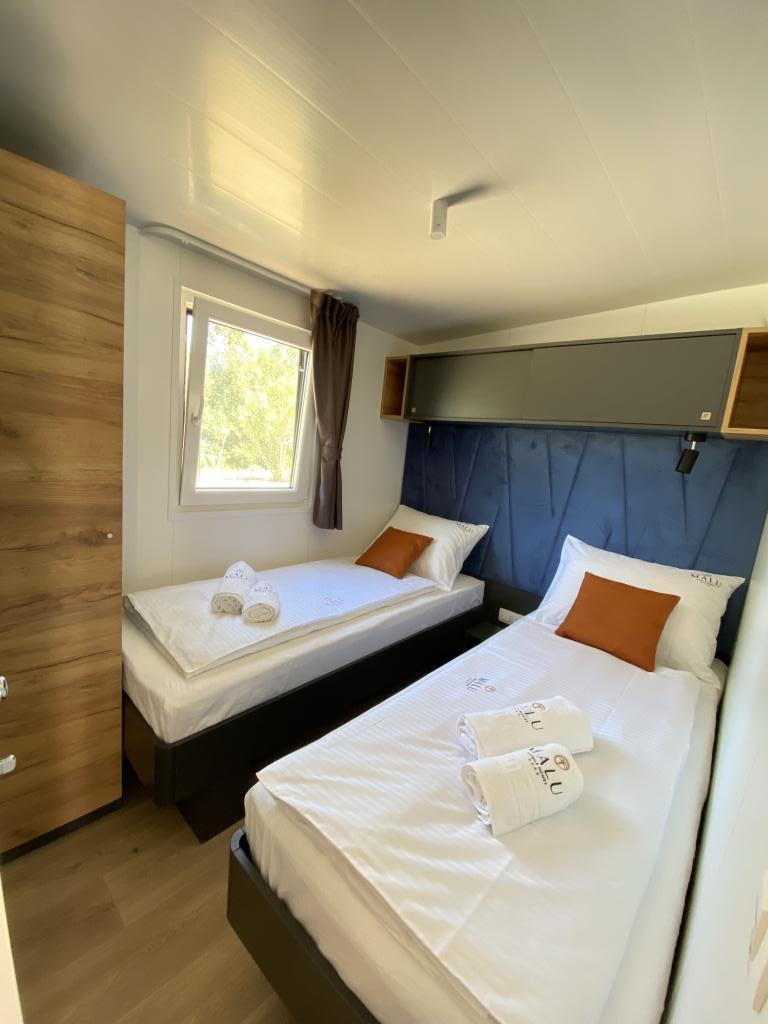 Vybavení mobilního domu Mobilní dům obsahuje: • 2 ložnice • Obývací pokoj s přistýlkou pro 2 osoby • Plně vybavená kuchyň • Jídelna • Koupelna • Velká krytá terasa cca 30 m² Vybavení • Klimatizace • Bezplatné WiFi připojení k internetu • Smart TV se satelitními kanály • Kávovar • Rychlovarná konvice • Topinkovač • Mikrovlnná trouba • Kompletní kuchyňské vybavení • Gril • Fén • Ložní prádlo v ceně • Ručníky v ceně Ideální pro rodiny Mobilní dům je vhodný zejména pro rodiny s dětmi. K dispozici je: • Dětská postýlka • Dětská jídelní židlička Výhody ubytování Mobilní dům Biograd na Moru – Kemp Park Soline Pouze 350 m od pláže Přirozený stín borovic Klidná lokalita Velká terasa Blízko moře Promenáda podél moře do centra Restaurace a obchody v kempu Ideální pro rodiny