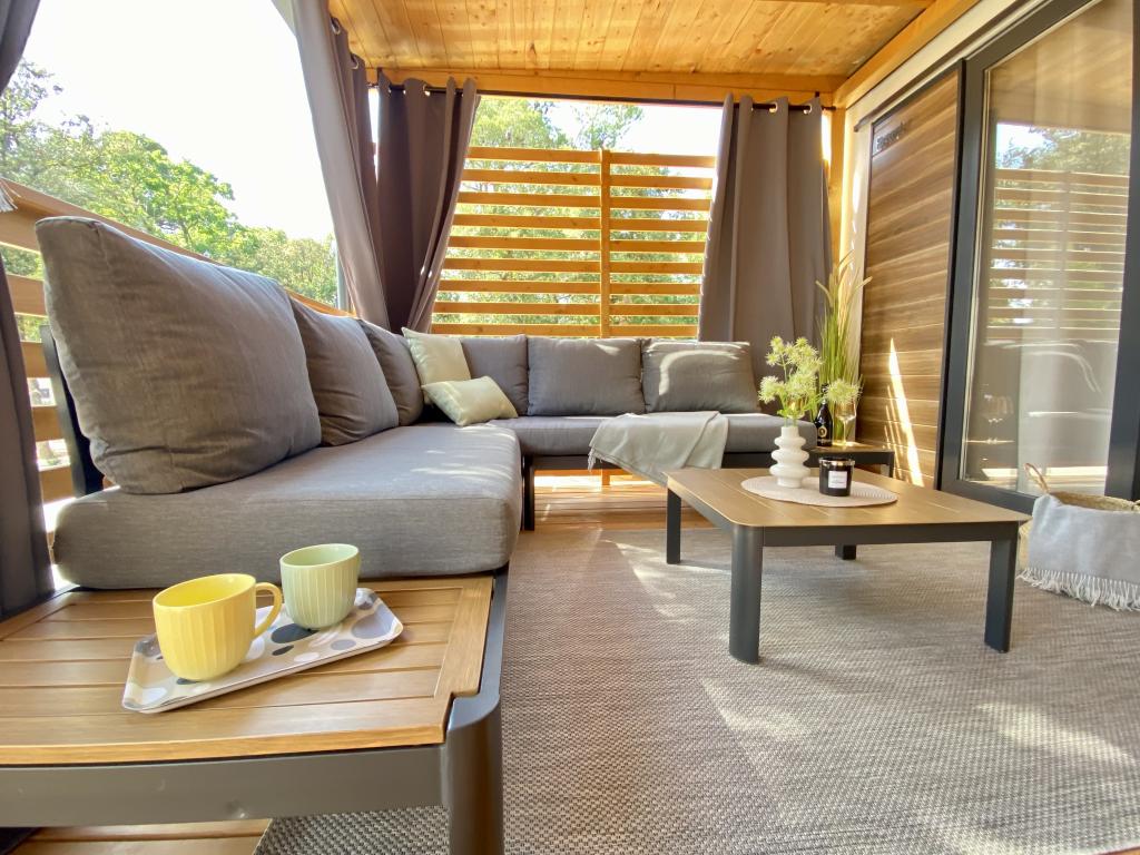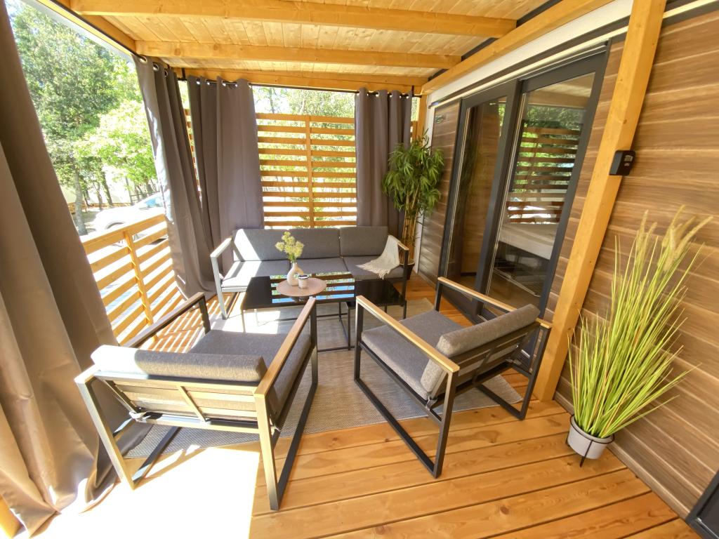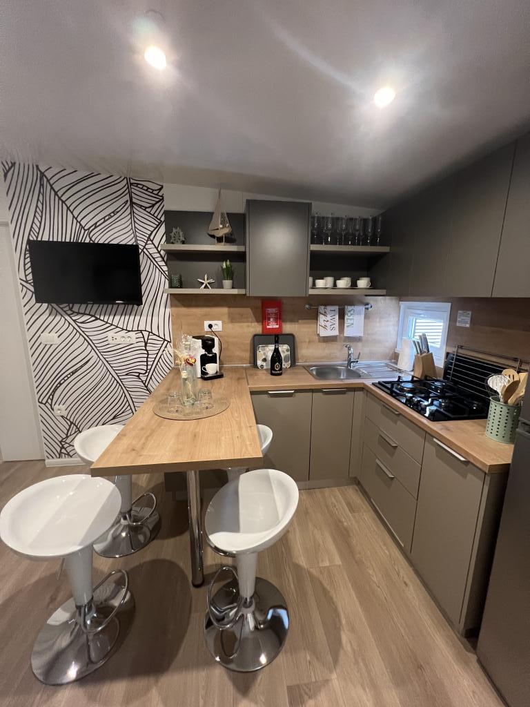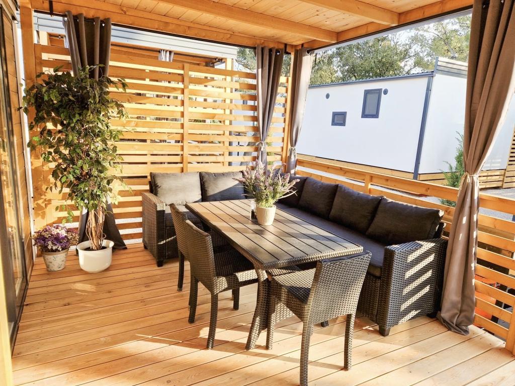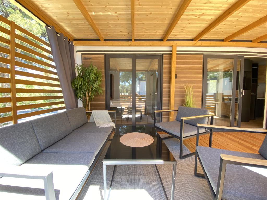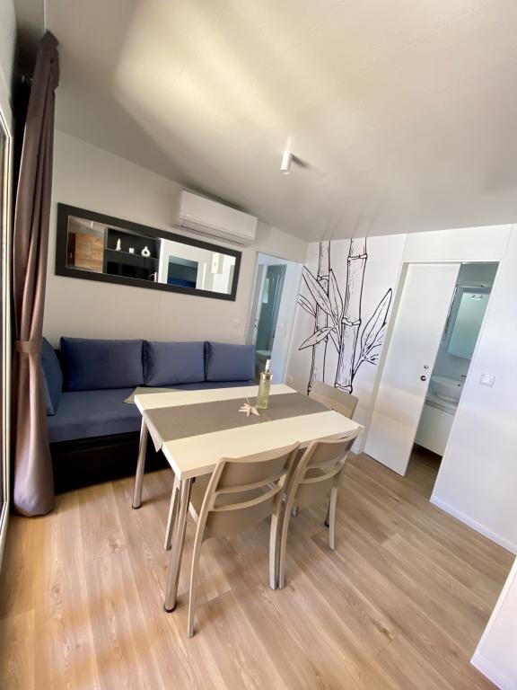 Vybavení mobilního domu Mobilní dům obsahuje: • 2 ložnice • Obývací pokoj s přistýlkou pro 2 osoby • Plně vybavená kuchyň • Jídelna • Koupelna • Velká krytá terasa cca 30 m² Vybavení • Klimatizace • Bezplatné WiFi připojení k internetu • Smart TV se satelitními kanály • Kávovar • Rychlovarná konvice • Topinkovač • Mikrovlnná trouba • Kompletní kuchyňské vybavení • Gril • Fén • Ložní prádlo v ceně • Ručníky v ceně Ideální pro rodiny Mobilní dům je vhodný zejména pro rodiny s dětmi. K dispozici je: • Dětská postýlka • Dětská jídelní židlička Výhody ubytování Mobilní dům Biograd na Moru – Kemp Park Soline Pouze 350 m od pláže Přirozený stín borovic Klidná lokalita Velká terasa Blízko moře Promenáda podél moře do centra Restaurace a obchody v kempu Ideální pro rodiny