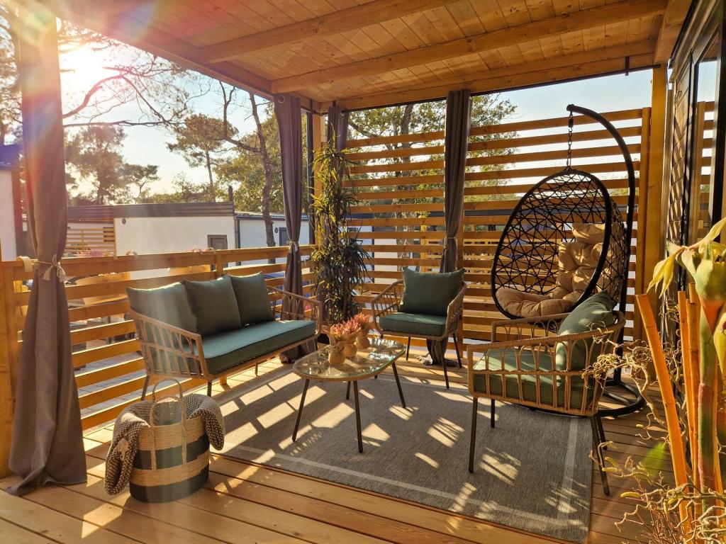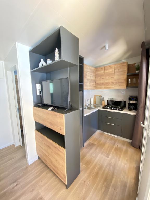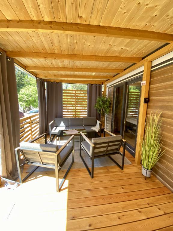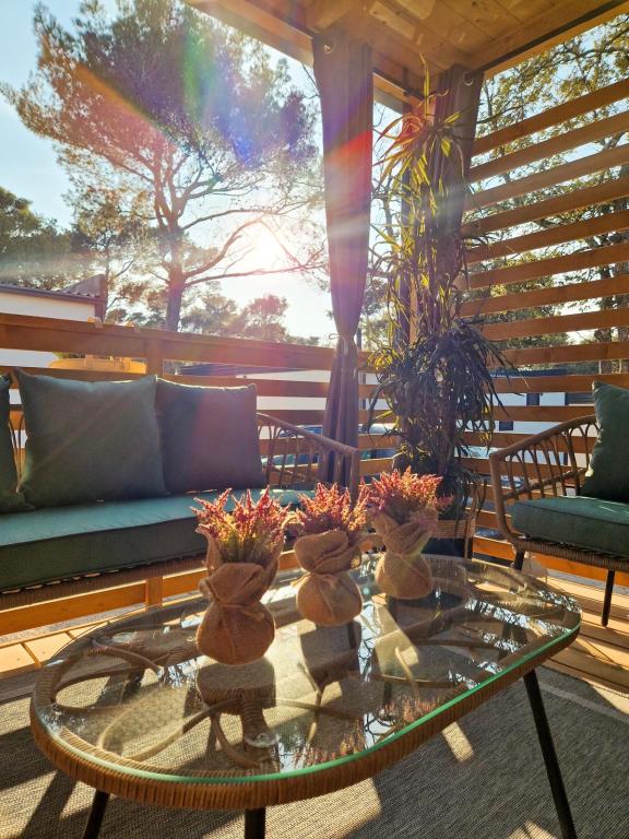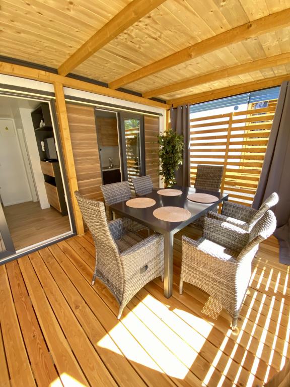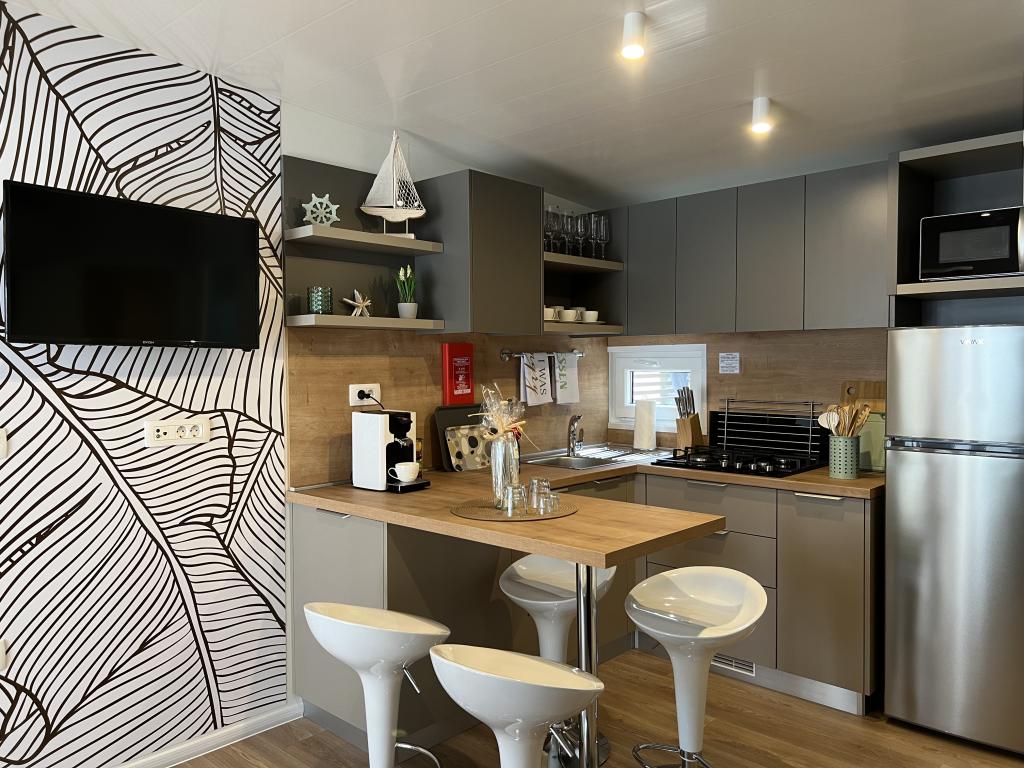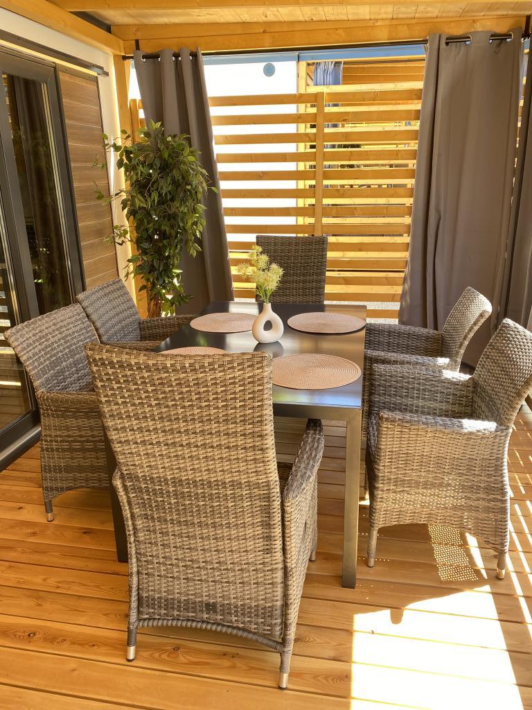 Vybavení mobilního domu Mobilní dům obsahuje: • 2 ložnice • Obývací pokoj s přistýlkou pro 2 osoby • Plně vybavená kuchyň • Jídelna • Koupelna • Velká krytá terasa cca 30 m² Vybavení • Klimatizace • Bezplatné WiFi připojení k internetu • Smart TV se satelitními kanály • Kávovar • Rychlovarná konvice • Topinkovač • Mikrovlnná trouba • Kompletní kuchyňské vybavení • Gril • Fén • Ložní prádlo v ceně • Ručníky v ceně Ideální pro rodiny Mobilní dům je vhodný zejména pro rodiny s dětmi. K dispozici je: • Dětská postýlka • Dětská jídelní židlička Výhody ubytování Mobilní dům Biograd na Moru – Kemp Park Soline Pouze 350 m od pláže Přirozený stín borovic Klidná lokalita Velká terasa Blízko moře Promenáda podél moře do centra Restaurace a obchody v kempu Ideální pro rodiny