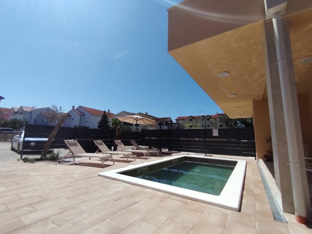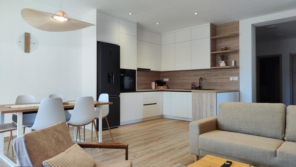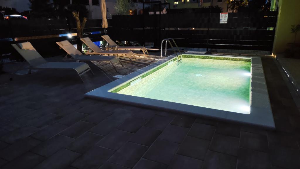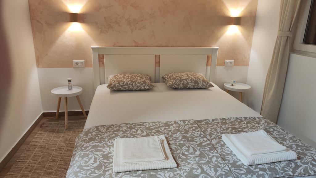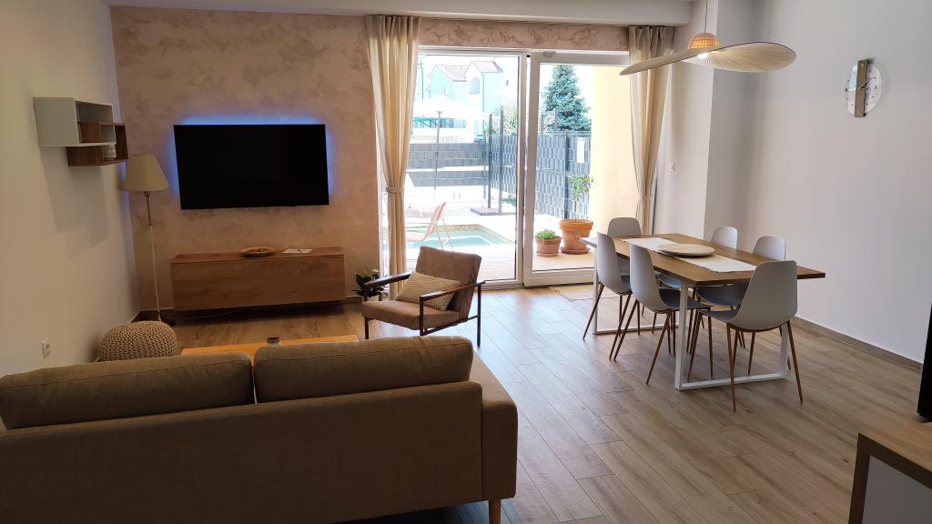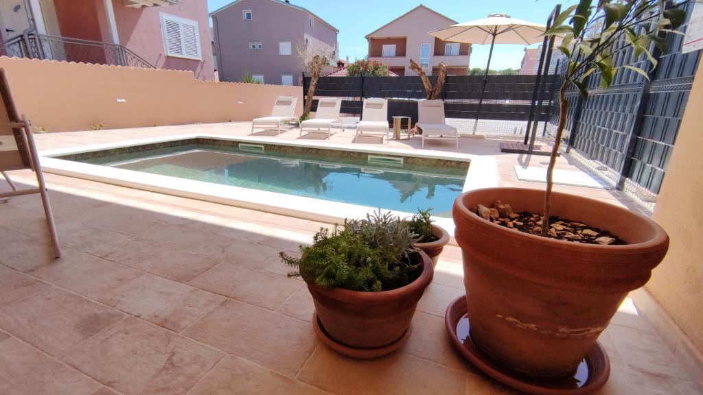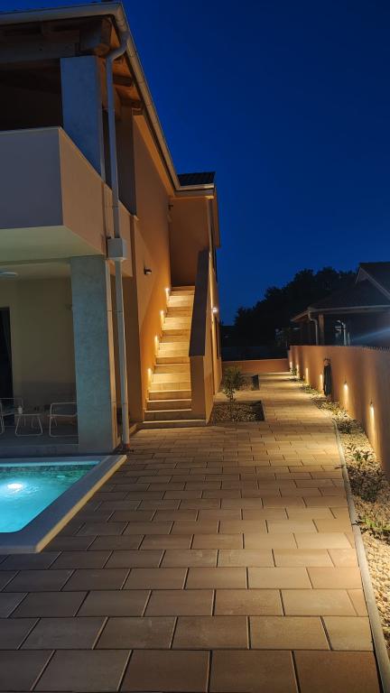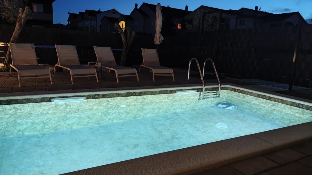 Nově postavený dvoupatrový rekreační dům s bazénem a dvěma samostatnými bytovými jednotkami (přízemí a první patro). Každá bytová jednotka má rozlohu 90 metrů čtverečních a je vybavena 3 ložnicemi, kuchyní, koupelnou, terasou a obývacím pokojem. Parkování je zajištěno.