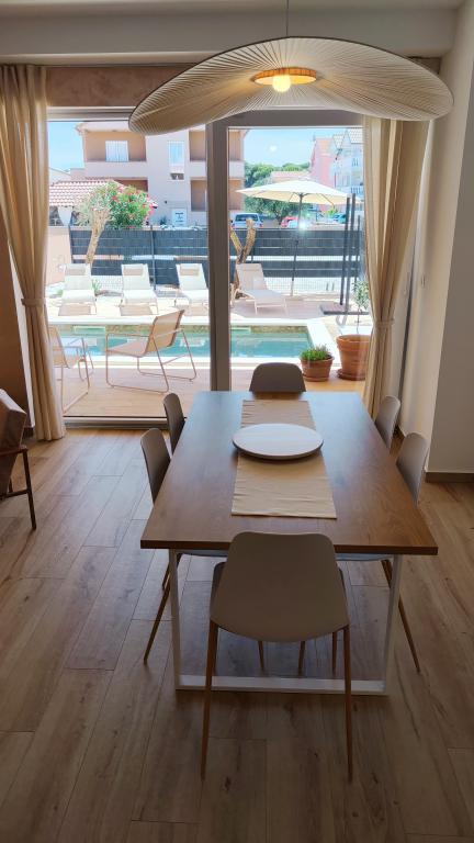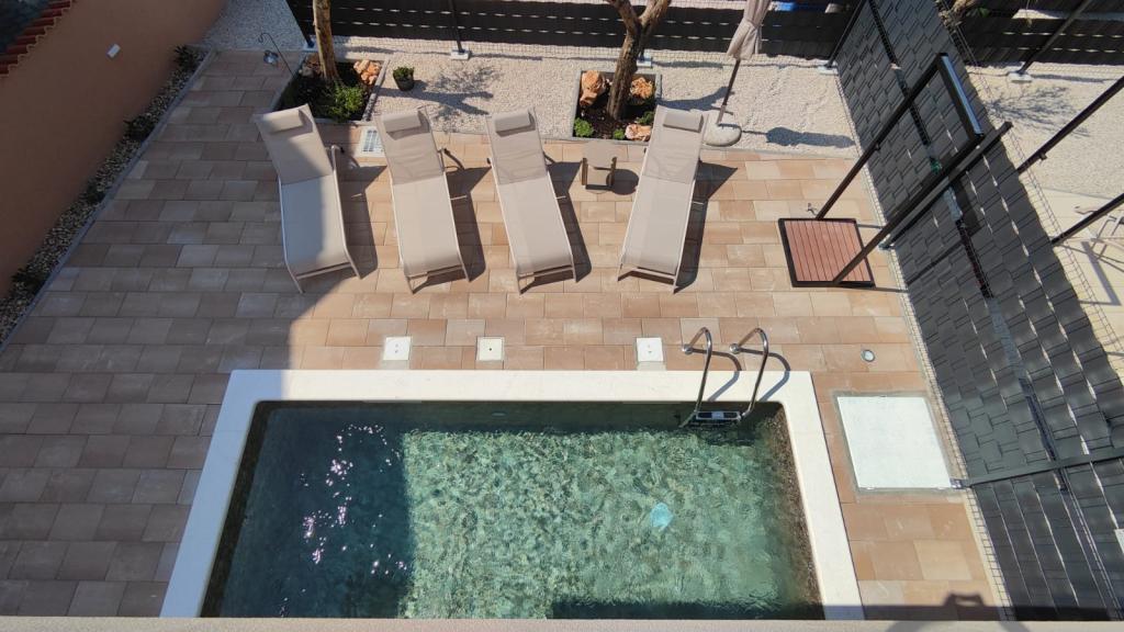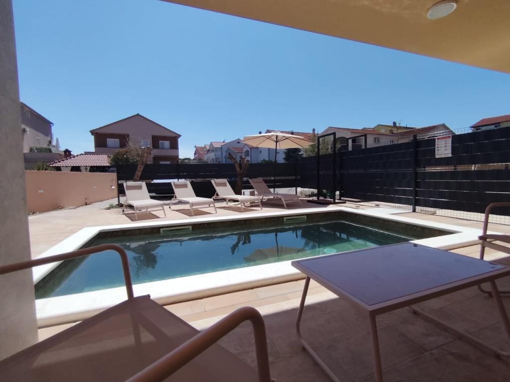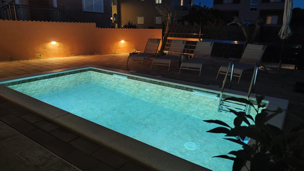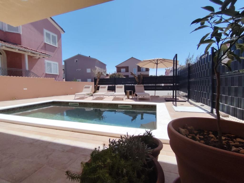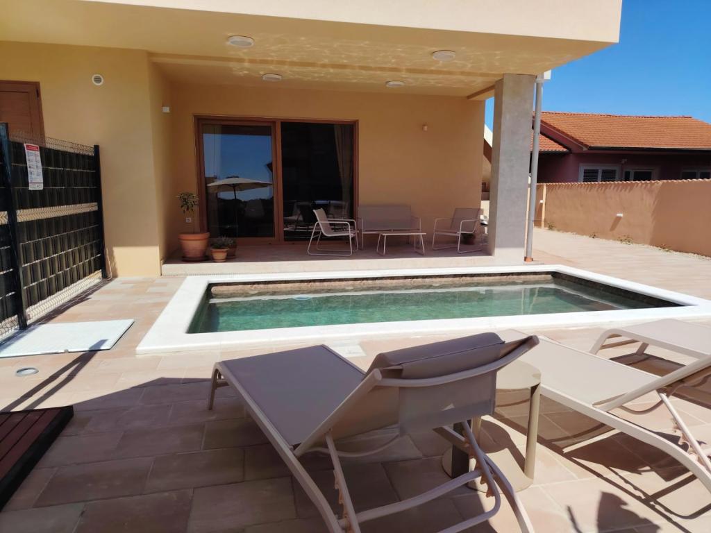 Nově postavený dvoupatrový rekreační dům s bazénem a dvěma samostatnými bytovými jednotkami (přízemí a první patro). Každá bytová jednotka má rozlohu 90 metrů čtverečních a je vybavena 3 ložnicemi, kuchyní, koupelnou, terasou a obývacím pokojem. Parkování je zajištěno.