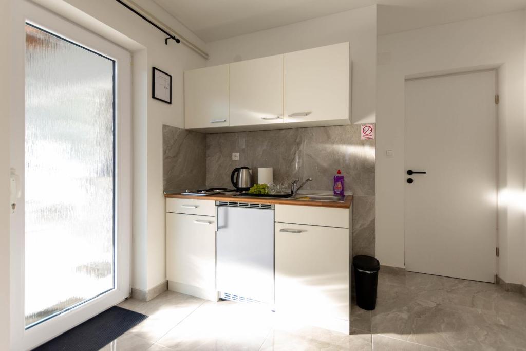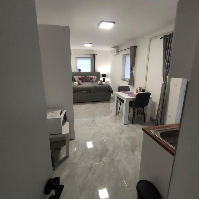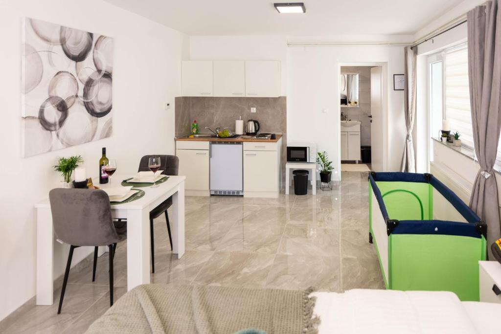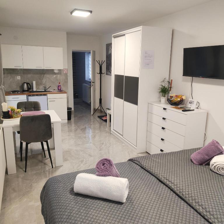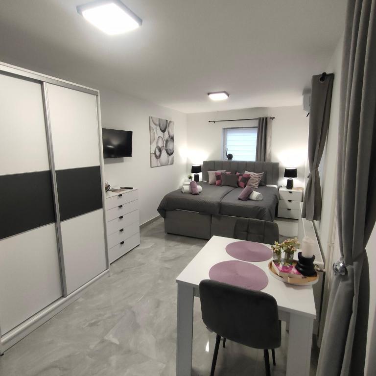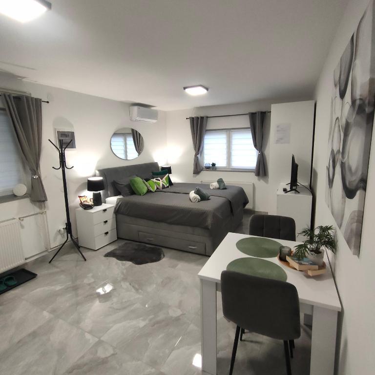 Dům se skládá ze dvou studio apartmánů. Každý studiový apartmán obsahuje 1 ložnici s plně vybavenou kuchyní, 1 koupelnu, ložní prádlo, ručníky, mýdla, sprchové gely, šampony, TV s plochou obrazovkou, společnou terasu pro vychutnávání kávy s velkou zahradou. Byt se nachází v klidné ulici cca 500 m od centra města a je zasunutý na pozemku. Vnitroblok a velká zahrada oddělují byt od cesty, což umožňuje klidný pobyt v bytě i na terase. Ve dvoře je parkoviště pro osobní auta.