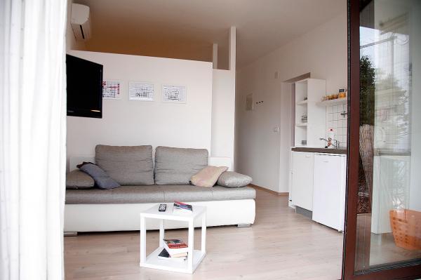 Náš dům se nachází v prestižní lokalitě, v blízkosti pláže (3 řádek), kavárny, restaurace, procházky podél pláže a centra města. Obklopený rodinných domů. Apartmány v našem domě Vám nabízíme mír, klid a velmi příjemnou atmosféru. Oba apartmány mají bezplatné Wi-Fi. Naše ubytovací jednotky jsou prostorné, jednoduché a moderní. Oni mají plně vybavenou kuchyň, koupelnu, balkon nebo terasu. Co bych zdůraznit, je jistě krásný výhled na moře a ostrovy a horského svahu.