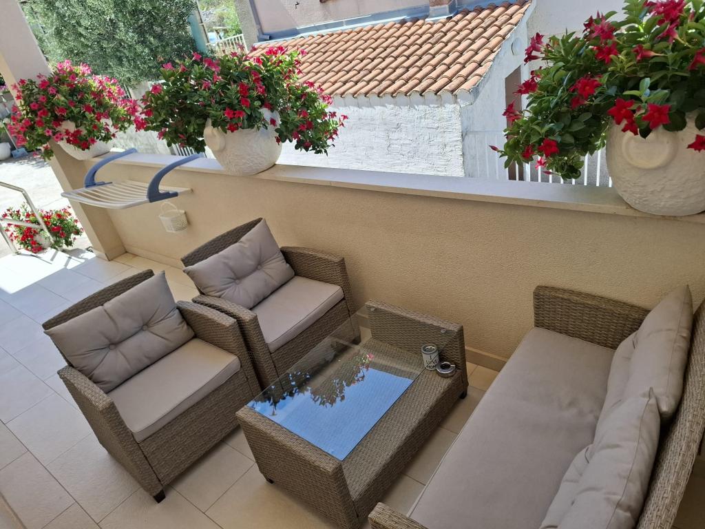 Velmi milí hostitelé, čekající na hosty, mísa se sýrem a domácí šunkou během našeho příjezdu a pobytu Čistý, uklizený byt, 2 minuty chůze od nejbližší pláže a restaurací. Byt nemá přímou terasu, můžete využít terasu v přízemí, která má částečný výhled na moře, ale to je kompenzováno čistotou a laskavostí hostitelů.