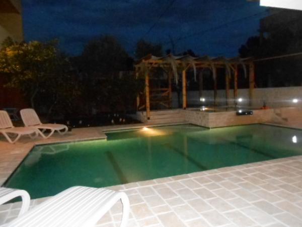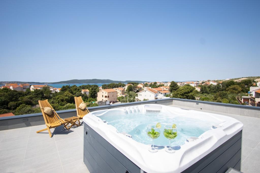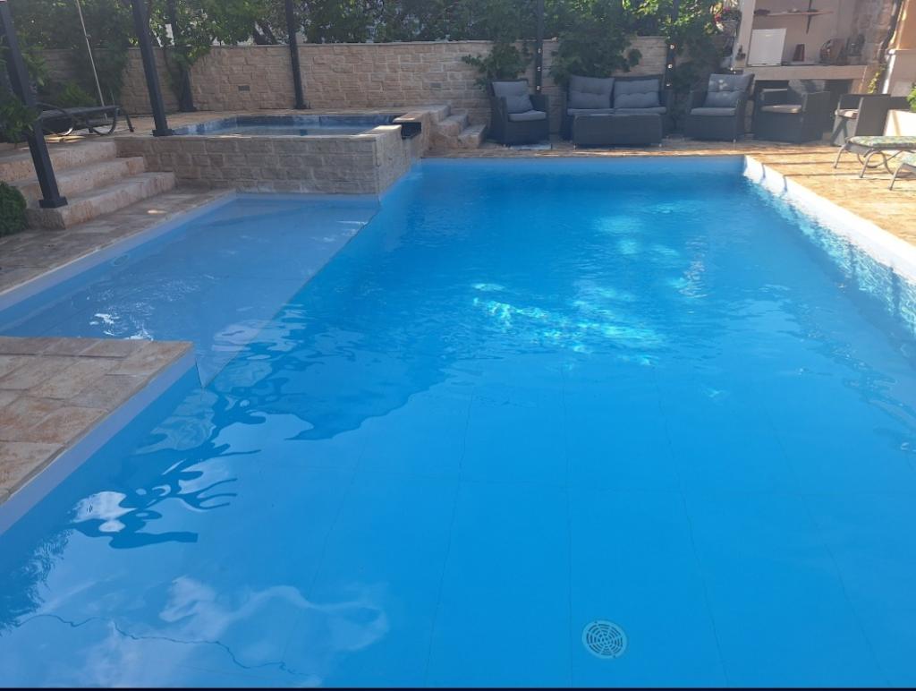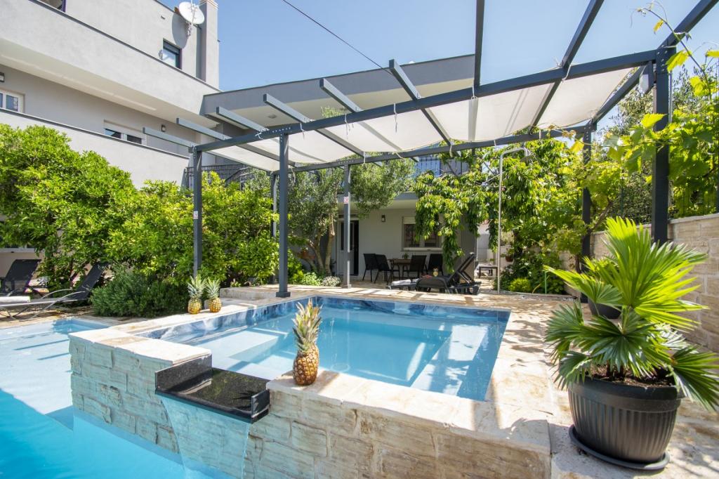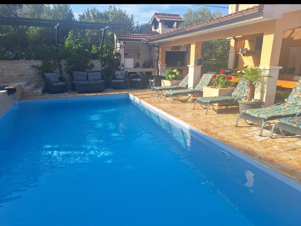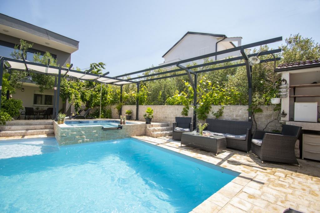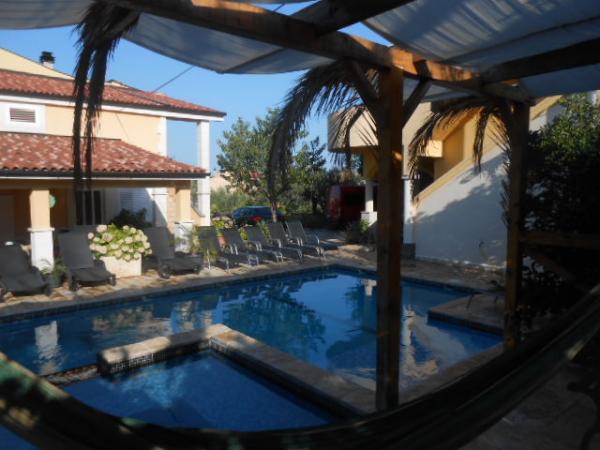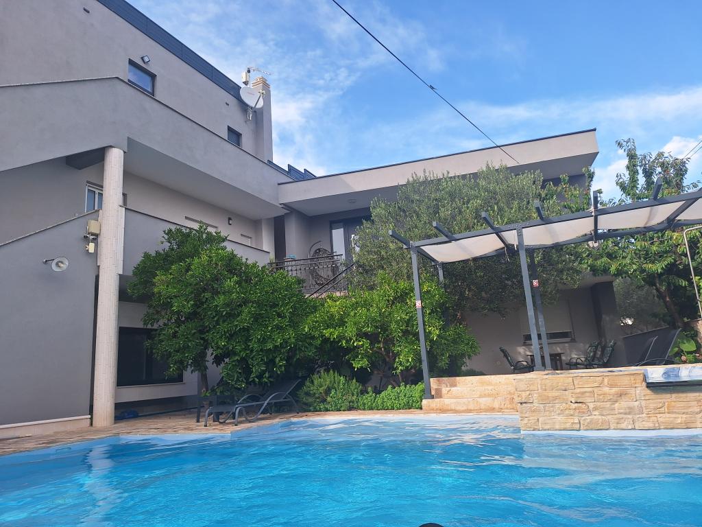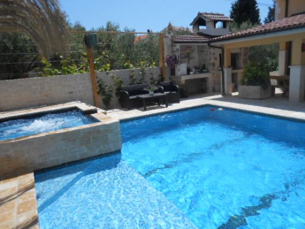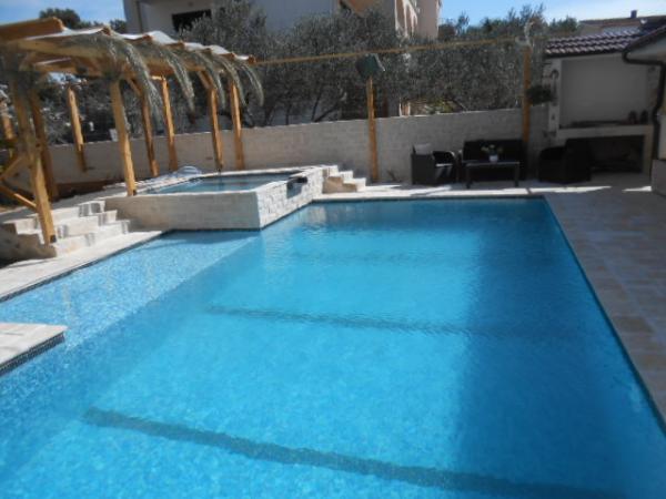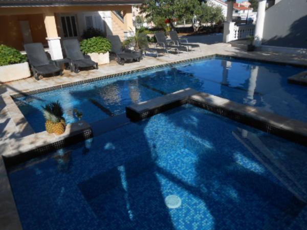 Dům pro 10 osob s bazénem a jacuzzi se nachází v klidné části Brodarica, obklopený spoustou zeleně a květin. První dva byty jsou v přízemí, jeden má 45 m2 a druhý 50 m2. Každý apartmán má ložnici s manželskou postelí, kuchyň, rozkládací pohovku, koupelnu a terasu se stolem a židlemi. Třetí apartmán je 90 m2, nachází se v prvním patře, má dvě velké dvoulůžkové ložnice, velký obývací pokoj, kuchyň, koupelnu a terasu 45 m2 se stolem a židlemi. Je vhodný pro trochu větší rodinu a přátele. Byt je klimatizovaný. Čtvrtý apartmán je luxusně zařízený, cca 100m2, má velký obývací pokoj, plně vybavenou kuchyň, velký pokoj s televizí a klimatizací, v bytě je i sauna. na střeše je vířivka s velkou terasou. každý apartmán má klimatizaci a každý pokoj má také televizi. Bazén je společný. Dům je 5-6 minut chůze od moře. Vedle domu jsou další dva byty, jeden má 110m2 luxusně zařízený a druhý 55m2.