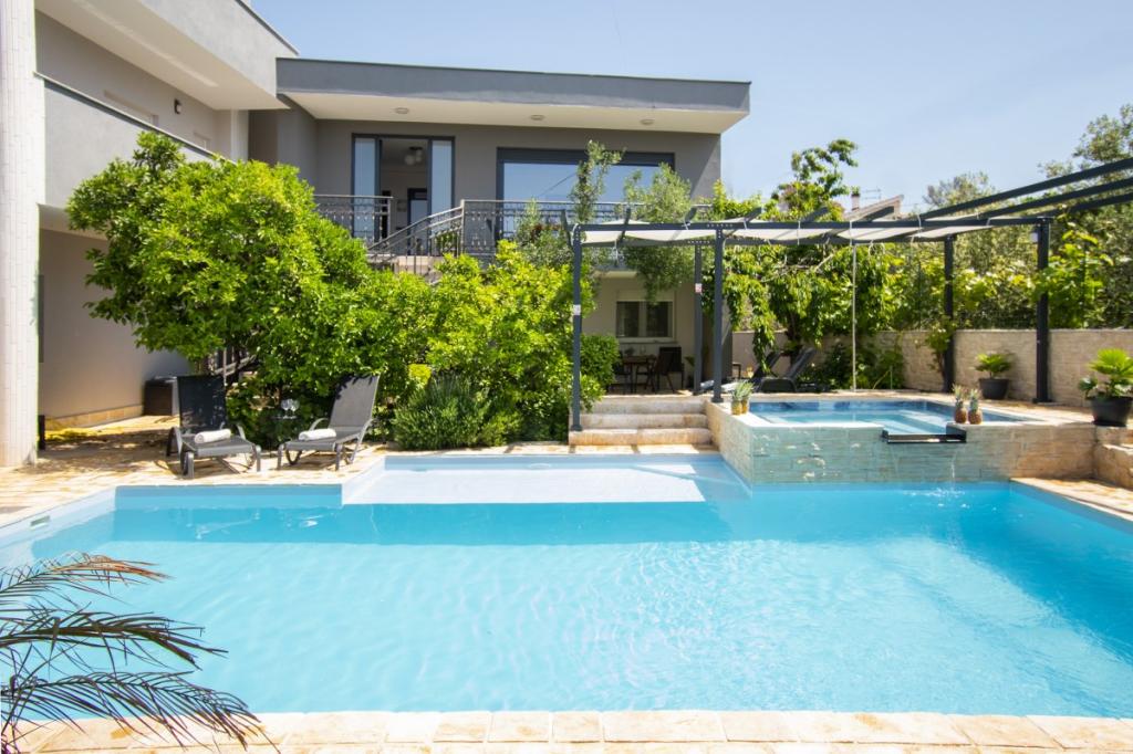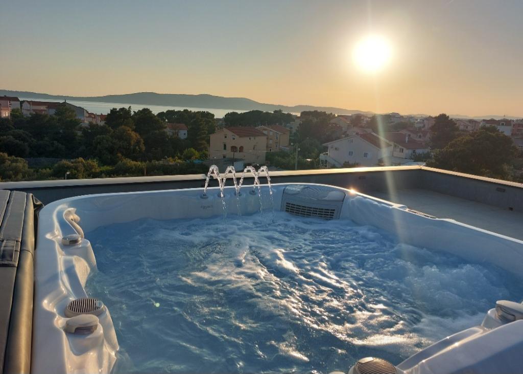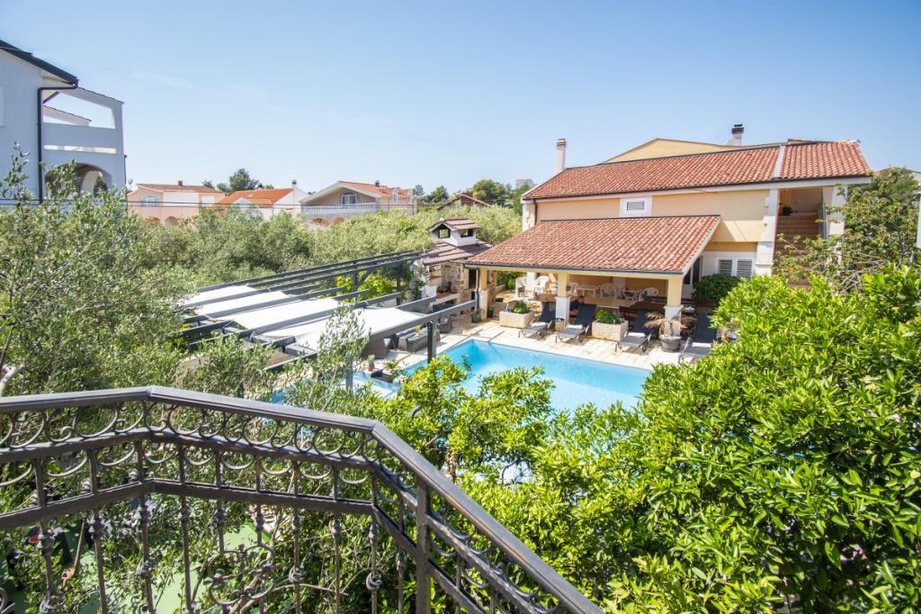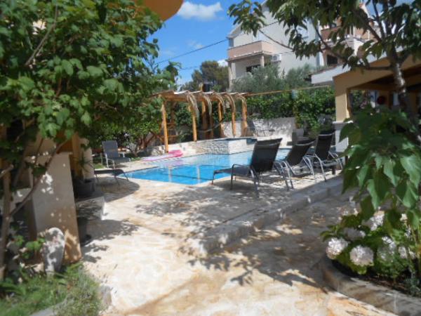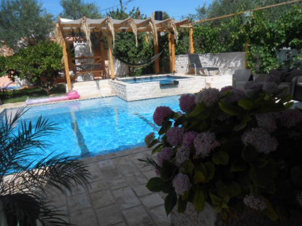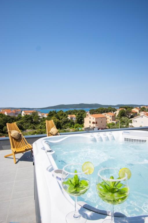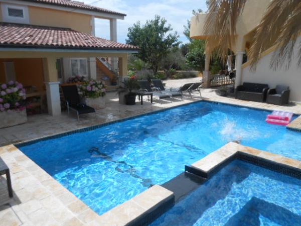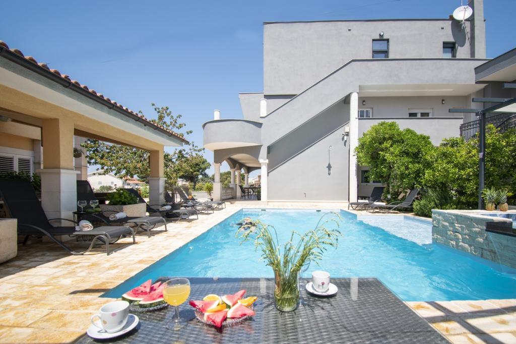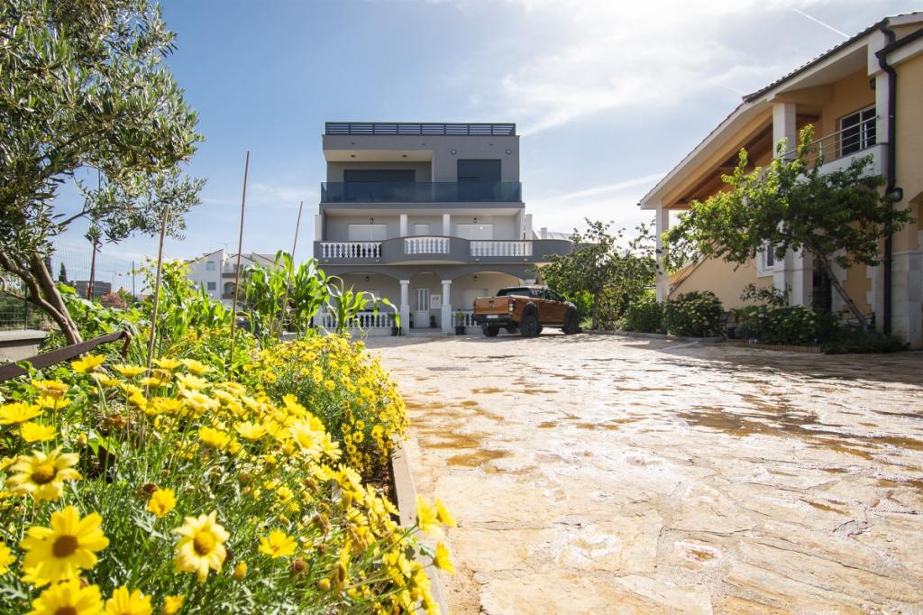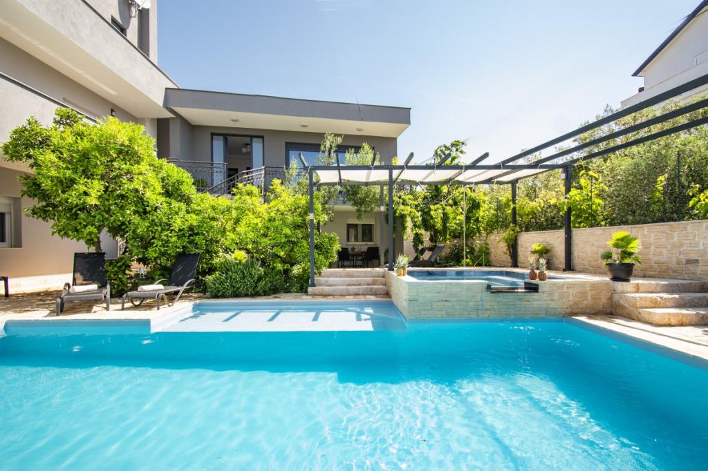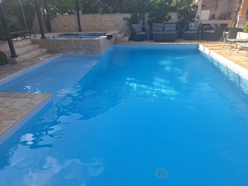 Dům pro 10 osob s bazénem a jacuzzi se nachází v klidné části Brodarica, obklopený spoustou zeleně a květin. První dva byty jsou v přízemí, jeden má 45 m2 a druhý 50 m2. Každý apartmán má ložnici s manželskou postelí, kuchyň, rozkládací pohovku, koupelnu a terasu se stolem a židlemi. Třetí apartmán je 90 m2, nachází se v prvním patře, má dvě velké dvoulůžkové ložnice, velký obývací pokoj, kuchyň, koupelnu a terasu 45 m2 se stolem a židlemi. Je vhodný pro trochu větší rodinu a přátele. Byt je klimatizovaný. Čtvrtý apartmán je luxusně zařízený, cca 100m2, má velký obývací pokoj, plně vybavenou kuchyň, velký pokoj s televizí a klimatizací, v bytě je i sauna. na střeše je vířivka s velkou terasou. každý apartmán má klimatizaci a každý pokoj má také televizi. Bazén je společný. Dům je 5-6 minut chůze od moře. Vedle domu jsou další dva byty, jeden má 110m2 luxusně zařízený a druhý 55m2.