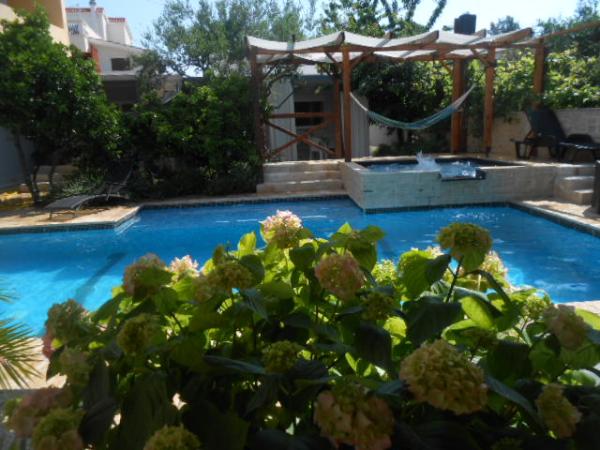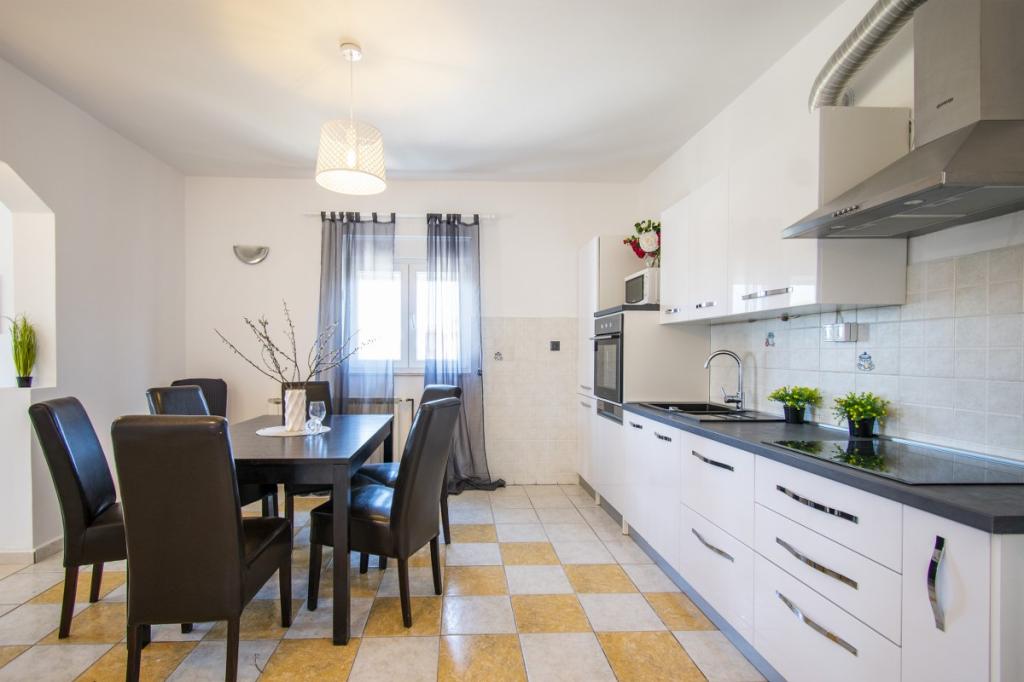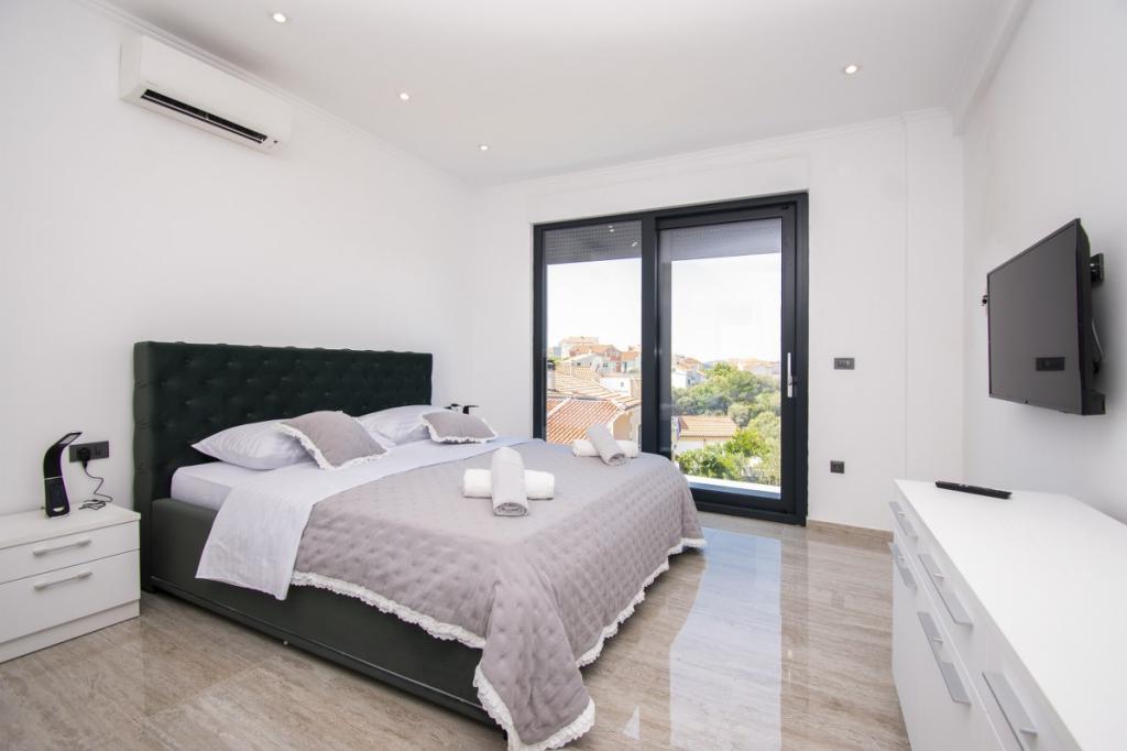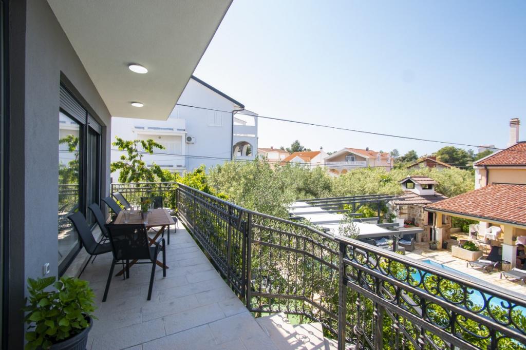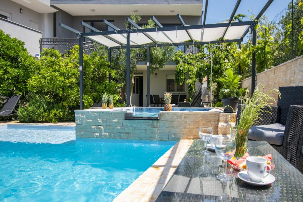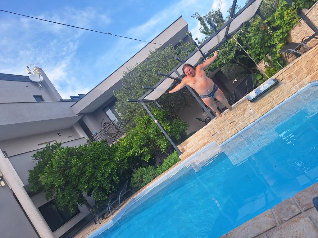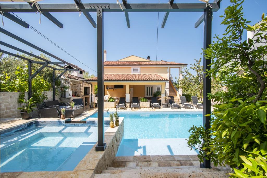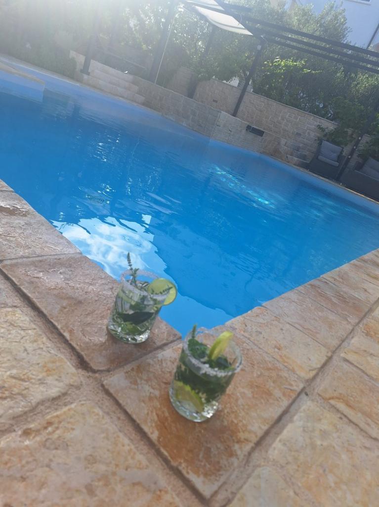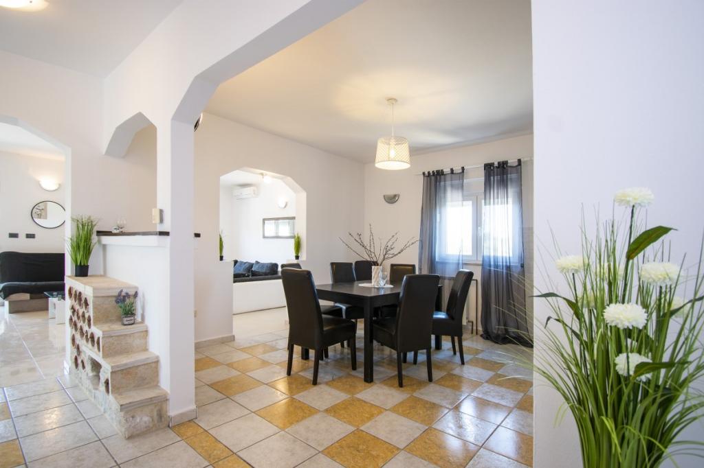 Dům pro 10 osob s bazénem a jacuzzi se nachází v klidné části Brodarica, obklopený spoustou zeleně a květin. První dva byty jsou v přízemí, jeden má 45 m2 a druhý 50 m2. Každý apartmán má ložnici s manželskou postelí, kuchyň, rozkládací pohovku, koupelnu a terasu se stolem a židlemi. Třetí apartmán je 90 m2, nachází se v prvním patře, má dvě velké dvoulůžkové ložnice, velký obývací pokoj, kuchyň, koupelnu a terasu 45 m2 se stolem a židlemi. Je vhodný pro trochu větší rodinu a přátele. Byt je klimatizovaný. Čtvrtý apartmán je luxusně zařízený, cca 100m2, má velký obývací pokoj, plně vybavenou kuchyň, velký pokoj s televizí a klimatizací, v bytě je i sauna. na střeše je vířivka s velkou terasou. každý apartmán má klimatizaci a každý pokoj má také televizi. Bazén je společný. Dům je 5-6 minut chůze od moře. Vedle domu jsou další dva byty, jeden má 110m2 luxusně zařízený a druhý 55m2.