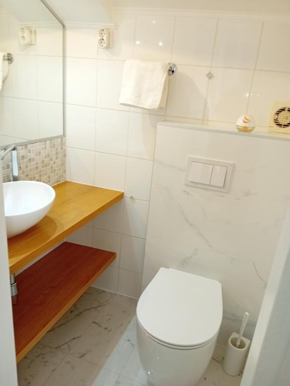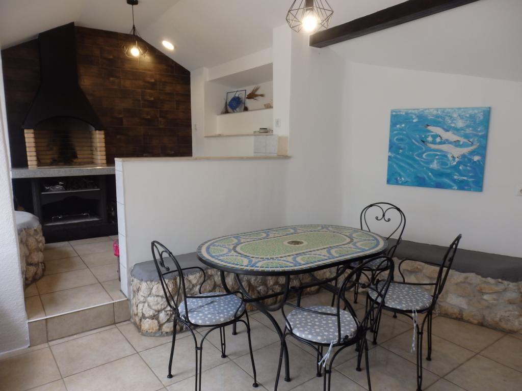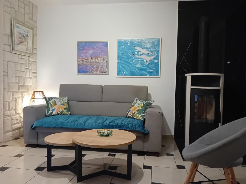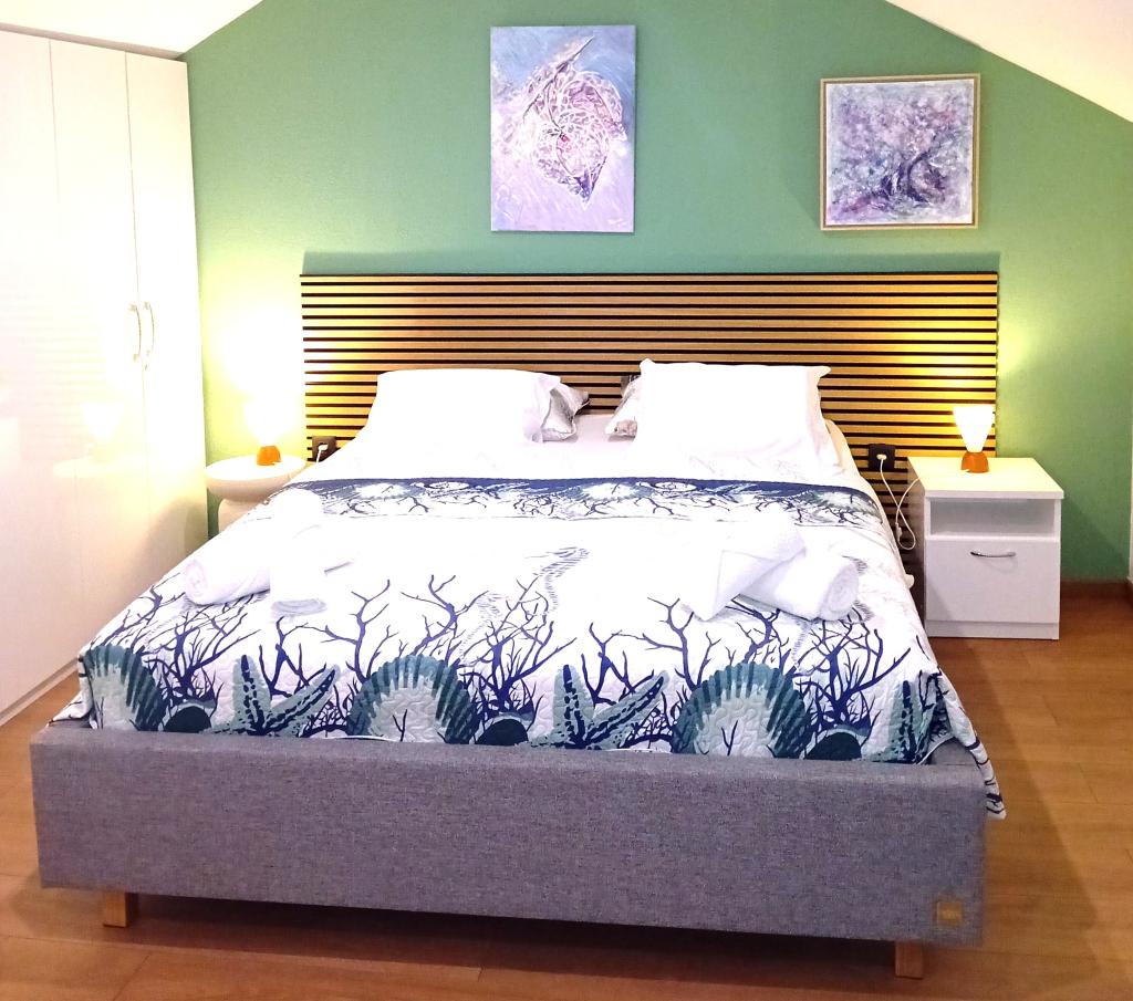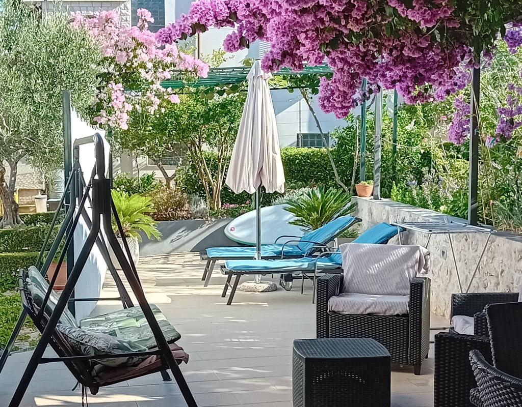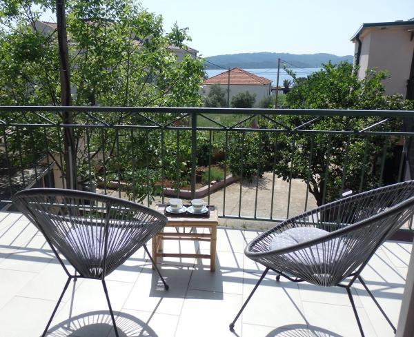 Moderně zařízený apartmán s výhledem na moře, velkou terasou a zahradou, blízko pláže, 4 hvězdičky. Apartmán se nachází v domě (přízemí a první patro). V přízemí se nachází: vstupní prostor, kuchyň, obývací pokoj a koupelna. Obývací pokoj je vybaven rozkládací pohovkou pro dvě osoby. V prvním patře se nachází: ložnice, koupelna (se samostatným sprchovým koutem a toaletou) a krytý balkon o rozloze 10 m² s výhledem na moře. Ložnice má pohodlnou manželskou postel a křeslo, které se dá rozložit na dětskou postýlku. Z kuchyně v přízemí je vstup na terasu o rozloze 45 m². Gril a jídelní stůl se nacházejí v kryté části (15 m²) a zbývající část je určena k opalování a relaxaci s výhledem do zahrady.