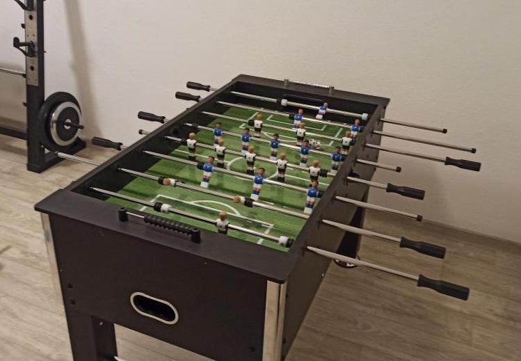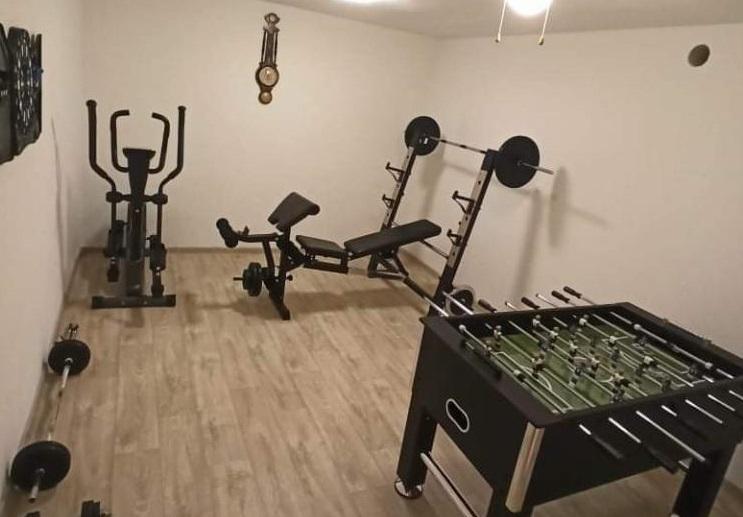 Zábavní a fitness místnost v suterénu, která je zahrnuta v ceně, je vybavena cvičebními stroji, eliptickým trenažérem, stolním fotbálkem, šipkami a jízdním kolem - ideální pro rekreaci a rodinnou zábavu.