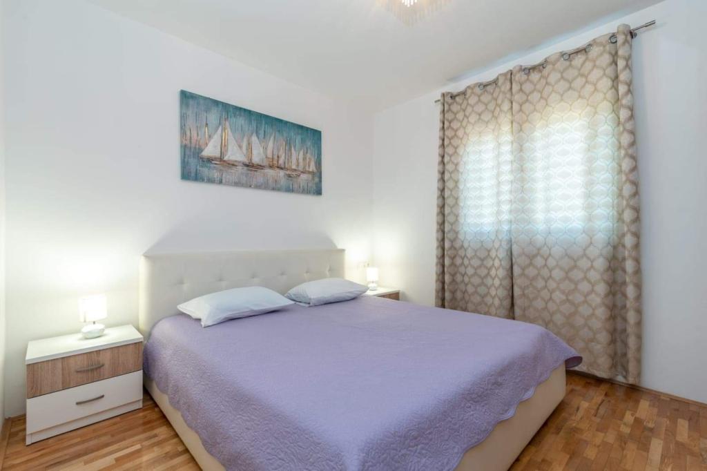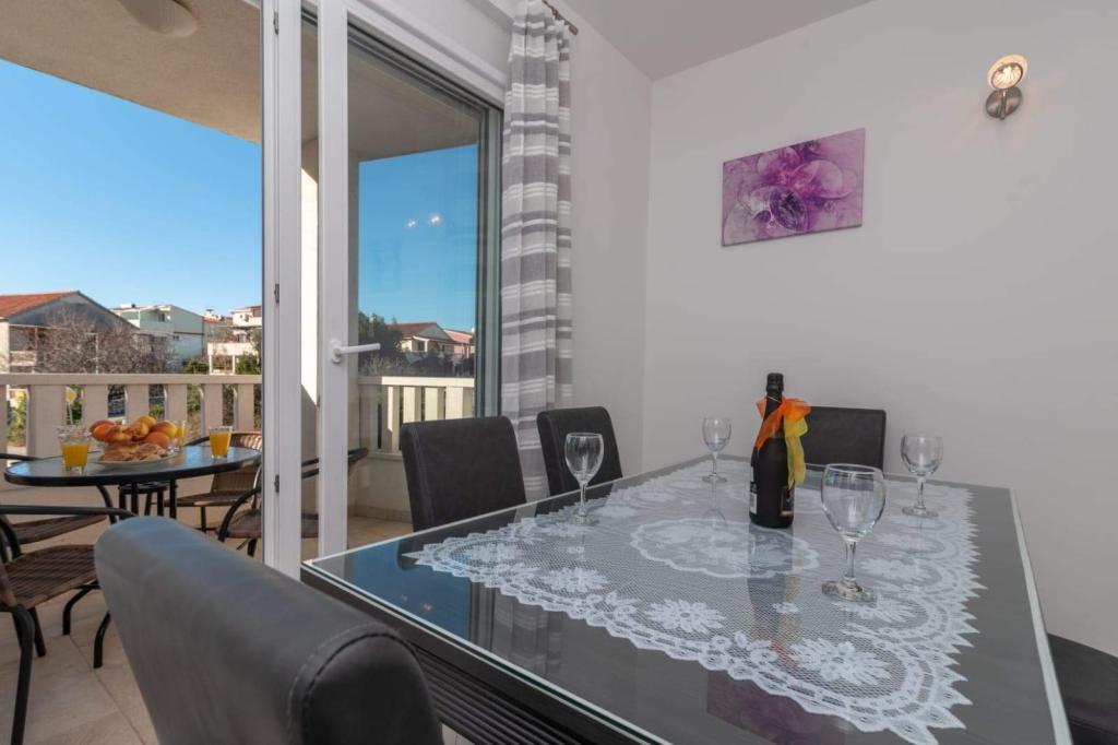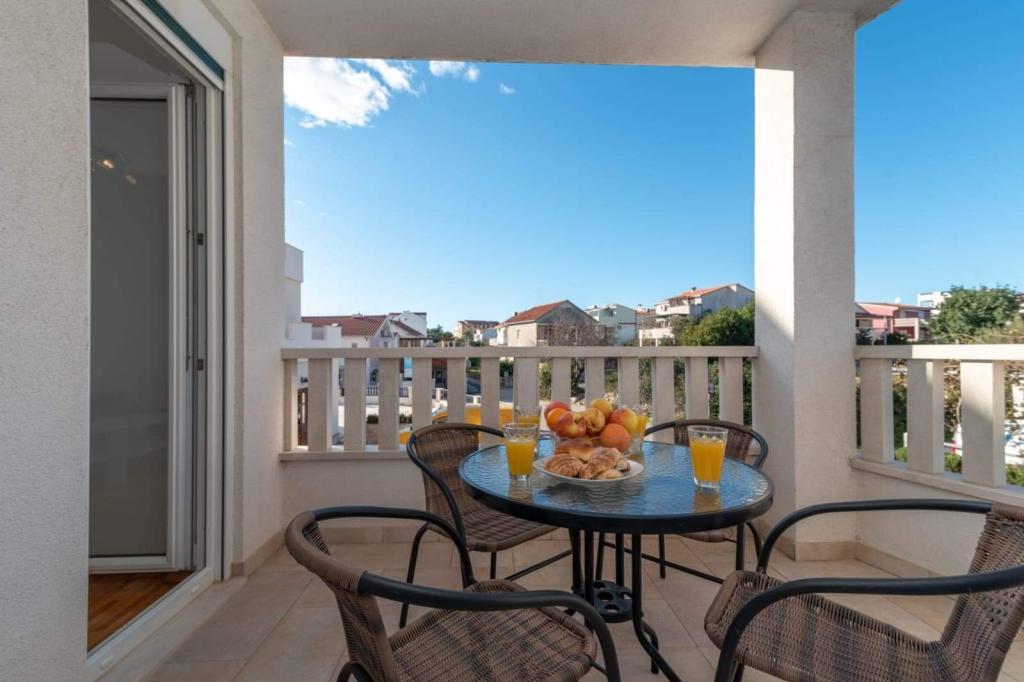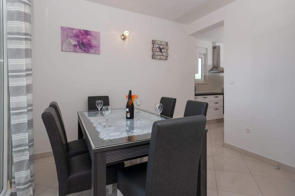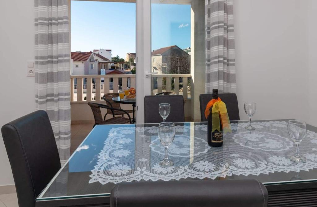 Apartmán se nachází na ostrově Čiovo, v klidné zátoce Okrug Gornji – Rastići, ideální pro rodinnou dovolenou. Je vzdálený 200 m od skalnatých pláží a 400 m od písečných pláží, zatímco slavná pláž Copacabana je vzdálená 1,6 km. Město Trogir, které je zapsáno na seznamu UNESCO, je vzdálené jen pár kilometrů. Apartmán se nachází v prvním patře, má rozlohu 72,5 m² s balkonem o velikosti 7 m² a může ubytovat až 6 osob (7 v případě potřeby), včetně dětské postýlky. Hosté mohou využívat klimatizaci, bezplatné Wi-Fi a soukromé parkovací místo. Zvláštností apartmánu je fitness centrum a herna v suterénu, které jsou zahrnuty v ceně a jsou vybaveny posilovacími stroji, eliptickým trenažérem, stolním fotbalem, šipkami a jízdním kolem – ideální pro rekreaci a rodinnou zábavu.
