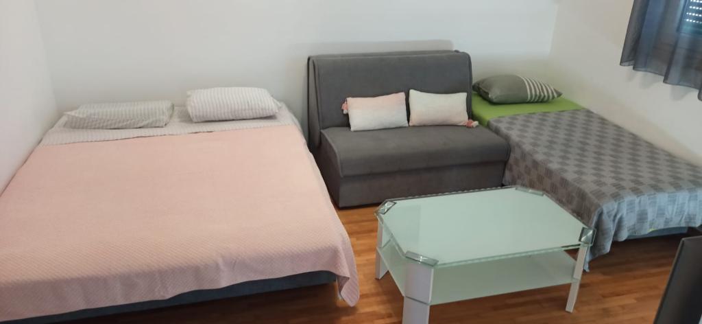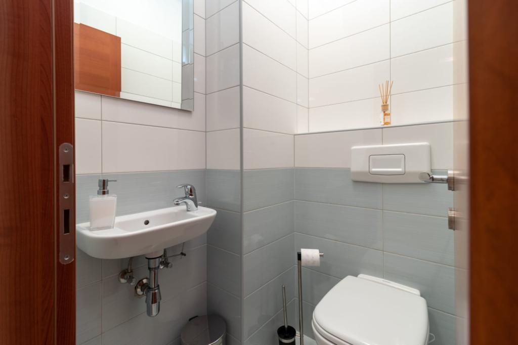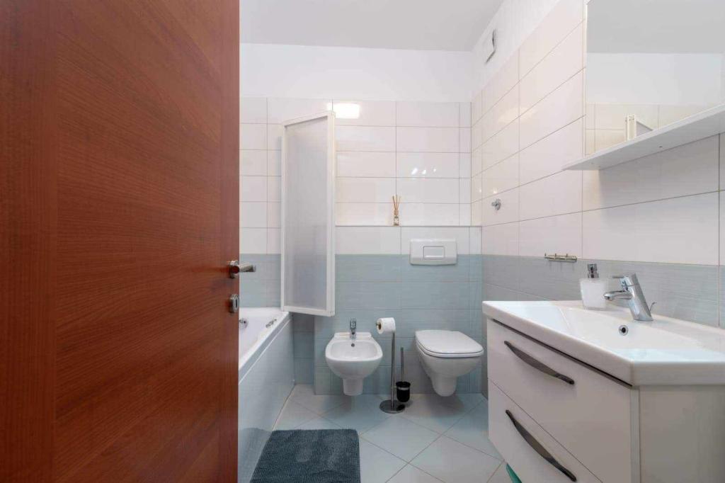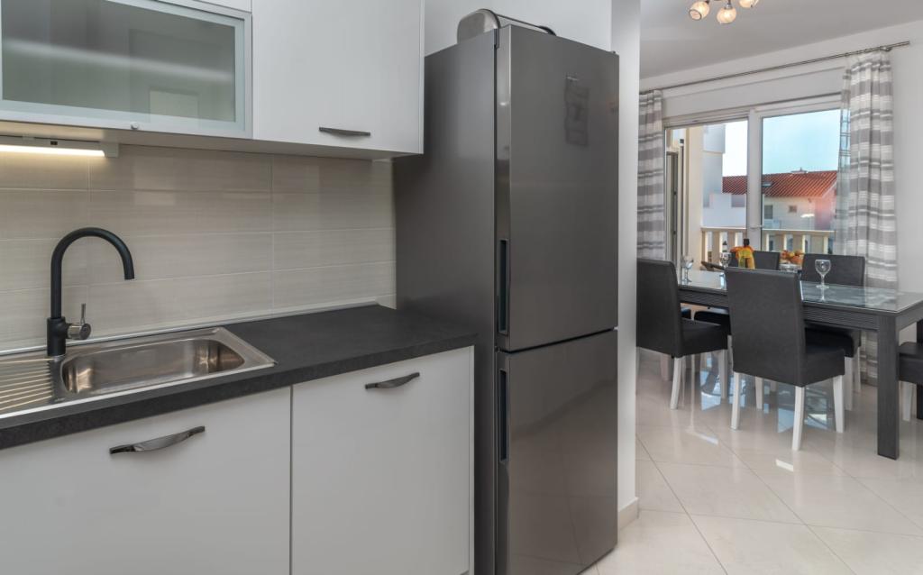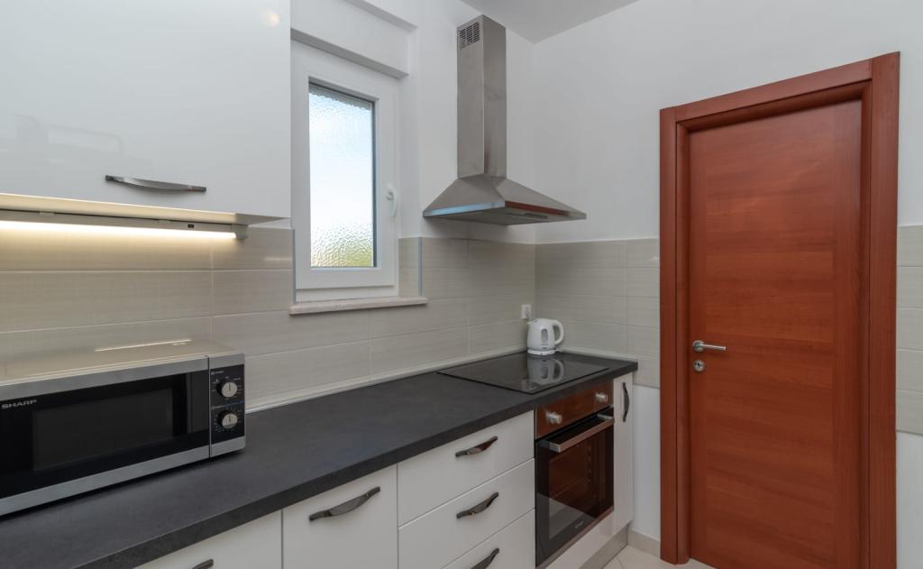 Apartmán se nachází na ostrově Čiovo, v klidné zátoce Okrug Gornji – Rastići, ideální pro rodinnou dovolenou. Je vzdálený 200 m od skalnatých pláží a 400 m od písečných pláží, zatímco slavná pláž Copacabana je vzdálená 1,6 km. Město Trogir, které je zapsáno na seznamu UNESCO, je vzdálené jen pár kilometrů. Apartmán se nachází v prvním patře, má rozlohu 72,5 m² s balkonem o velikosti 7 m² a může ubytovat až 6 osob (7 v případě potřeby), včetně dětské postýlky. Hosté mohou využívat klimatizaci, bezplatné Wi-Fi a soukromé parkovací místo. Zvláštností apartmánu je fitness centrum a herna v suterénu, které jsou zahrnuty v ceně a jsou vybaveny posilovacími stroji, eliptickým trenažérem, stolním fotbalem, šipkami a jízdním kolem – ideální pro rekreaci a rodinnou zábavu.