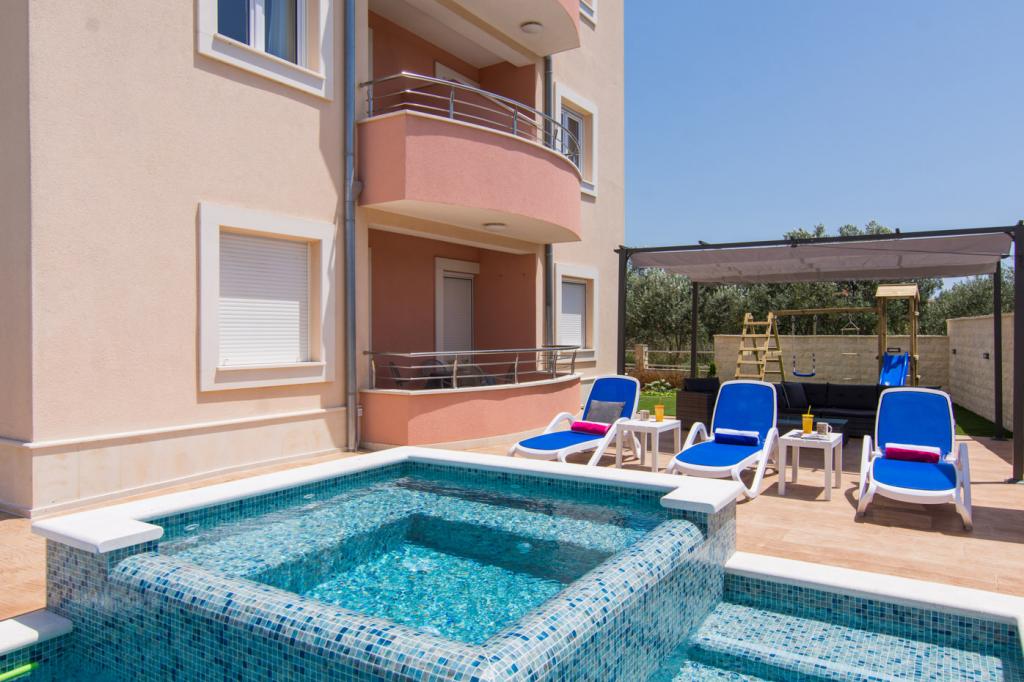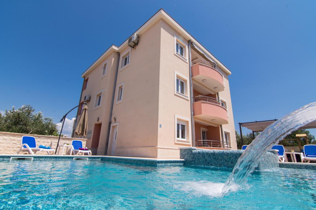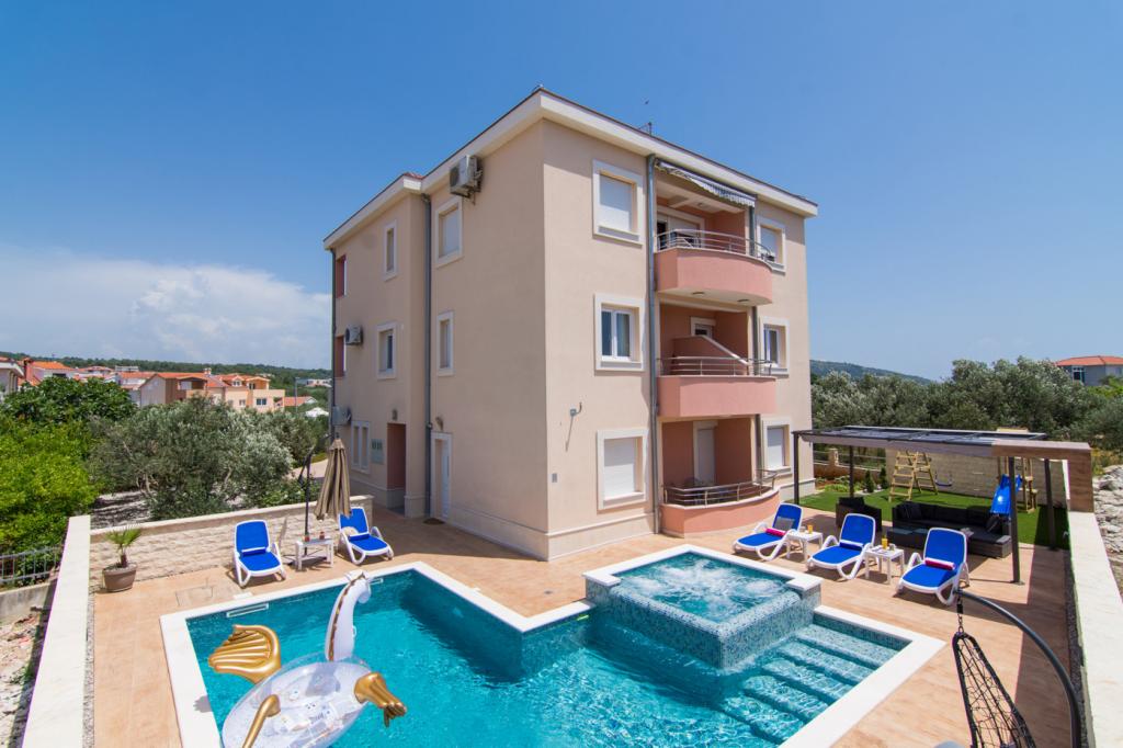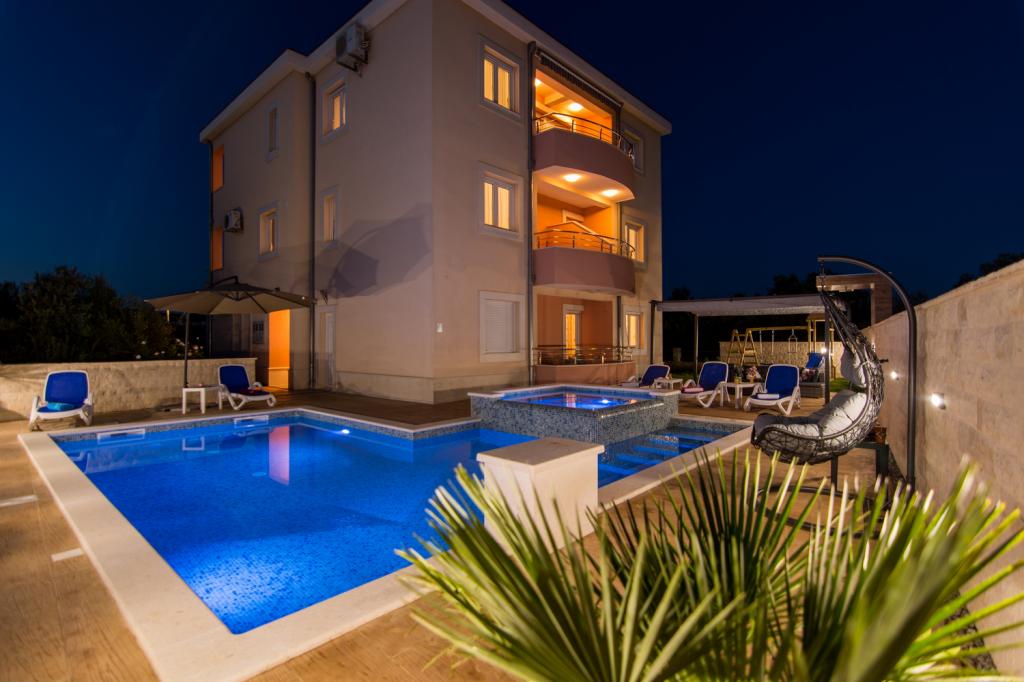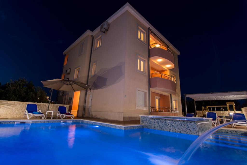 Moderně vybavené, klimatizované apartmány Villa Peky se nacházejí v rodinném domě na ostrově Čiovo v Okrug Gornji. Dva apartmány A2 2 a jeden apartmán 4 2 mohou pojmout až 14 osob. Před domem je parkoviště pro hosty. V zadní části domu je vyhřívaný bazén s jacuzzi, dětské hřiště a zastřešený venkovní gril s velkým stolem. Nejoblíbenější destinací v regionu Trogir je Okrug Gornji na ostrově Čiovo s krásnou pláží. Stará vesnice Okrug se nachází na vrcholu malého kopce, na jehož úpatí je rybářský přístav, asi 4 km od centra Trogiru nebo 8 km od letiště ve Splitu. Na pláži v Okrug Gornji si můžete pronajmout skútr, vodní skútr, můžete si užít parasailing a další aktivity na moři. Během léta si v Okrug můžete užít i stín kaváren nebo restaurací, které kromě jiných jídel nabízejí i dalmatské speciality. Potápěčská škola Trogir Diving Center v Mavarčici vás seznámí s krásami podmoří střední Dalmácie.
