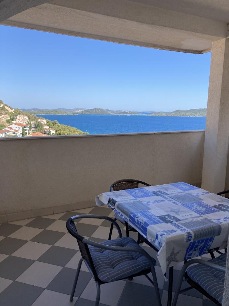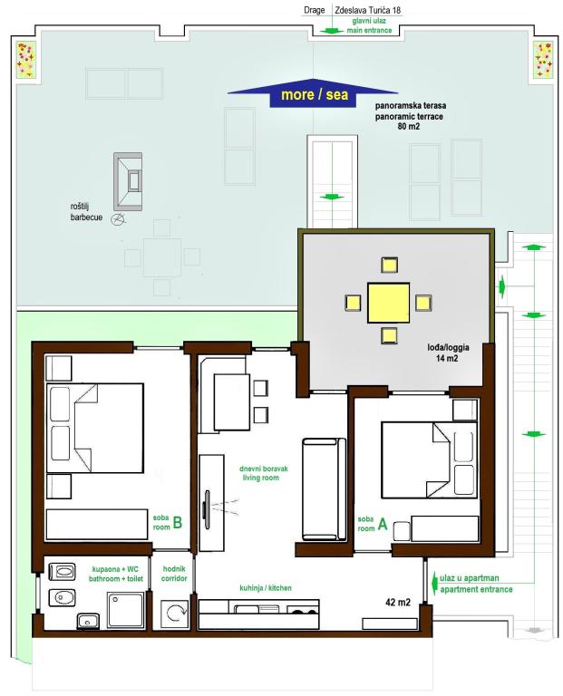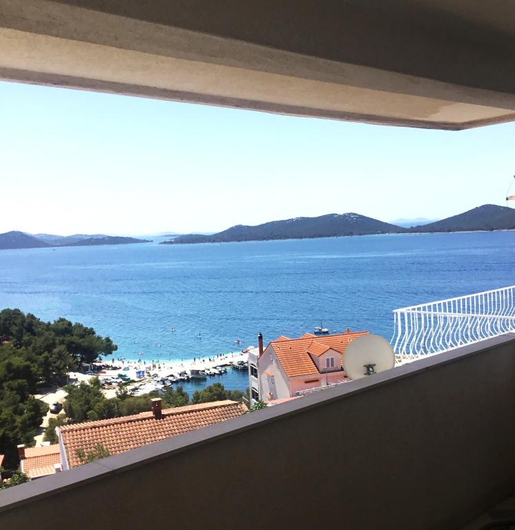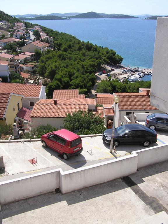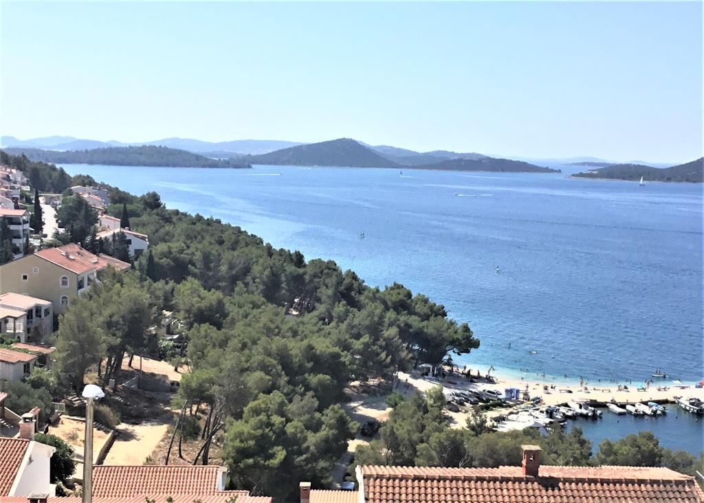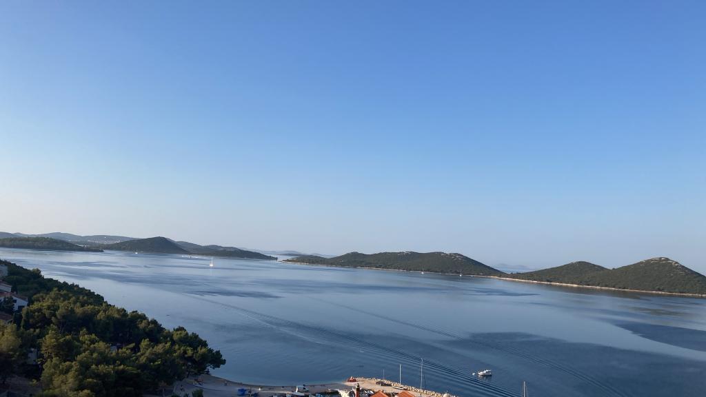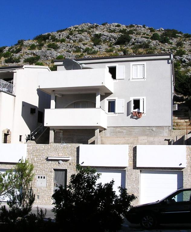 Nemovitost se nachází ve 3. řadě víkendové osady v zátoce Dolaška draga, která je součástí města Drage, přibližně 100 m (vzdušnou čarou) od moře a pláží, které se táhnou podél osady až k hustému borovému lesu a promenádě. Vzhledem k dominantní nadmořské výšce pozemku (přibližně 50 m nad mořem) mají všechny apartmánové pokoje a terasy krásný panoramatický výhled na samotnou víkendovou osadu, místní přístav, okolní pláže, blízké ostrovy a město Murter a Kornatské ostrovy v dálce. Vzdálenost od pozemku k moři (pláže obklopené hustými borovými lesy a promenádou) je přibližně 300 m po příjezdové cestě přes víkendovou osadu Dolaška draga; pěšky kolem silnice (přibližně 10 min) nebo autem (2 min). K moři se lze dostat pěšky rychleji (5 minut), pokud použijete krátký úsek příjezdové cesty a jedno z několika schodišť ve víkendové vesničce, které je účelově postaveno pro přístup k moři, pláži, promenádě, borovému lesu, přístavu, kavárně atd. Objekt má dva apartmány (ve 2. a 3. patře), z nichž je pronajímán pouze apartmán ve 2. patře, a hostitelé (2-4 osoby) se v létě ubytovávají v apartmánu ve 3. patře, takže jsou denně k dispozici a ve službách hostů, aniž by narušovali jejich klid a soukromí. Hosté mají k dispozici 1 parkovací místo pro auto v garáži objektu a na panoramatické terase (80 m2) nad garáží (1. patro) mohou neomezeně využívat příslušné vybavení (gril, zahradní stůl se 4 židlemi a 2 lehátky).