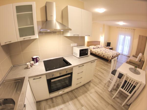 Nový klimatizovaný apartmán. Nádherný výhled, velká terasa. Dobře vybavená kuchyň. Velký světlý obývací pokoj. Malá terasa v ložnici. Parkovací místo. Restaurace vedle. Přátelští majitelé.