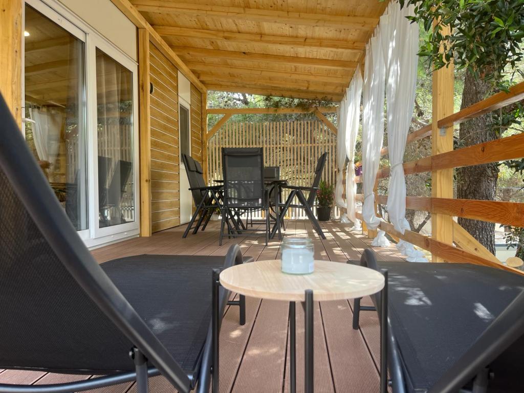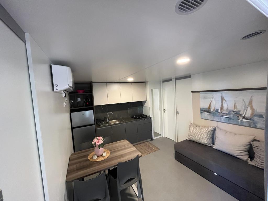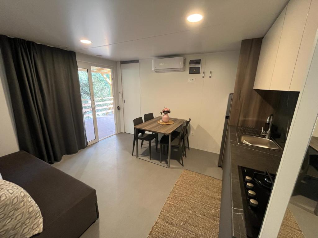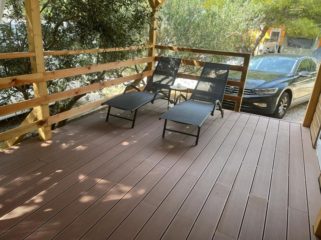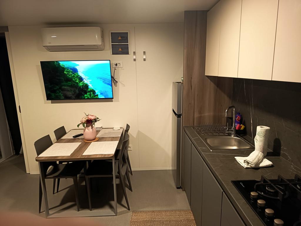 Mobilní dům o velikosti 35m2 s terasou o velikosti 24m2, nový, plně vybavený, se nachází v kempu Oaza Mira. Kemp je kategorizován jako 4****. V areálu kempu se nachází sociální zařízení s možností využití pračky, tenisové kurty, dětské hřiště, restaurace, kavárny, bazén. V blízkosti kempu se nachází také několik pláží s modrou vlajkou, přístav, promenády. Vzdálenost od kempu: - Pakoštane 4 km - Biograd na Moru - Vranské jezero 3 km - Zadar 39 km - Národní park Krka 36 km - Šibenik 24 km - Vodice 20 km Dům nabízí: - pokoj s manželskou postelí 160x200 cm - pokoj se dvěma samostatnými lůžky 90x200 cm - obývací pokoj s rozkládací pohovkou pro 2 osoby - 2 koupelny se sprchou a WC - kuchyň vybavenou pro 6 osob - lednici s mrazákem - rychlovarnou konvici - sklokeramickou varnou desku se 4 plynovými hořáky - myčku nádobí - Wi-Fi, Smart TV + Netflix - jídelní stůl + 4 židle - 2 lehátka, stůl a 6 židlí - 2 parkovací místa před mobilním domem, - ložní prádlo a ručníky