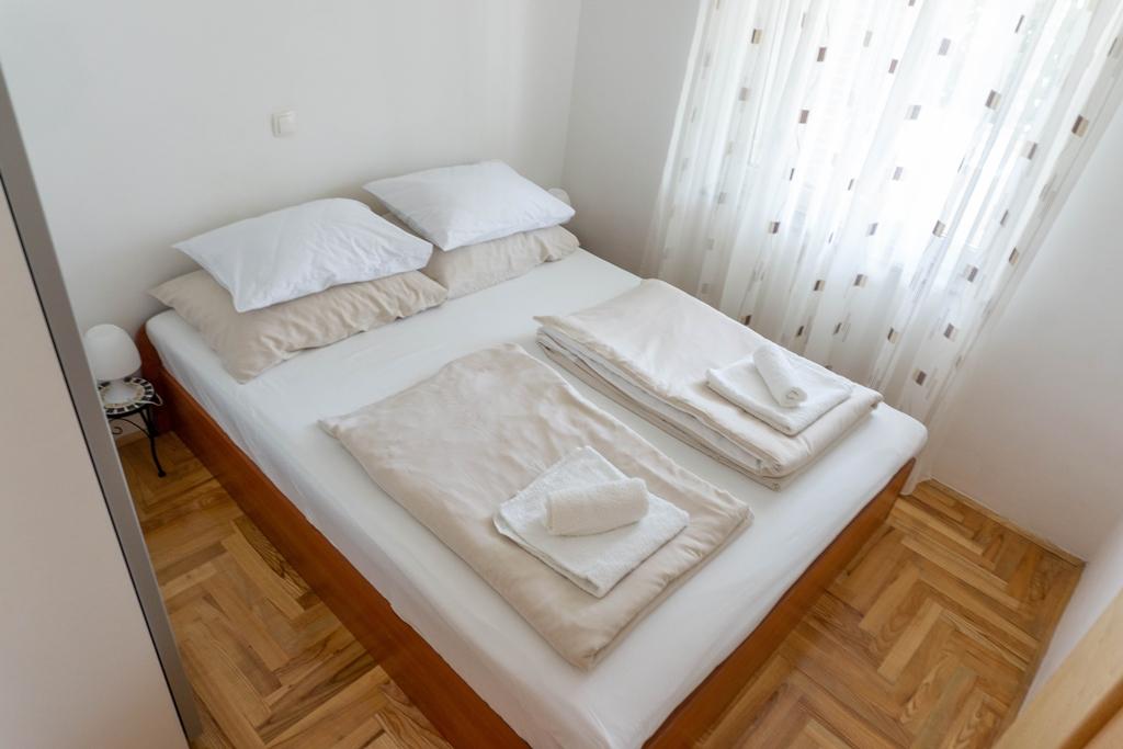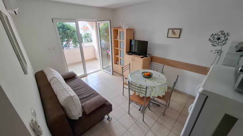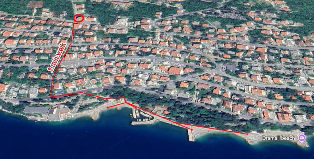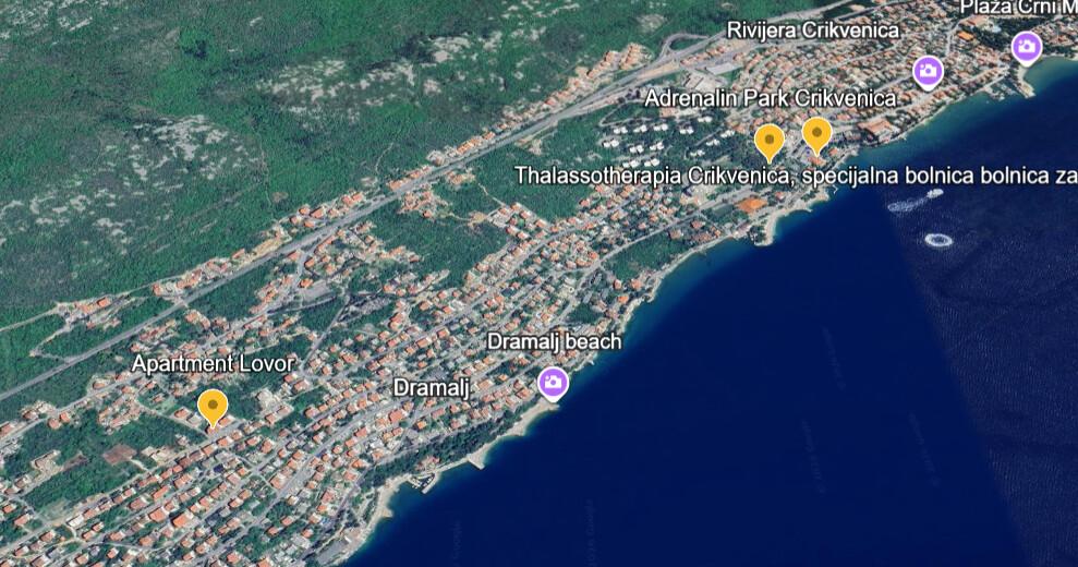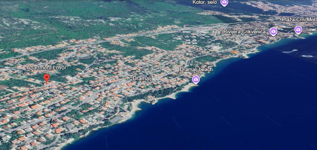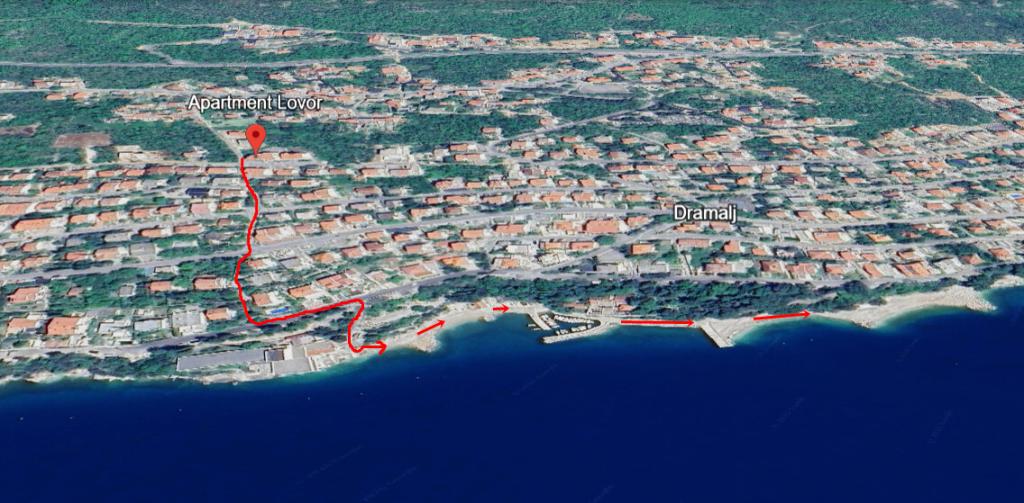 Apartmán Lovor (31 m²) v přízemí obytného domu, klidná lokalita v Dramalji. Vzdálenost 450 m (10–15 min chůze) od moře, v blízkosti Thalassotherapia, Adrenalin parku a turistických tras. Ideální pro dvě až tři dospělé osoby nebo rodinu se dvěma dětmi. Obsahuje ložnici (160x200), koupelnu, terasu a vybavenou kuchyni (lednice s mrazákem, sporák, mikrovlnná trouba, rychlovarná konvice, kávovar, topinkovač, nádobí) spojenou s obývacím pokojem (TV, pohovka 75x200 / 150x200). Apartmán je klimatizovaný, má bezplatné Wi-Fi a zajištěné parkování ve dvoře.