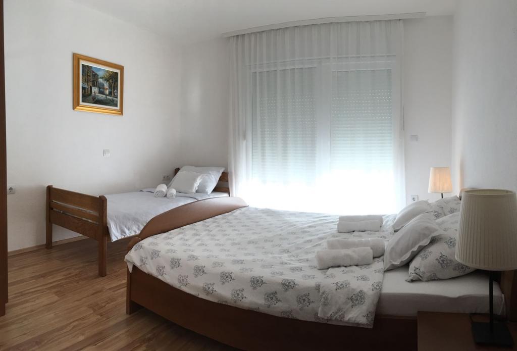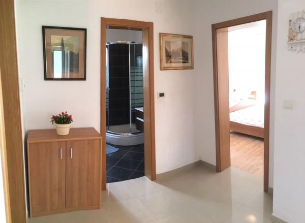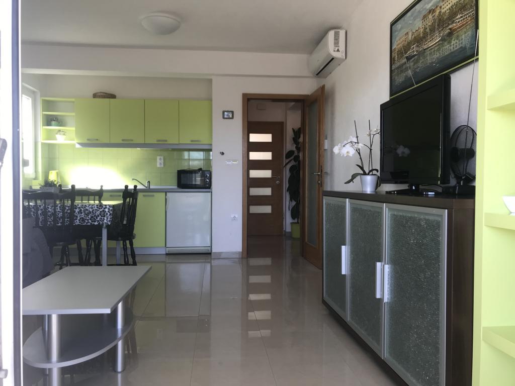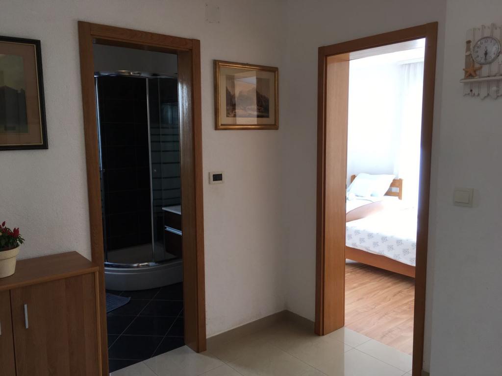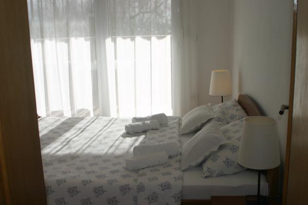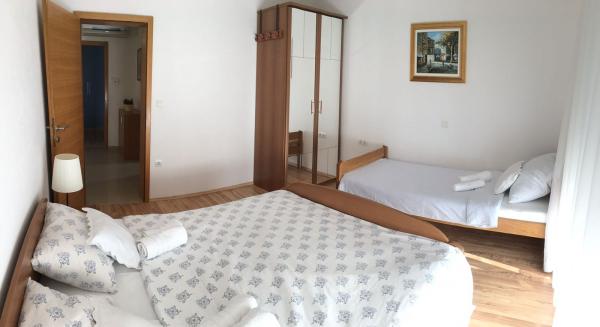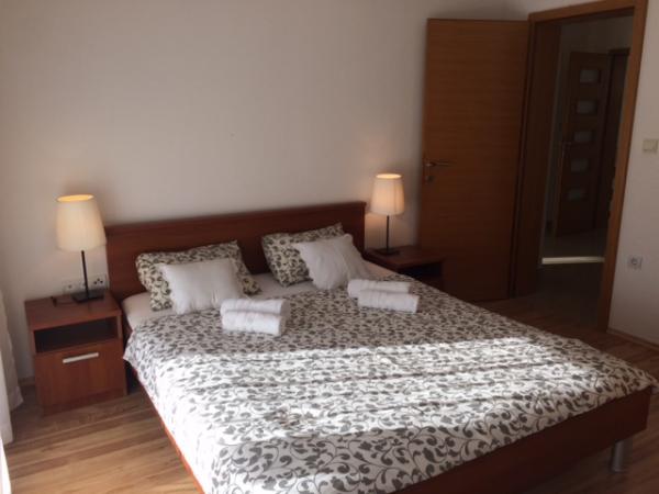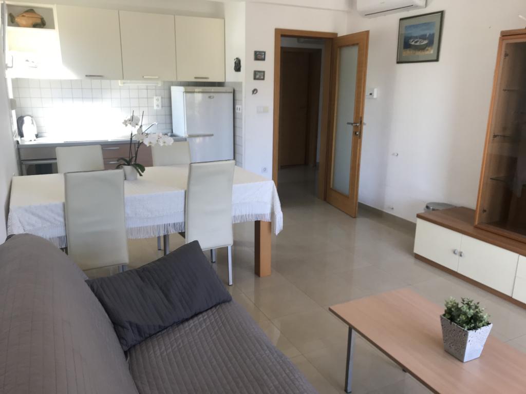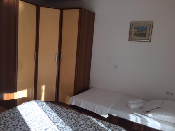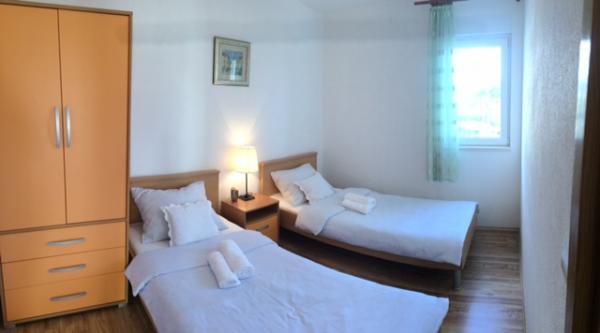 V domě jsou dva byty o velikosti 75m2. Každý apartmán má dvě ložnice, jeden pokoj má dvě lůžka a druhý tři lůžka. V prostorné kuchyni s obývacím pokojem je možnost ubytování pro dvě osoby na gauči. Na chodbě je koupelna s toaletou a toaletou. Oba apartmány mají prostorný balkon s výhledem na moře. V přízemí jsou garáže pro auta. Na pláž, která je 150 metrů od domu, je nutné přejít silnici. Na krátkou vzdálenost je na výběr mezi několika druhy pláží a hloubkou moře. Vhodné pro děti. Na pláži si kromě koupání a opalování můžete vybrat z různých doplňkových forem zábavy. Vzdálenost k stánku s chlebem je 50 metrů, obchody 200 metrů a v okolí několik typů restaurací.