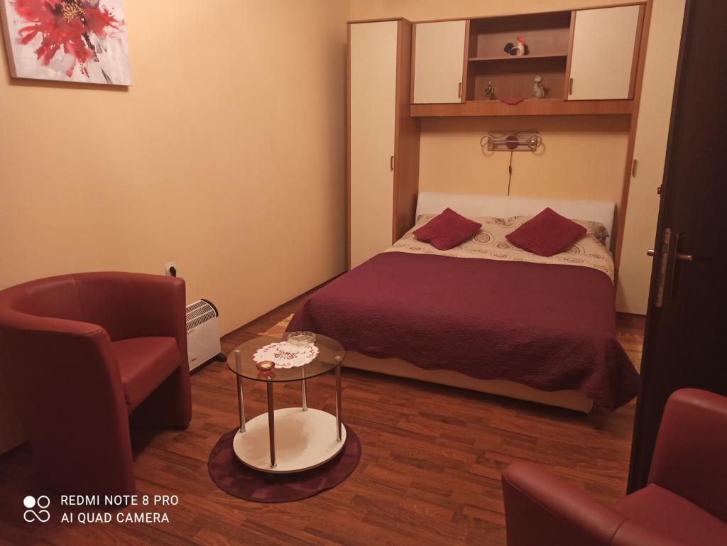 Elegantní dvoulůžkový pokoj pro dva s koupelnou. Apartmán pro 4 osoby s koupelnou a kuchyní. Samostatný vchod, terasa, vlastní dvůr, stín, aljmas centrum. Kostel, Dunaj, tržnice, vše 100 metrů od budovy.