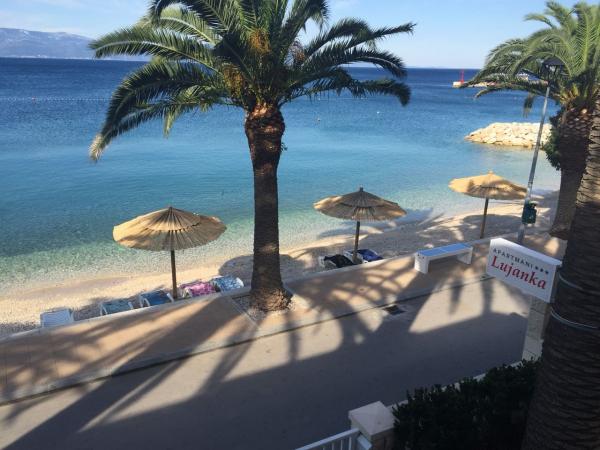 Plně vybavené apartmány a studio v samém centru Gradacu, nacházející se v první řadě u moře. Pláž, obchod, restaurace a bankomat jsou vzdáleny pouhé 3 metry. Nádherný výhled, přirozený stín palem a šumění moře poskytují jedinečný zážitek z Jadranu. Check-in do apartmánu v den rezervace je po 15:00 a check-out v den odjezdu je do 9:00. Cena zahrnuje pobytovou daň, parkování, které je 100 m od domu, klimatizaci (10 hodin denně) a bezdrátové připojení k internetu. Nabídku apartmánů mohou využívat pouze osoby registrované jako hosté Apartmánů Lujanka a případné návštěvy jsou možné pouze se svolením hostitele. Dodržování domovního řádu přispívá k příjemnému pobytu všech hostů a v případě nedodržování domovního řádu má hostitel právo zrušit další poskytování služeb hostovi. S náležitou úctou zdůrazňujeme, že domácí mazlíčci nejsou povoleni, protože si nemůžeme dovolit optimální podmínky. Cena ubytování až na 3 noci je o 30 % vyšší.