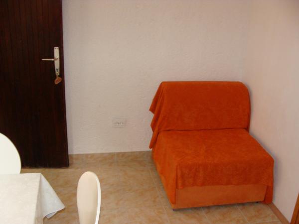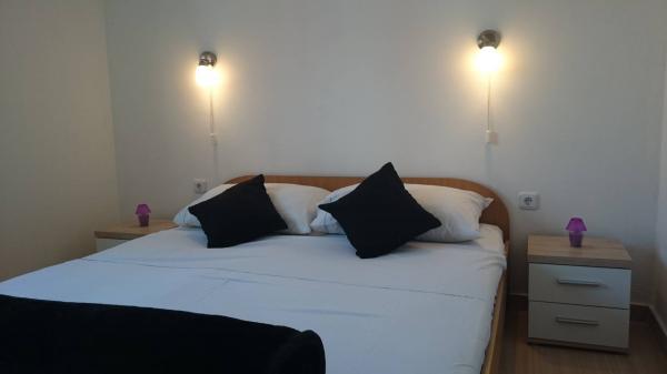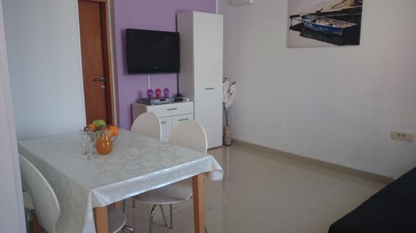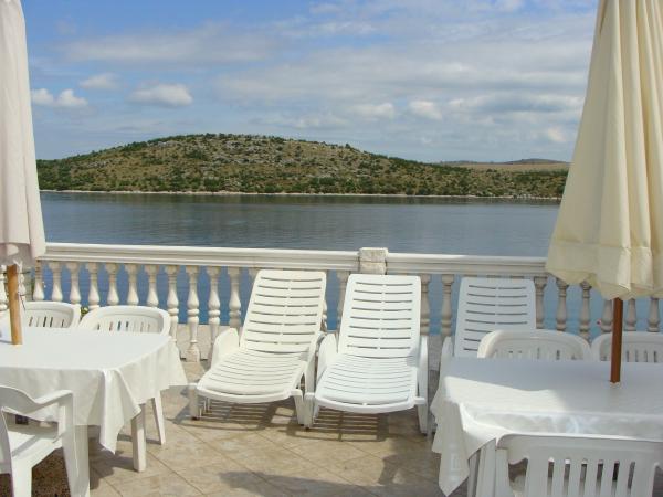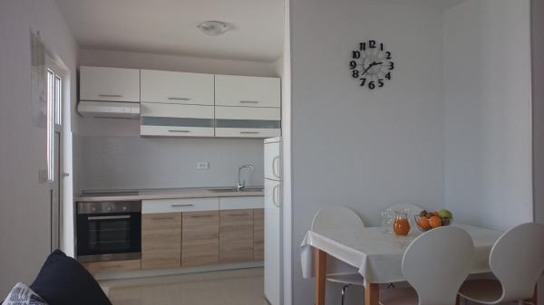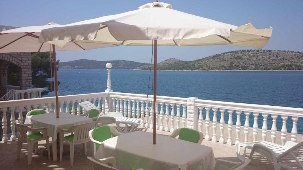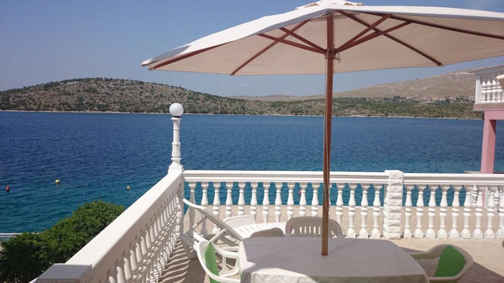 Apartmány 7 metrů od moře pro 7 - 8 osob na terase o rozloze 34 m2 s výhledem na moře. Apartmány mají kuchyň s kuchyňským a servírovacím nádobím, obývací pokoj s rozkládací pohovkou pro relaxaci nebo spaní, satelitní TV, klimatizaci, přístup k internetu, 3 ložnice (2 dvoulůžkové pokoje a 1 třílůžkový pokoj) s ručníky a ložním prádlem, přistýlku, koupelnu se sprchou, toaletou a pračkou, gril. Na terase je zahradní nábytek pro 8 osob, lehátka, 2 kola, parkování, pláž je 7 metrů od apartmánu. Máme mobilní supermarket (minibus), který nás zásobuje základními potřebami před apartmánem. Toto je ideální místo pro dovolenou s dětmi, příbuznými nebo přáteli.