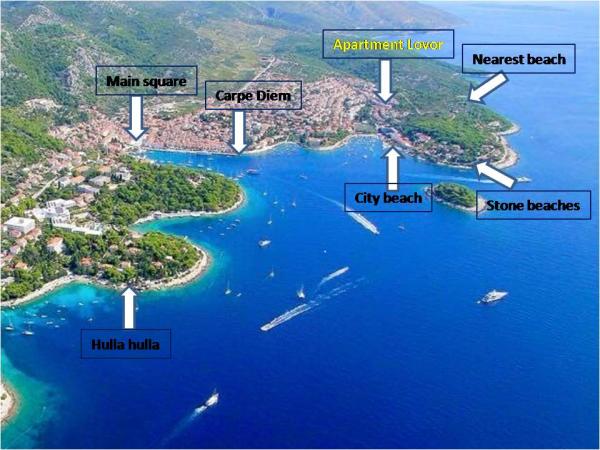 Nově zařízené apartmány se nacházejí v rodinném domě v klidné části města Hvar, 20 minut chůze od starého města. A1 (4 osoby) je v 1. patře s velkou terasou s výhledem na moře a nabízí nádherný západ slunce. A2 (4 osoby) je v přízemí na oploceném dvoře s možností posezení před ním. Každý apartmán má jednu ložnici a rozkládací lůžko v obývacím pokoji. Parkování je zdarma, stejně jako služba WiFi. Nejbližší přírodní oblázková pláž je v zátoce 200 metrů od hotelu a dostanete se pěšky. Druhá městská pláž, oblázková a skalnatá, je vzdálená 10 minut chůze. Ubytování je vhodné pro rodinnou dovolenou, je bezpečné pro děti (plot) a je vítána společnost až pro 8 osob. Na Hvar se dostanete katamaránem přímo ze Splitu (1 hodinu jízdy) nebo trajektem (2 hodiny jízdy) přes Staré Město, odkud místní autobus (20 minut jízdy) do centra Hvar. Nejbližší letiště je ve Splitu. Katamarány také jezdí na Korčulu, Mljet a Dubrovník.