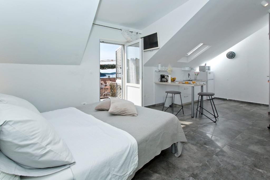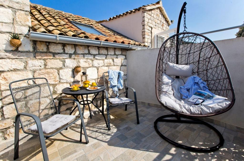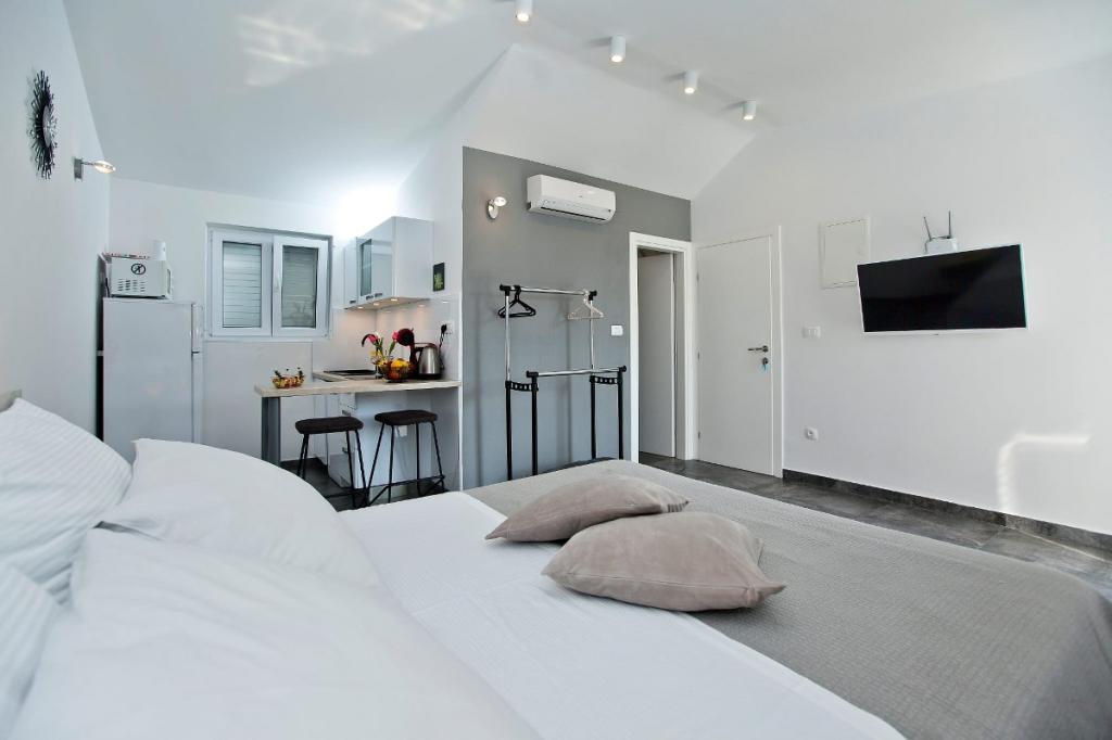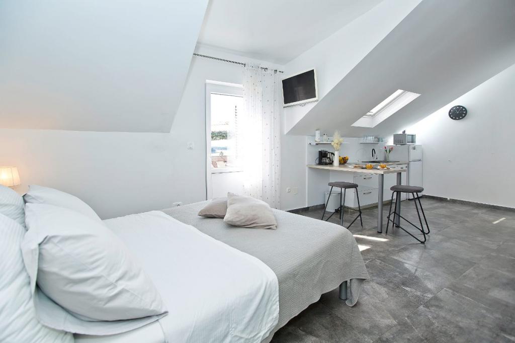 Elegantně zařízené studiové apartmány, které se nacházejí v samém centru města Hvar, nabízejí perfektní kombinaci pohodlí a vynikající polohy. Apartmány jsou světlé a moderní, vybavené pohodlnou manželskou postelí (160 × 200), plně vybavenými kuchyněmi se vším potřebným vybavením (lednička s mrazákem, rychlovarná konvice, toustovač, varné plotýnky, mikrovlnné trouby, myčky nádobí), koupelnami se sprchovým koutem, klimatizací a oběma soukromými terasami (venkovní stůl, židle a lehátka) s fascinujícím výhledem na staré město a krásný hvarský přístav. Zažijte to nejlepší z Hvaru doslova na prahu: okouzlující kavárny, špičkové restaurace, útulné snídaňové podniky, místní butiky a obchody se suvenýry. Hlavní náměstí s katedrálou sv. Štěpána a nejstarším veřejným divadlem v Evropě jsou jen 3 minuty chůze od vašich dveří. Budete bydlet v samém centru Hvaru, přesto v dokonale odlehlé ulici, která vám zajistí klidný a příjemný noční spánek.