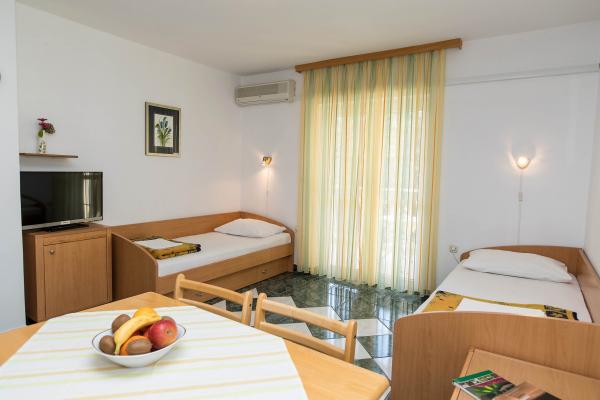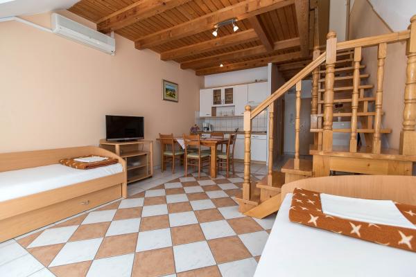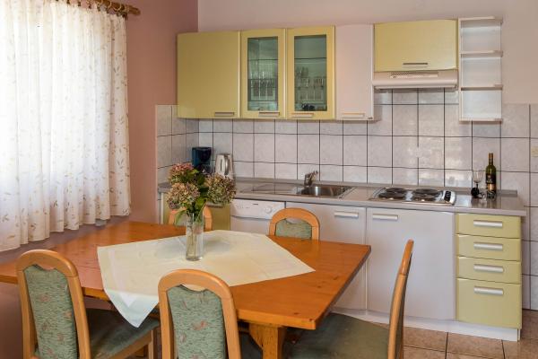 Krásné prostředí, úhledný byt, přátelští hostitelé, pláž je trochu dál, pokud si vyberete s malými kamínky, a pokud se chcete koupat mezi loděmi, je to asi 800 m