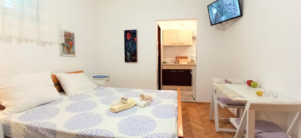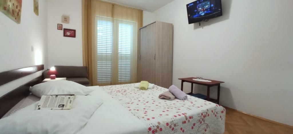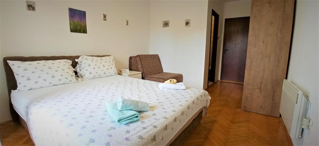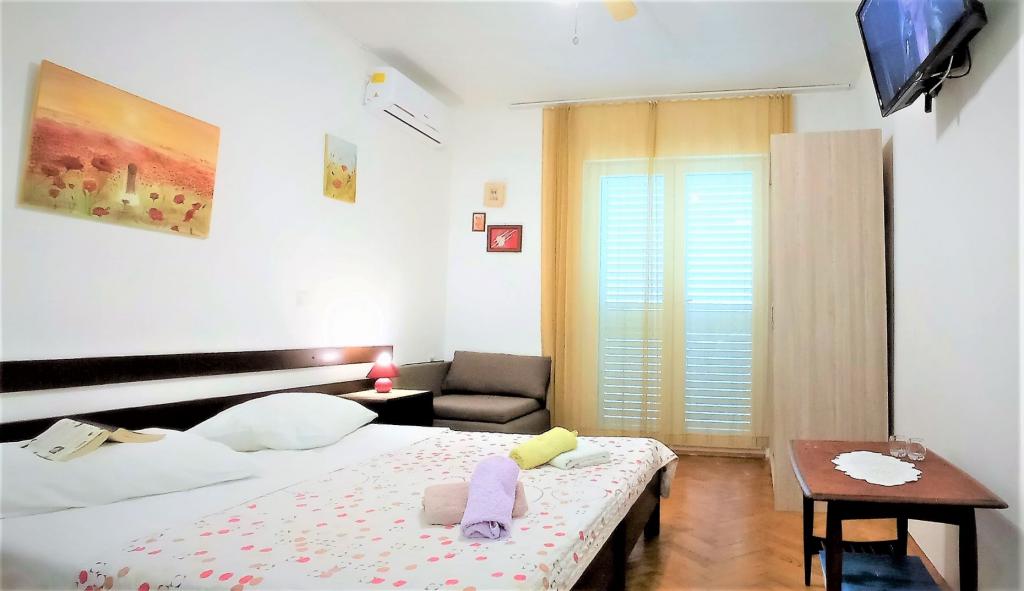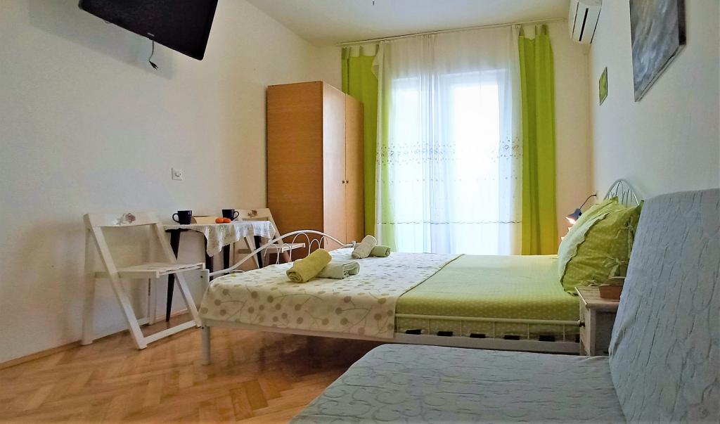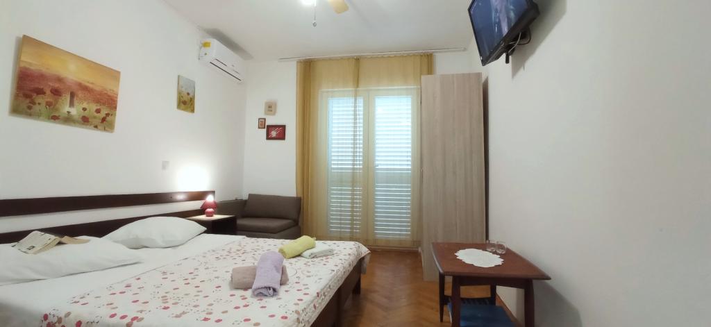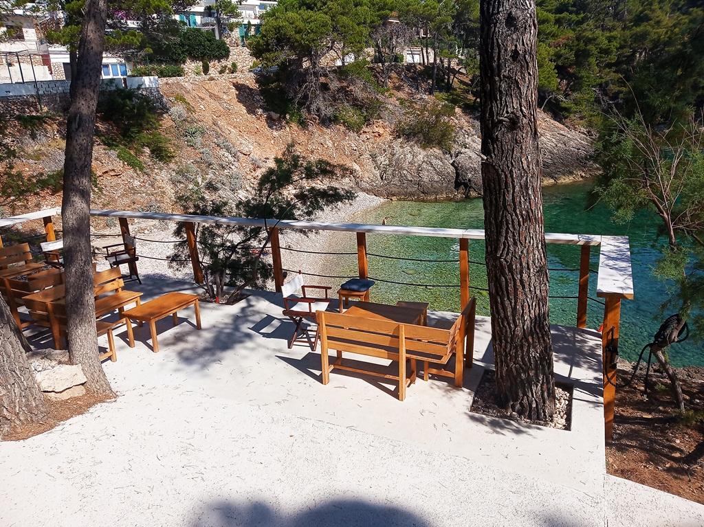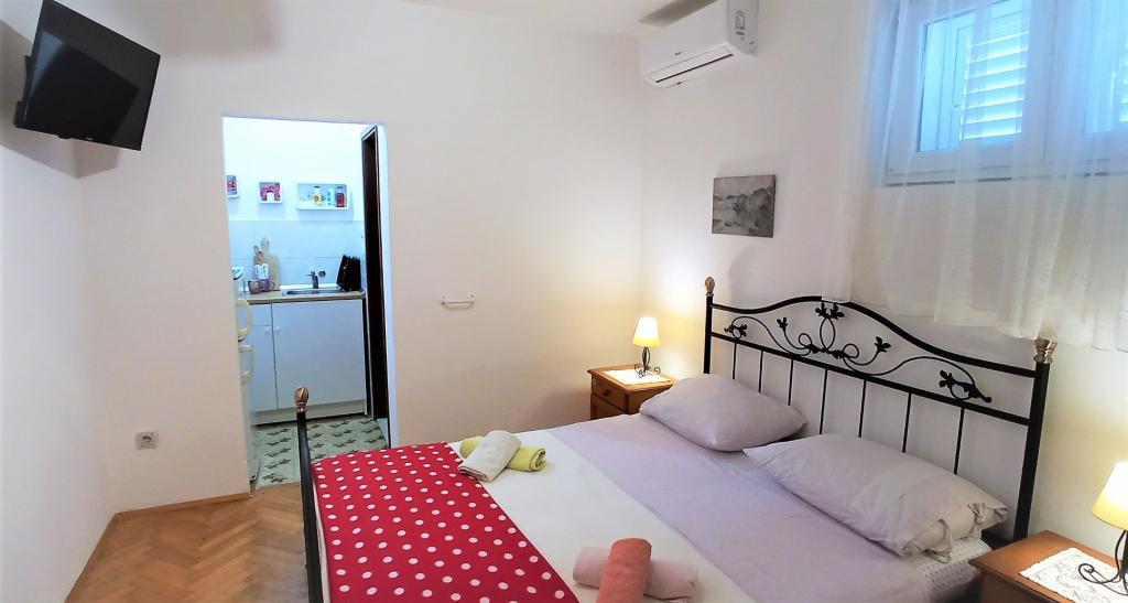 70 metrů od moře. Apartmány se nacházejí mezi Jelsa a Vrboska, ostrov Hvar, na klidném místě s několika oblázkovými plážemi a jednou písečnou pláží poblíž. V našem domě nabízíme 3 studio apartmány. Každý apartmán má ložnici, koupelnu a kuchyňský kout a stůl a židle v přední části bytu vedle zahrady. Studio apartmán 3 má velkou terasu 2 pokoje. Každý z nich má vlastní WC, kuchyň a balkon se stolem a židlemi a výhledem na moře. Je také možné si pronajmout obě místnosti jako apartmán protože mají jeden společný vchod, který je oddělen od ostatních bytů VelkýApartmán -AP4 má dvě ložnice, velká kuchyň s jídelnou a obývacím pokojem, dvě koupelny. Každý pokoj má postel pro dvě osoby. Jeden z pokojů má také přistýlku a balkon s stůl a židle pro 2 osoby. Z balkonu je výhled na moře. V obývacím pokoji se nachází LCD TV a pohovka, která může být rozšířena na postel pro 2 osoby. V přední apartmánu, mezi olivový strom je terasa se stolem a židlem