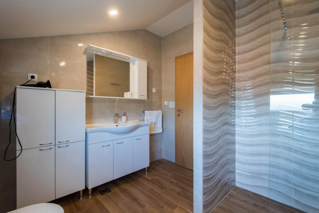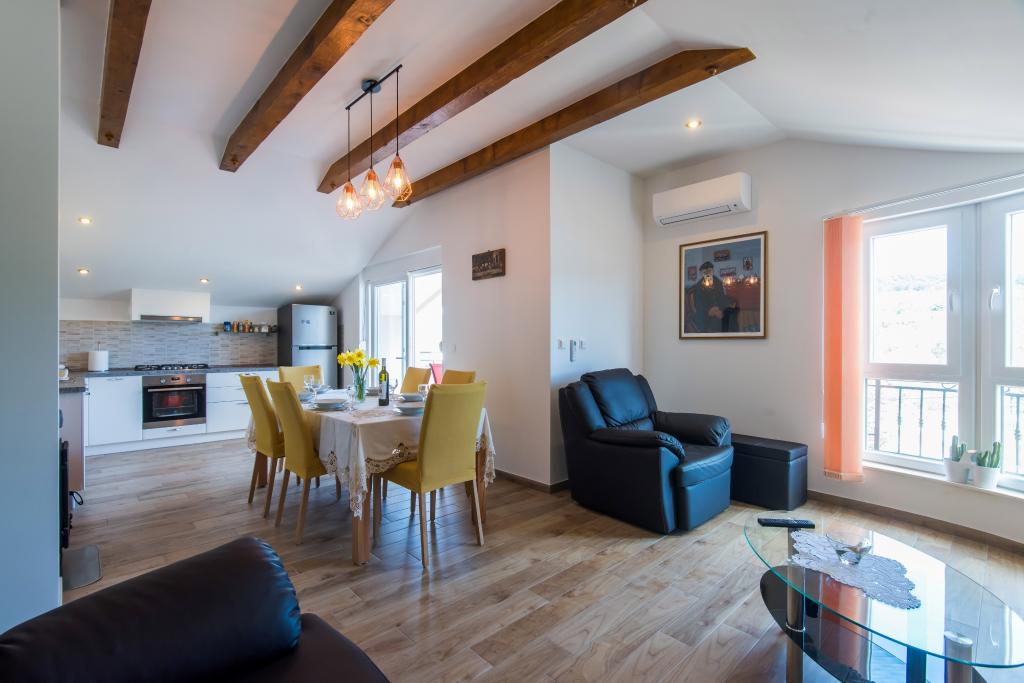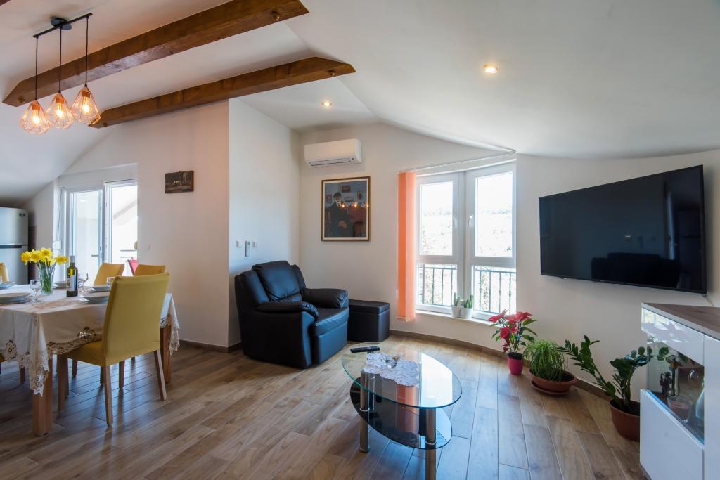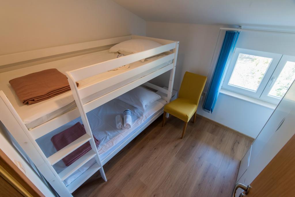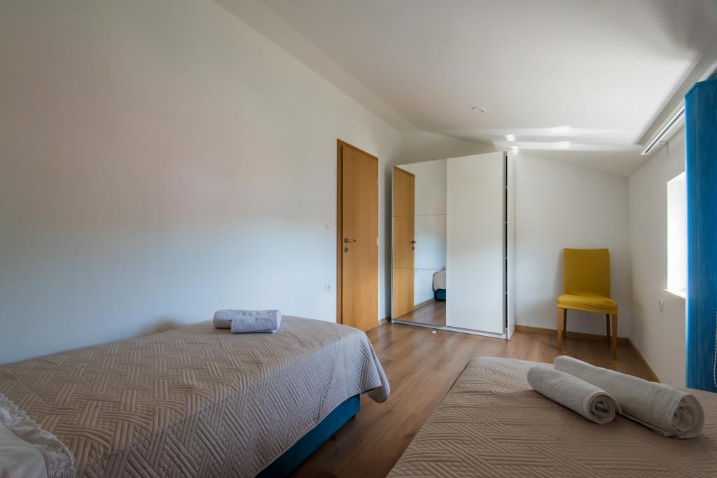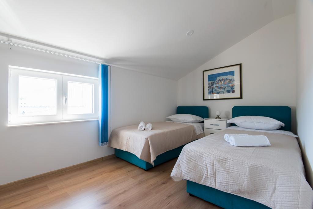 Apartmány jsou v prvním patře domu, který se nachází v zátoce Lamjana v klidném prostředí u moře, moderní a plně zařízený. Byt 2 má jednu ložnici s manželskou postelí a velkou pohovkou v kuchyni s východem na balkon, kde nábytek, koupelna se sprchovým koutem. Apartmán 1 má dvě ložnice a přistýlkou v kuchyni, koupelna se sprchovým koutem, na balkóně nábytku. Centrum města je cca 900 m. Ve dvoře je gril, který je k dispozici pro naše hosty.