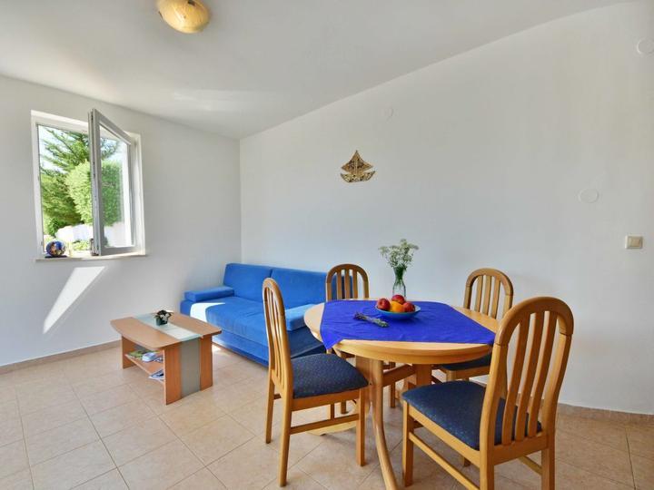 Ribarica 4 km od Karlobag: Moderní bytový dům. V přírodním parku Velebit. Slunné místo na svahu, 90 m od moře, 90 m od pláže. Společné: obdélníkový bazén (8 x 4 m, hloubka 140 cm, s vnitřním schodištěm, venkovní sprcha, terasa, zahradní posezení, gril, dětské hřiště, parkování na pozemku, obchod 350 m, oblázková pláž 90 m.