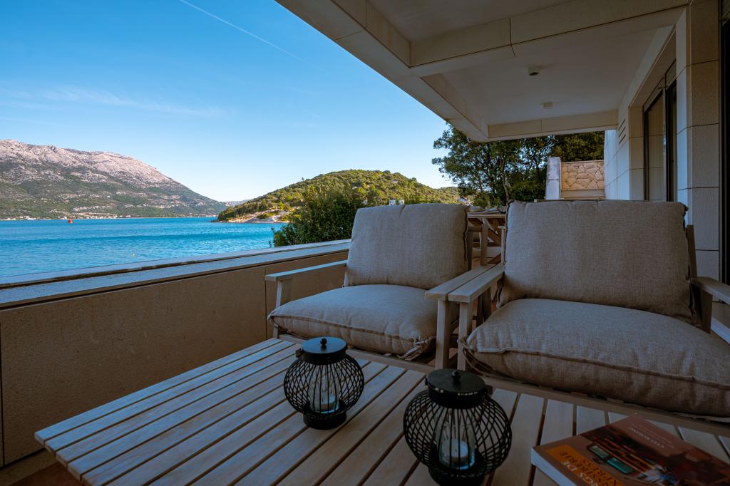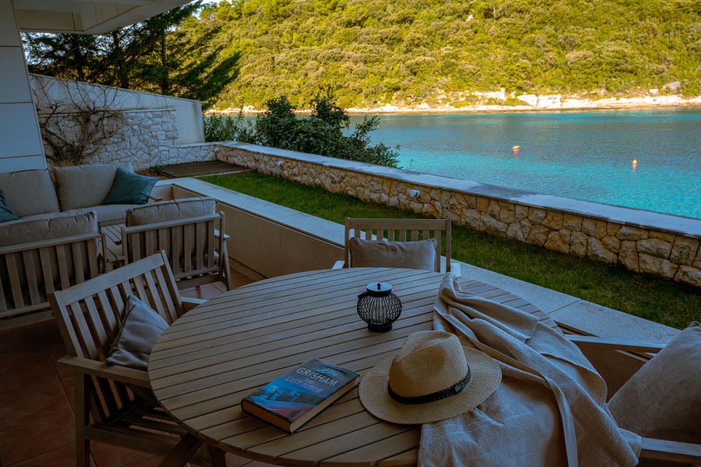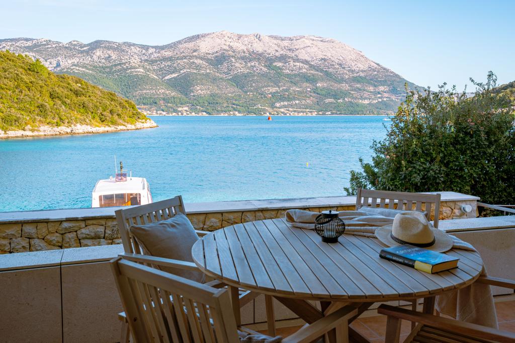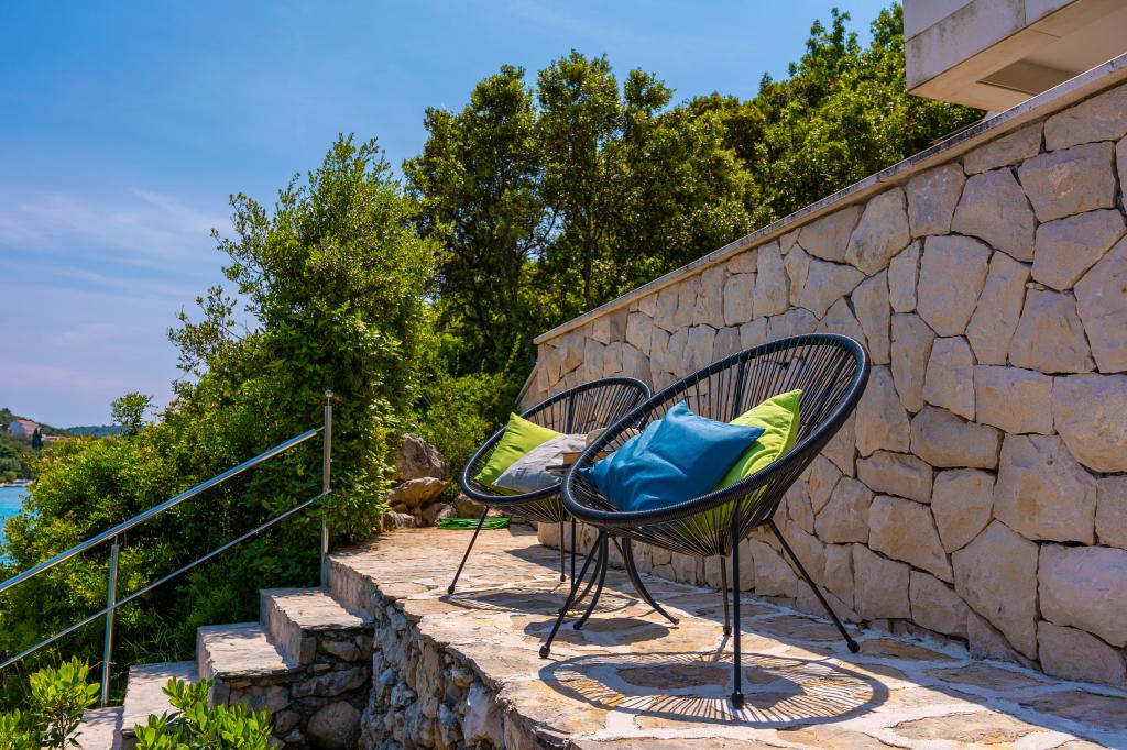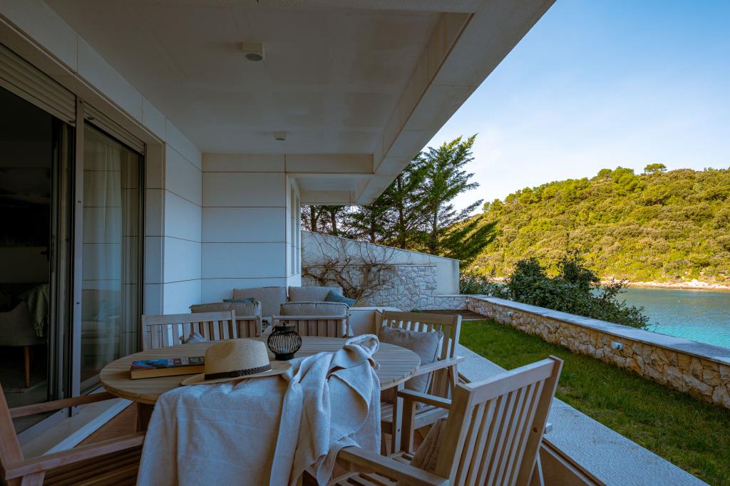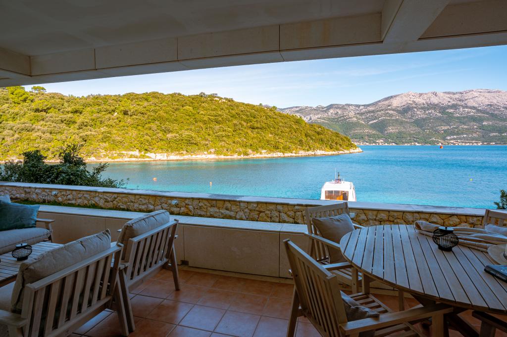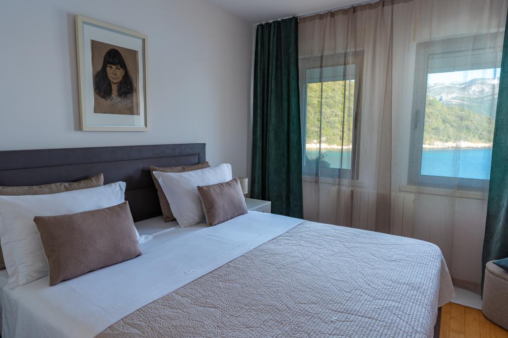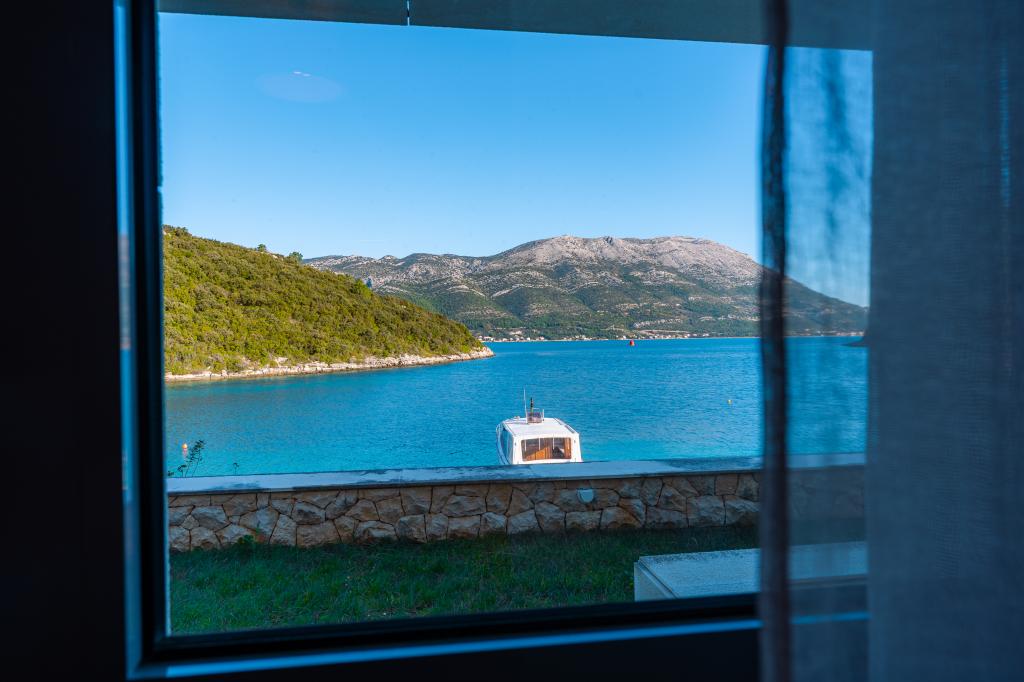 Villa Avantgarde - apartmán přímo u moře pro 4 osoby - velmi klidná zátoka - ostrov Korčula - Chorvatsko Je dílem slavného chorvatského a světově uznávaného architekta. Nachází se v klidné zátoce, cca. 4 km od centra města. Ve vile máte k dispozici pohodlný apartmán o velikosti cca. 100 m2, který se skládá ze 2 ložnic, koupelny a obývacího pokoje s dobře vybavenou kuchyní, jídelnou a obývacím pokojem, ze kterého je vstup na prostornou terasu s přímým vstupem na soukromou pláž. Pláž je 9 m od apartmánu. Ve vile je k pronájmu pouze jeden byt. Obklopují ho upravené trávníky, zeleň, ptačí zpěv a moře. Hostům je k dispozici uzavřené soukromé parkoviště. Ložnice, obývací pokoj, jídelna a terasa jsou orientovány přímo na moře. Lze jej využívat po celý rok, jelikož je vybaven ústředním topením.